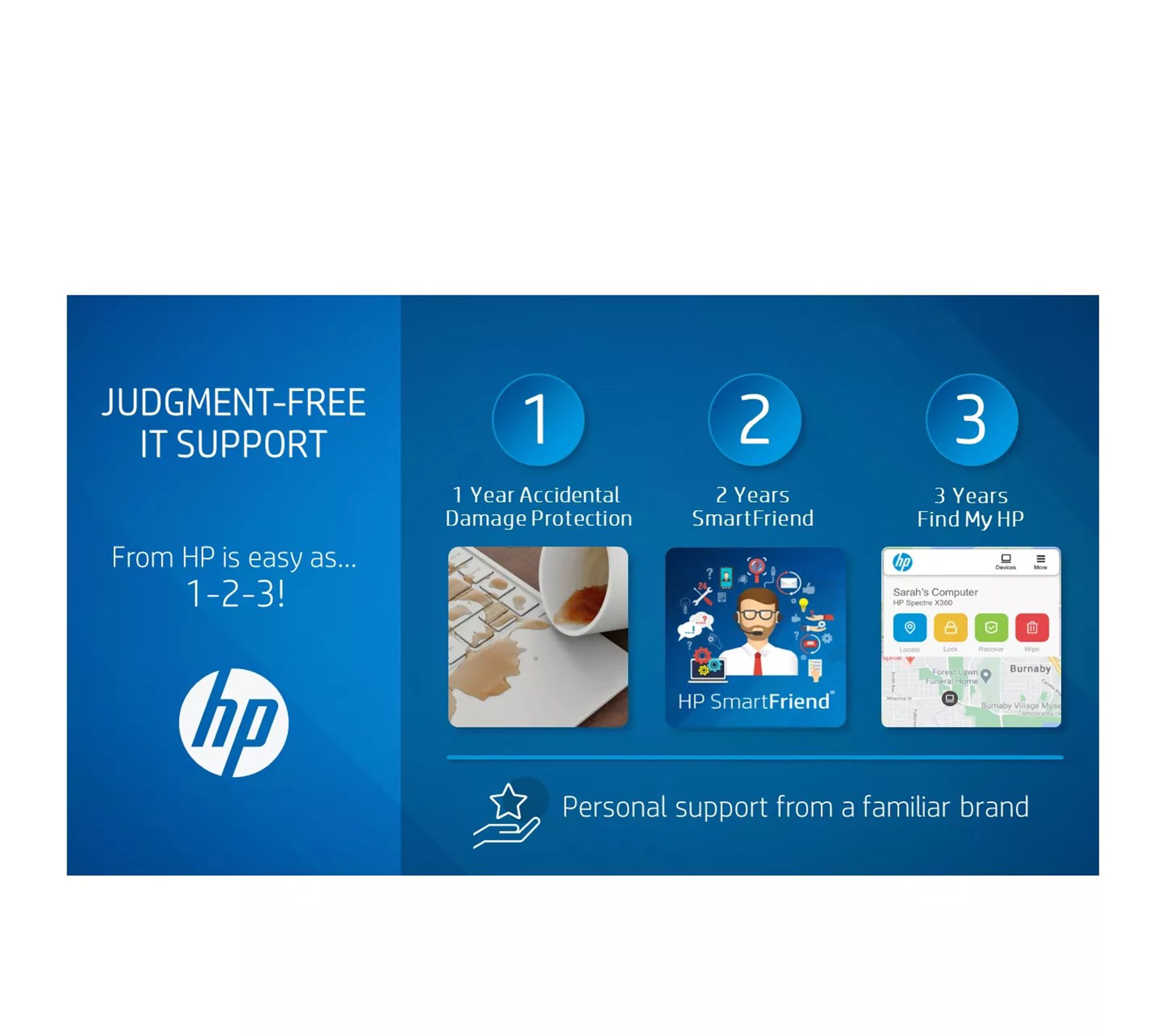UL listed; 1-year HP Accidental Damage Protection; 2-year HP SmartFriend support; 3-year Find My HP