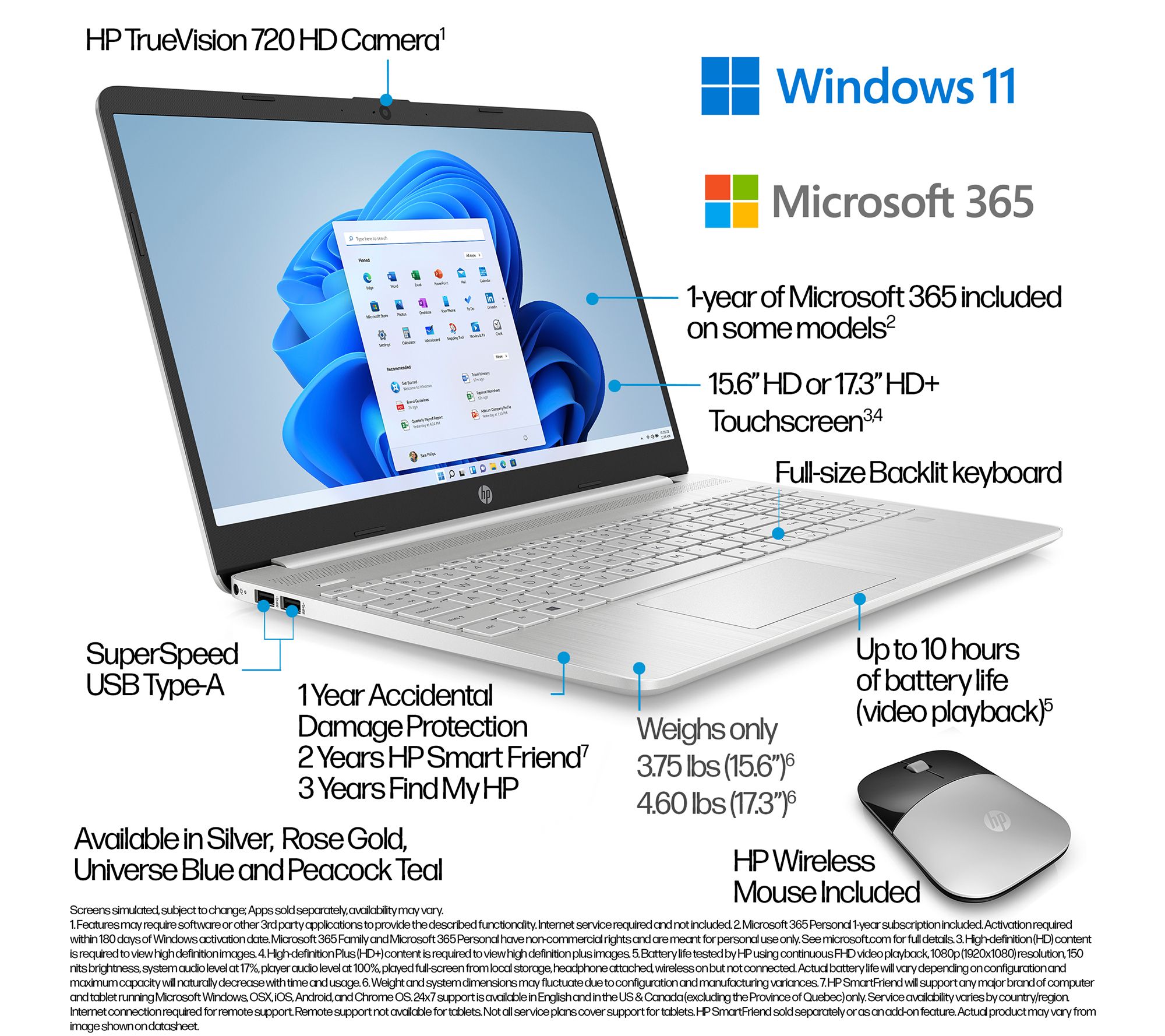 Psst. We're gonna let you in on a little secret. The fastest way to the top of their best-gift-ever list is with tech that's... fast -- like this HP 17-cn2001ds 17" touch laptop. This wow-worthy workhorse powers up like a dream, opens programs and apps in a flash, and is designed to keep up with you (and the whole crew) from sun up to sun down.Multitasker? You've got it made with Intel's latest 12th gen processor and 12GB RAM. Create, ideate, swipe, stream, and shop (QVC® of course!) seamlessly -- all at the same time. Featuring a robust Windows 11 operating system, this loaded laptop is built to keep you productive and connected -- tackle your to-do list, power through last-minute presentations, and video chat with co-workers, friends, or fam -- from anywhere.Store more of what you love with a 512GB SSD. From baby's-first-steps videos to 90th birthday party pics (and every moment in between), there's plenty of room to hold onto precious, heartwarming memories (with abundant space for downloading more cat videos and those watched-more-than-once '80s movies, too).Can't put your finger on your password? Now you literally can with a convenient fingerprint reader that effortlessly logs you into your laptop with a single tap (we'll be honest -- that's a pre-tty cool tool).Powerful, playful, and yeah, pretty too (check out those color choices), this HP laptop looks as good as it performs and makes life waaay more manageable than ever before. Check done off your list. From HP.Protecting your new investment is now easy as 1-2-3 with one year of HP Accidental Damage Protection, two years of HP SmartFriend (providing 24/7 over-the-phone support), and three years of Find my HP.