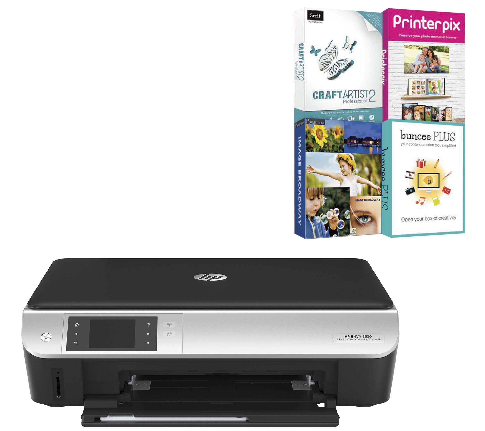 Includes HP Envy 5535 e-all-in-one wireless printer with one black and one tri-color ink cartridge, USB cable, and power cord; and Family Creativity Software Suite digital download