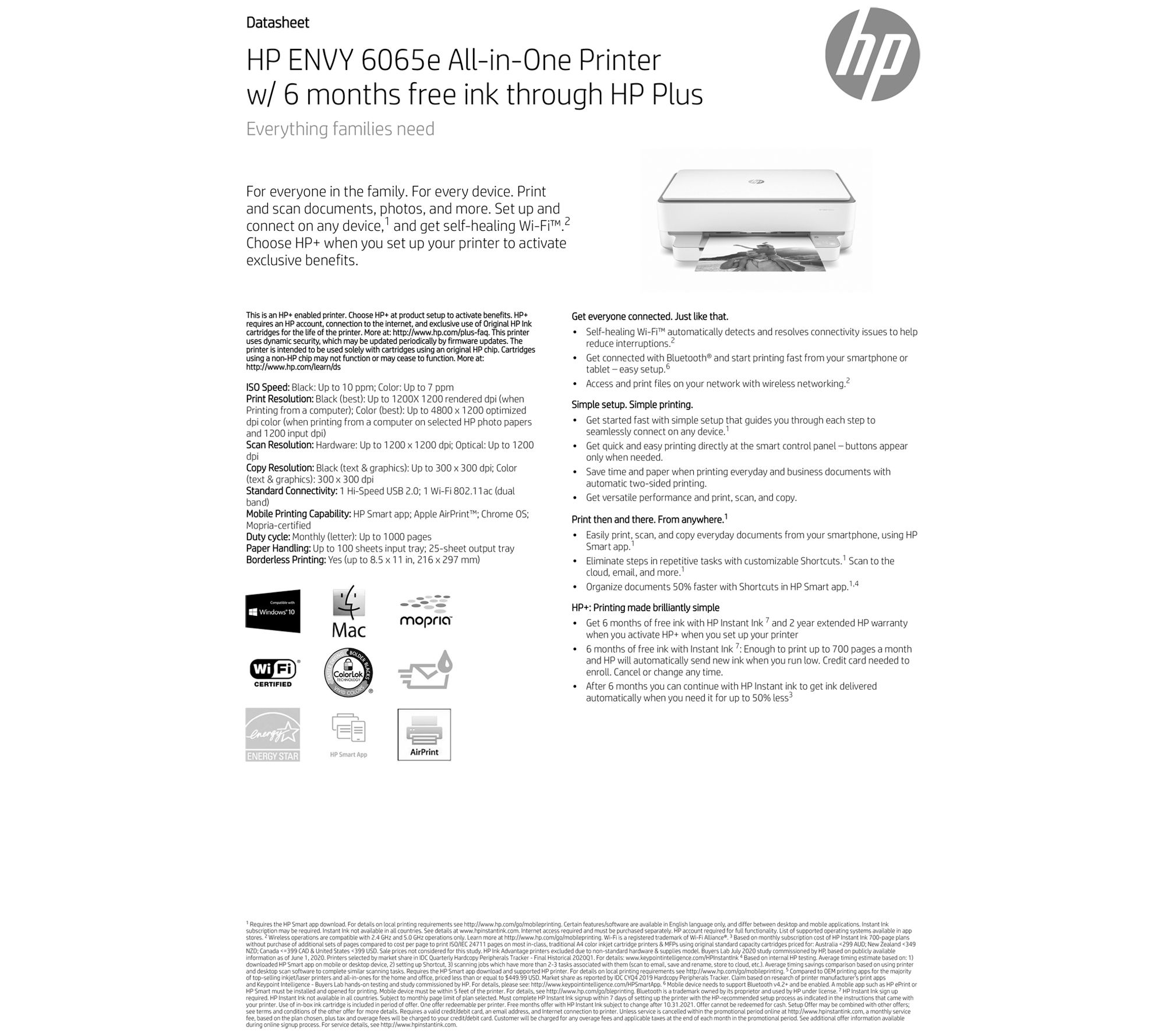 Get everyone connected. Just like that. The HP Envy 6065e all-in-one printer offers easy setup for everyone in the family so you can print, scan, and copy everything from your student's science worksheet to your teen's work application to your own business presentation (and don't forget about those vacation photos stashed on your phone!). From HP.