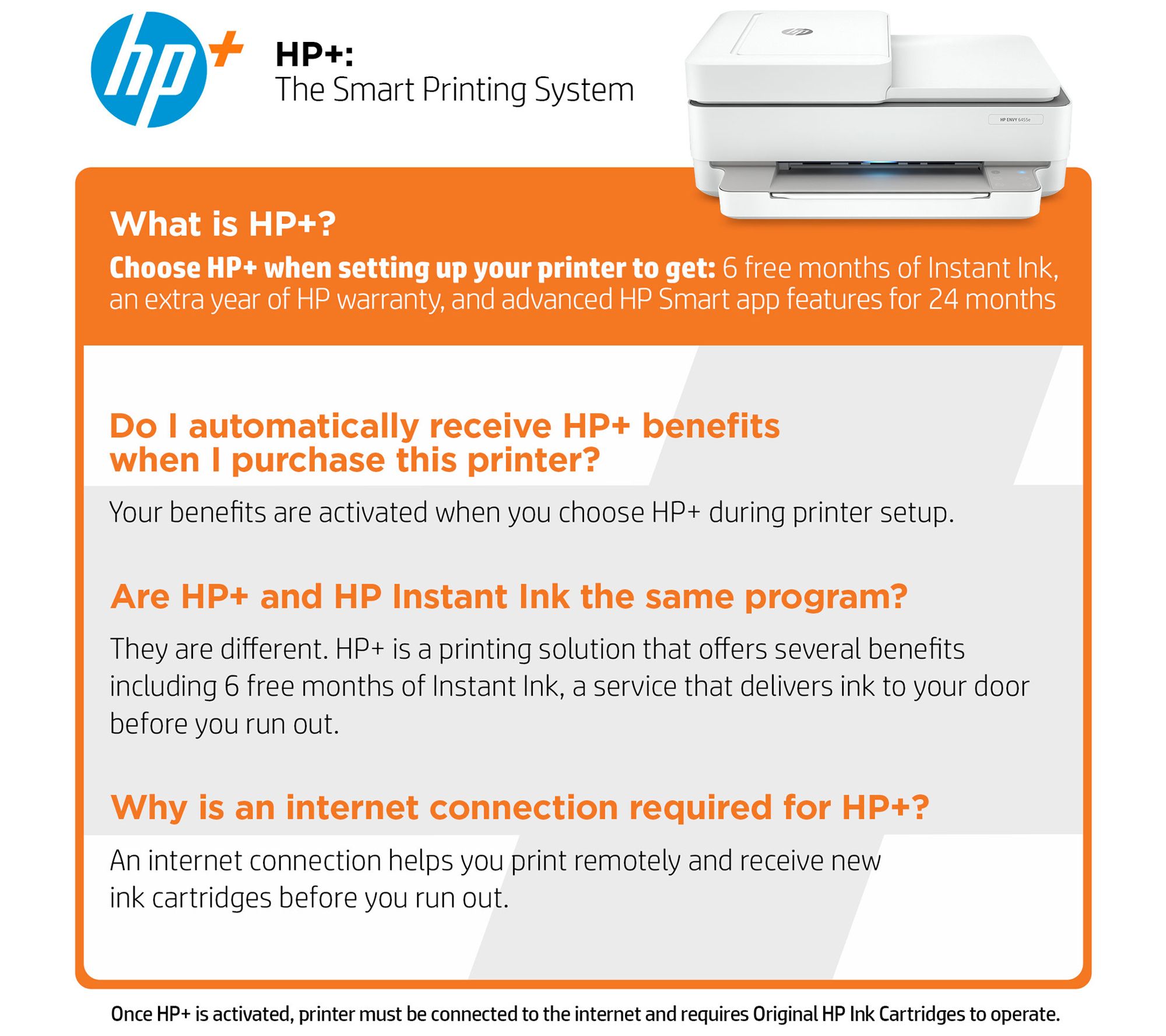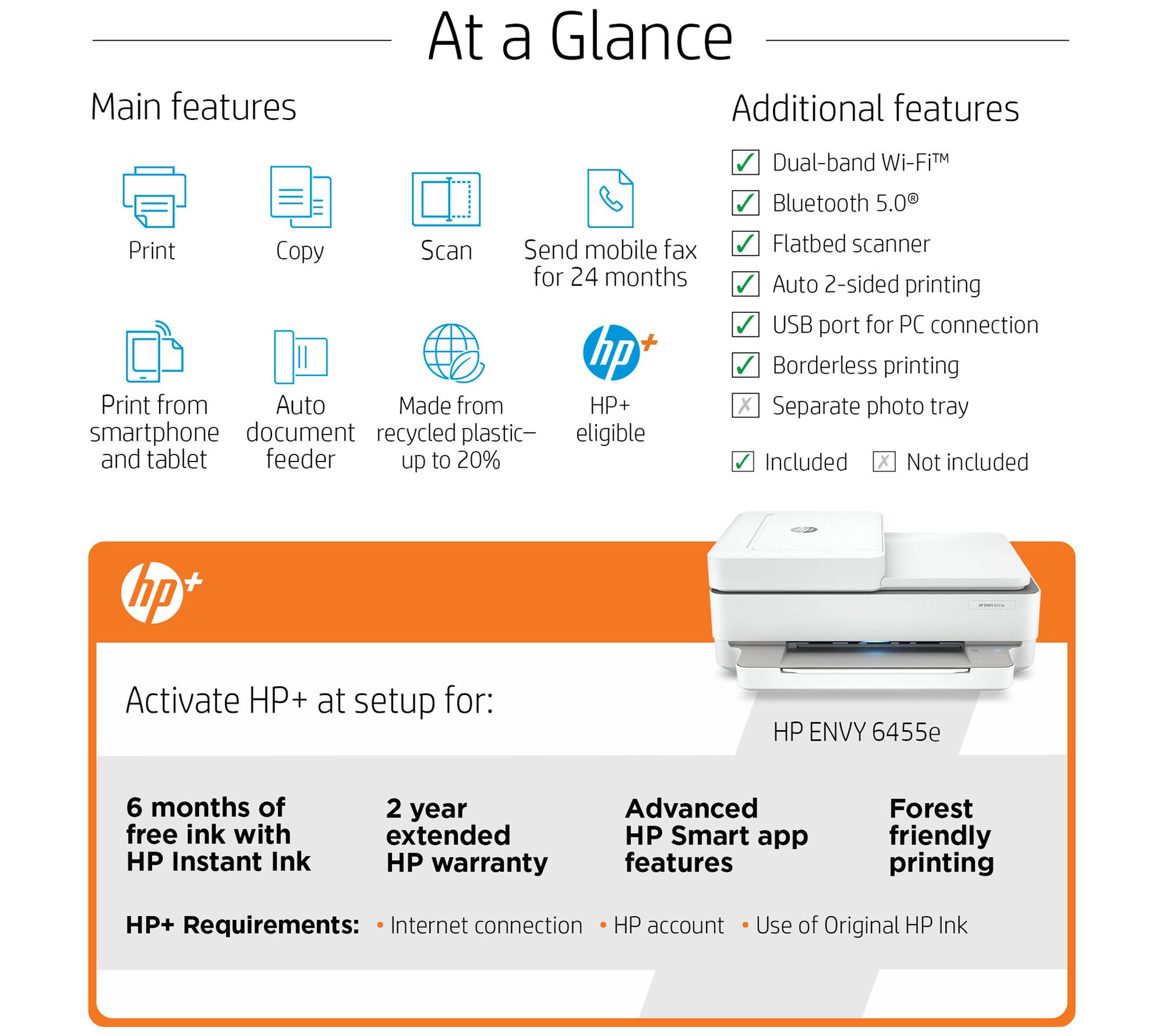 Includes ENVY 6455e all-in-one printer with HP 67 black and tri-color ink cartridges, and power cord; six months of HP Instant Ink