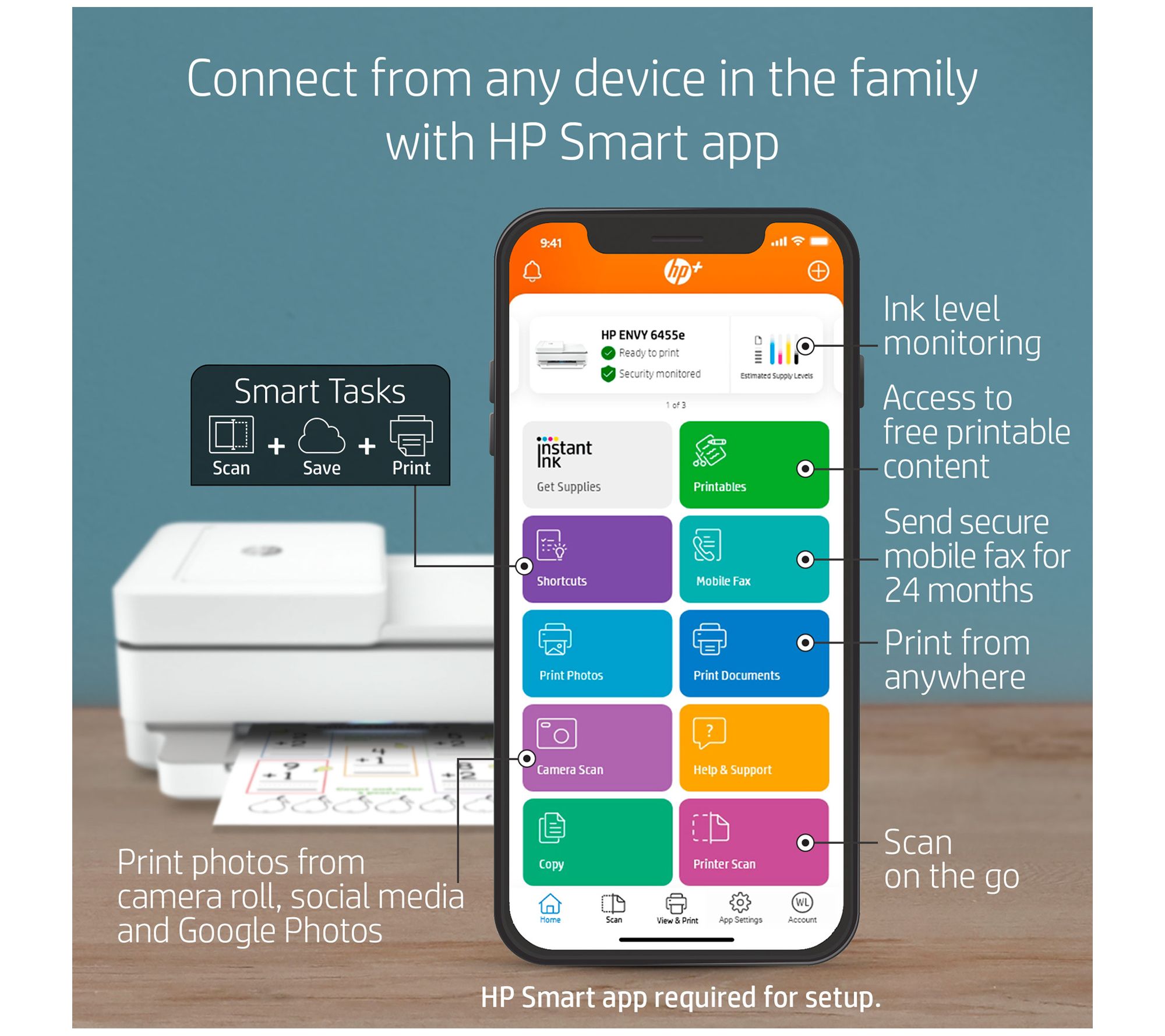 Loaded with everything, except complications, the HP ENVY all-in-one printer offers easy setup and effortless printing for everyone in the family. The HP ENVY 6455e prints, scans, and copies everyday documents, schoolwork, photos, and more. Set up and connect on most devices with the HP Smart app and go hands-free via Wi-Fi. From HP.