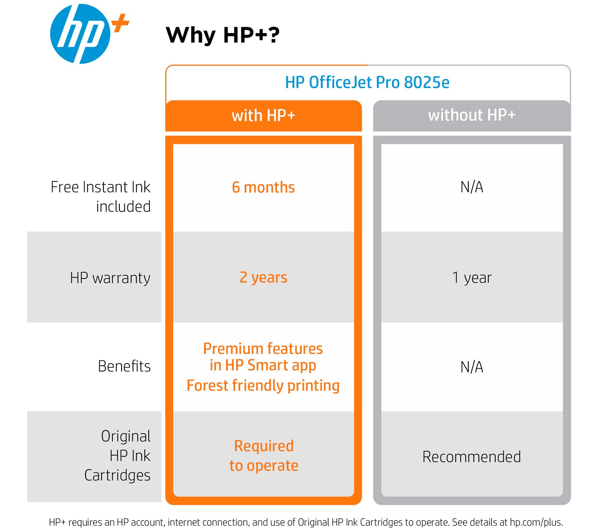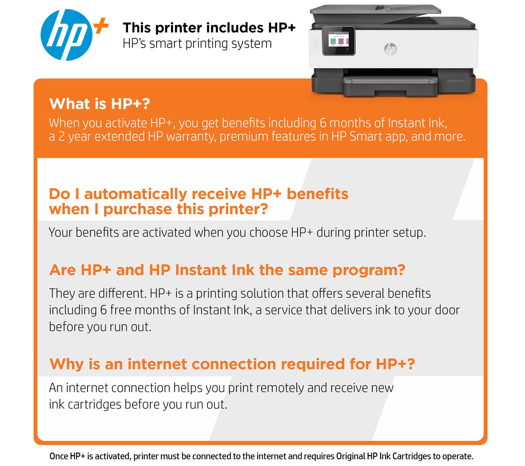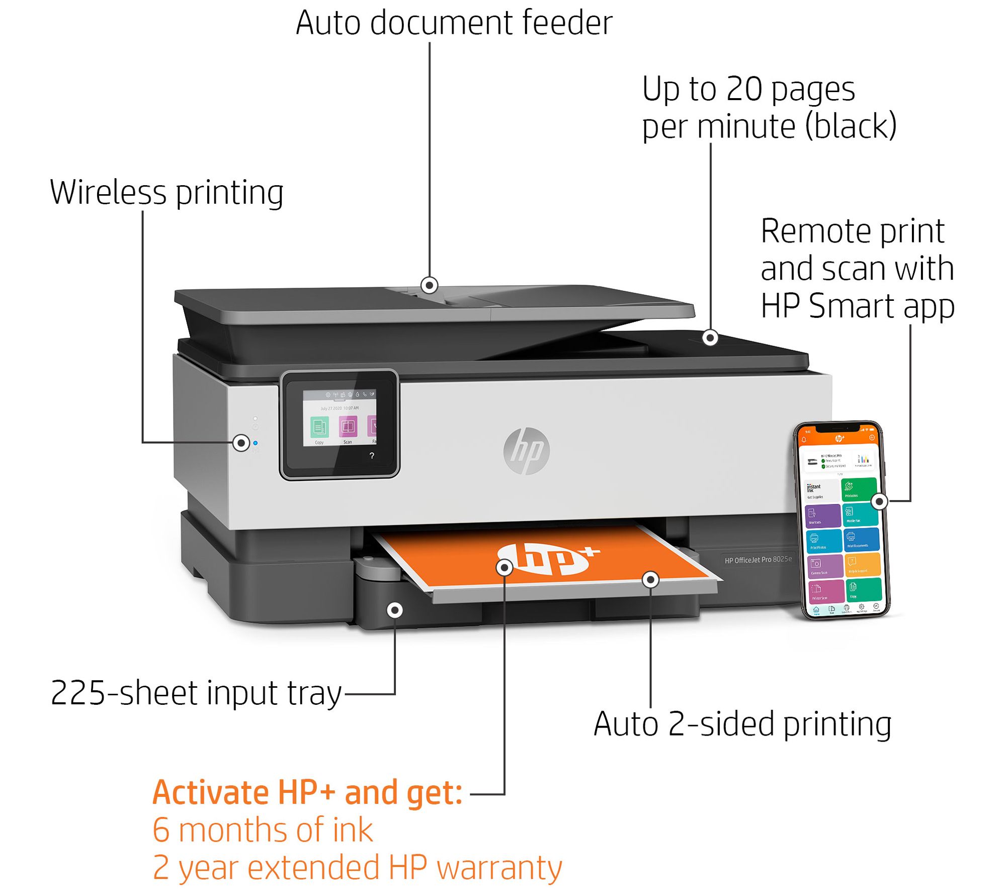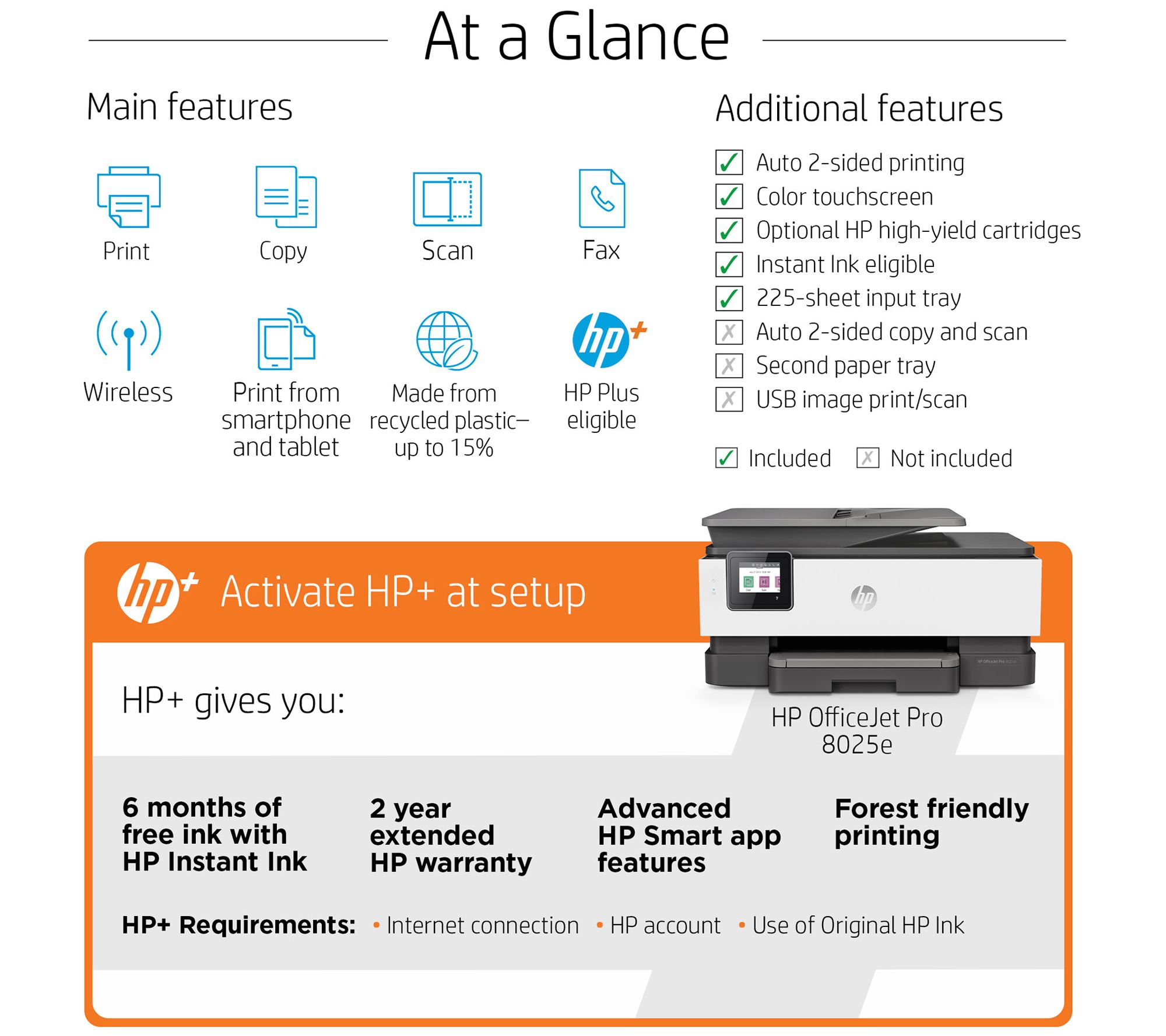 • Includes HP OfficeJet Pro 8025e all-in-one printer with HP 910 black, cyan, magenta, and yellow Instant Ink-ready cartridges, and power cord