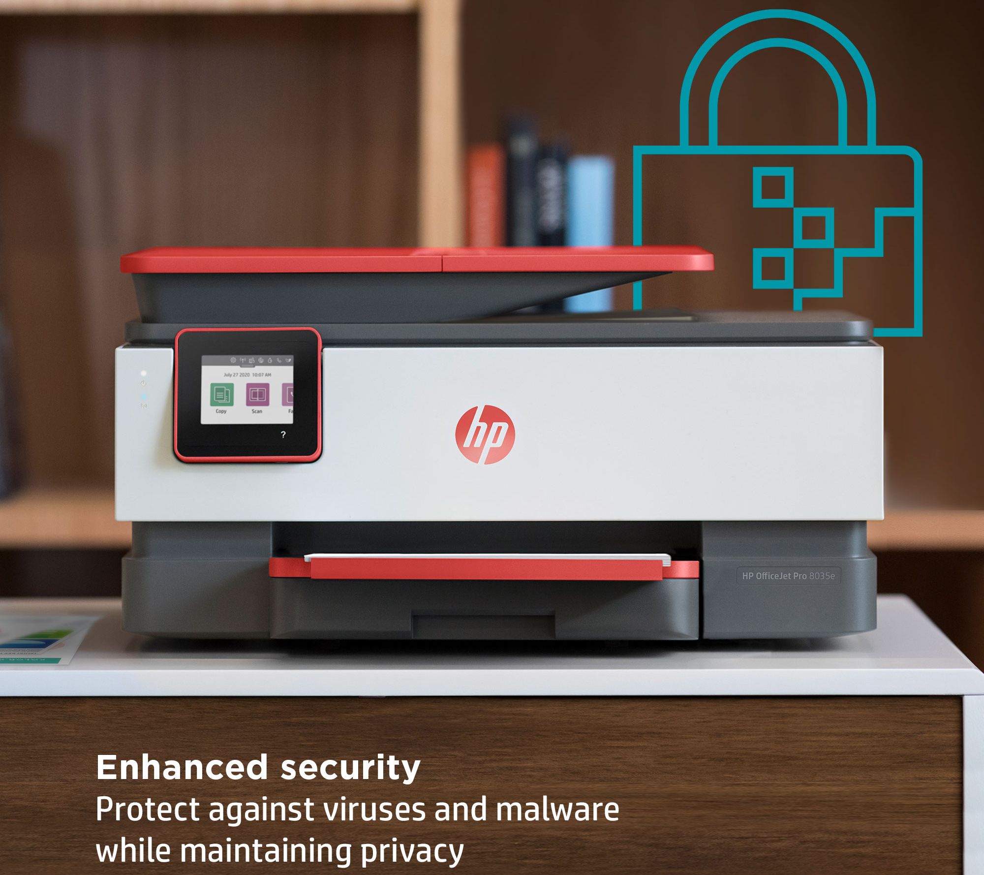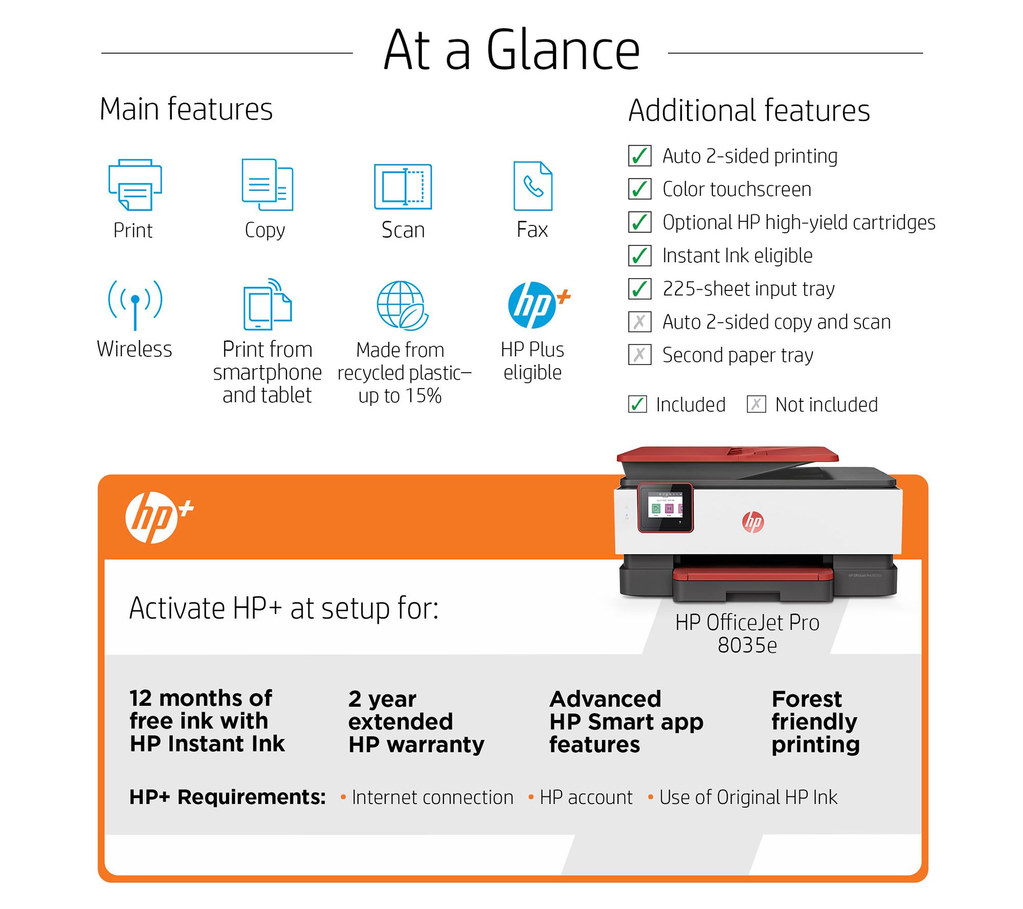 Includes HP OfficeJet Pro 8035e all-in-one printer with HP 910 black, cyan, magenta, and yellow Instant Ink-ready cartridges, and power cord; one year of HP Instant Ink