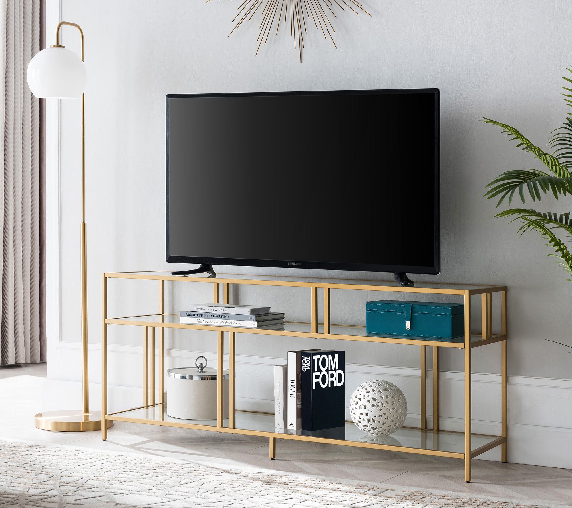 Clean lines and industrial accents bring a modern edge to living rooms or dens, setting the scene for game nights or movie marathons. Three tiers of sturdy glass keep electronics, gaming consoles, and decorative treasures organized and within easy reach. Style your favorite decor alongside your TV for an effortless, curated look. From Hudson&Canal.