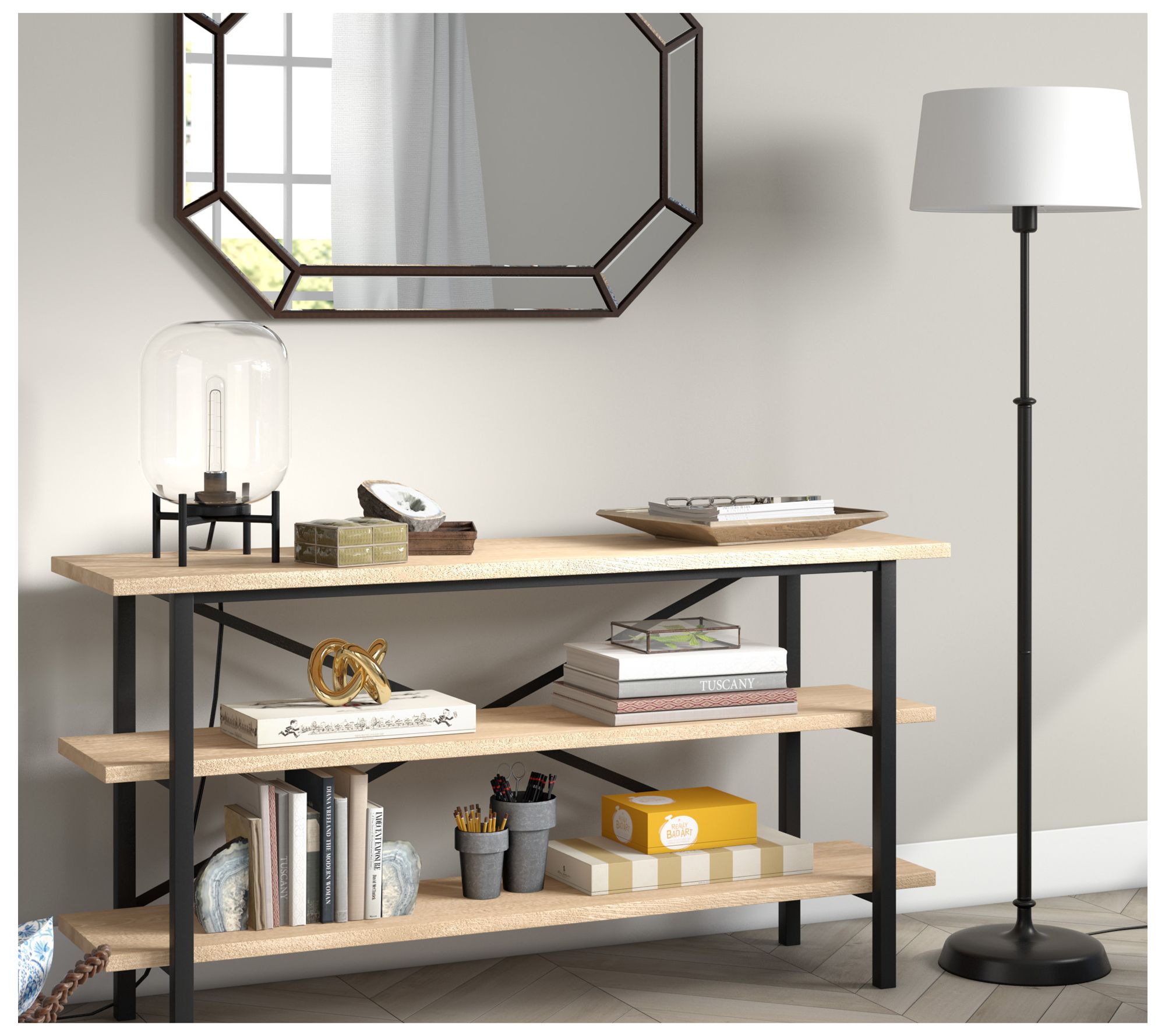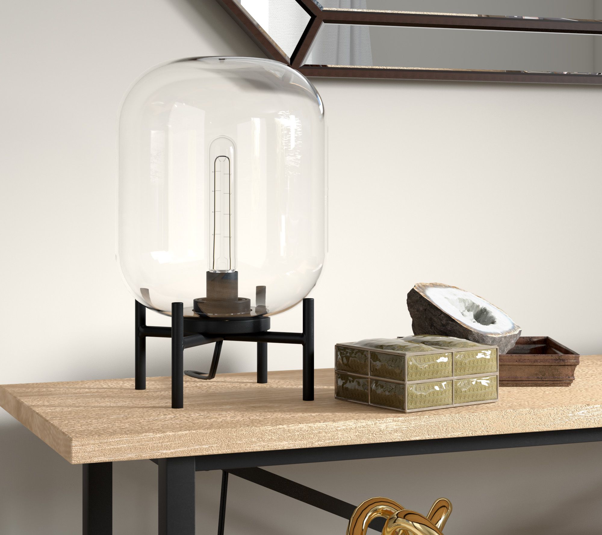 With its boldly defined lines and clear cylindrical glass shade, this lamp instantly creates an eye-catching focal point on a side table or desk. The industrial-inspired design pairs well with modern, farmhouse, or loft-style spaces -- think of it casting a warm glow next to your favorite reading nook or as a striking accent on your nightstand. From HudsonCanal.