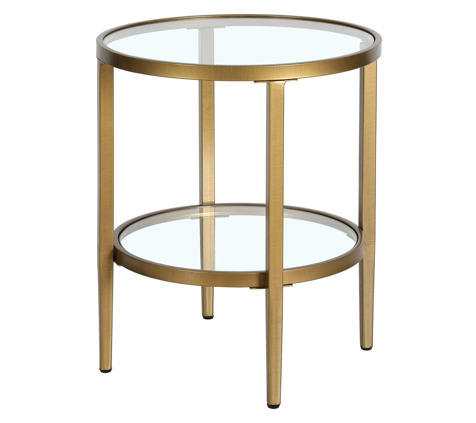 Friends gathering for movie night or a peaceful afternoon with your favorite book -- this round side table serves as a chic centerpiece for any occasion. Transparent tempered glass shelves offer a spot for lamps, remotes, or decor, while its Hollywood glam design seamlessly suits a range of interiors. Practicality meets style for both everyday living and special moments. From HudsonCanal.