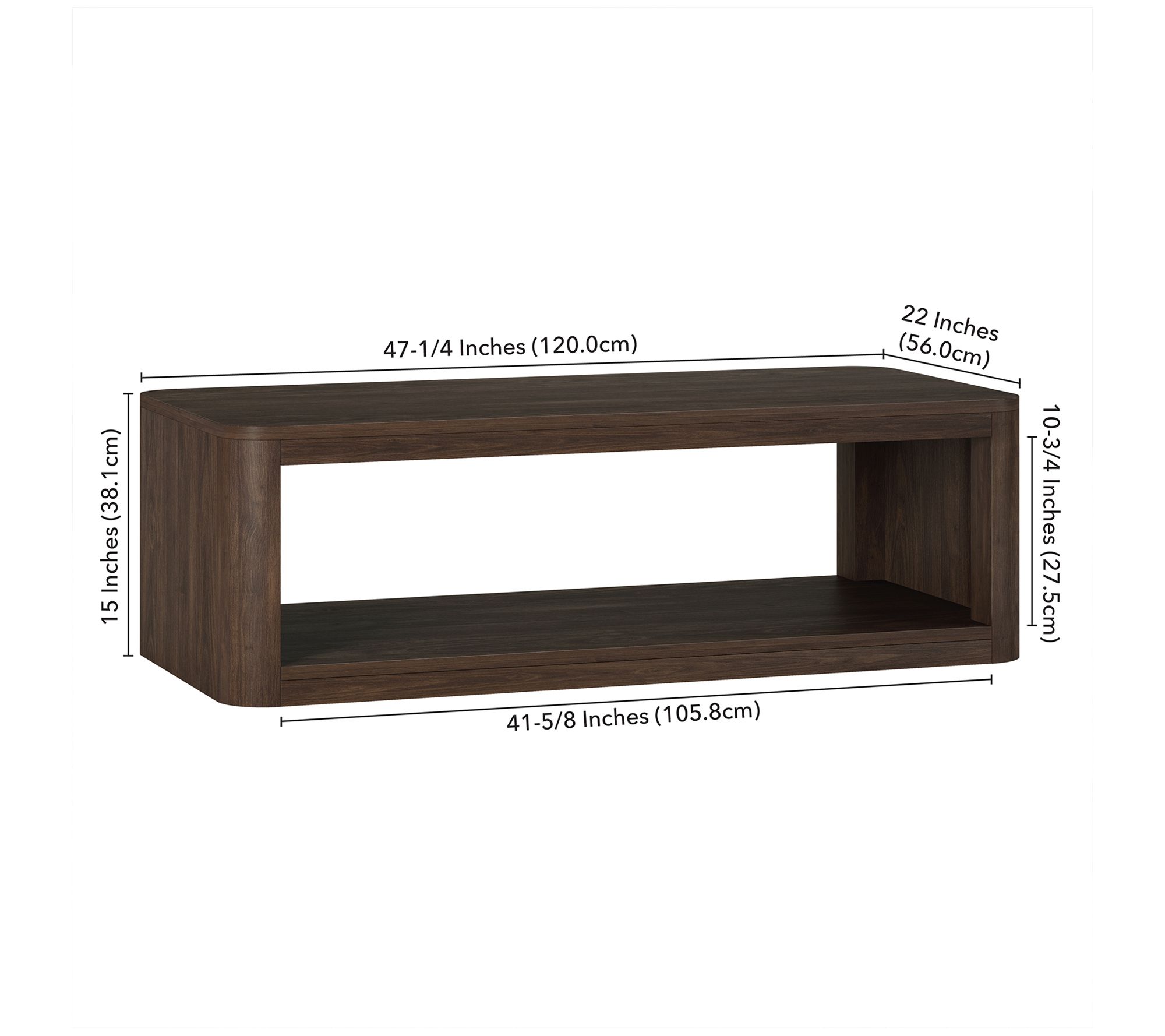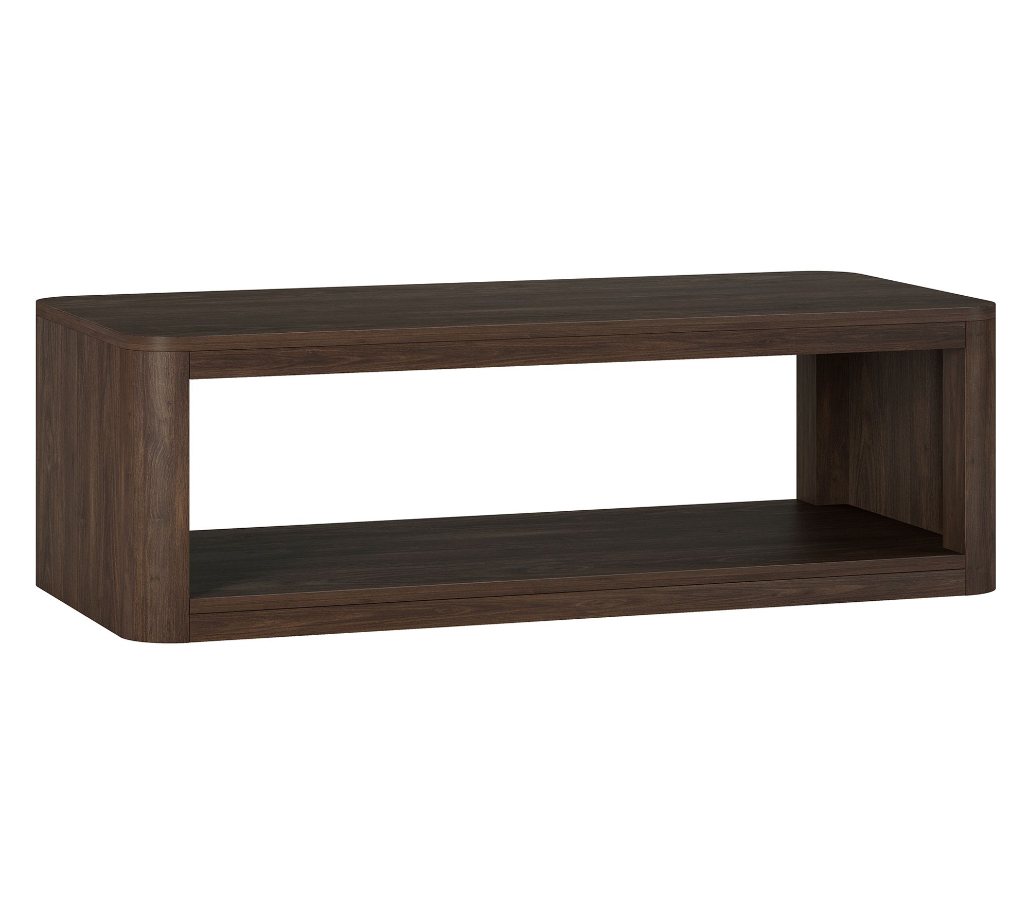 Clean lines and a practical silhouette bring a modern vibe to any gathering space, whether you're hosting friends for coffee or simply displaying your favorite books and a tray of candles. The contrasting finishes highlight its smooth tabletop and shelf, while rounded edges offer a soft, on-trend touch that blends with your decor. Use the open storage below for magazines, games, or baskets to keep daily essentials within reach. From Hudson&Canal.