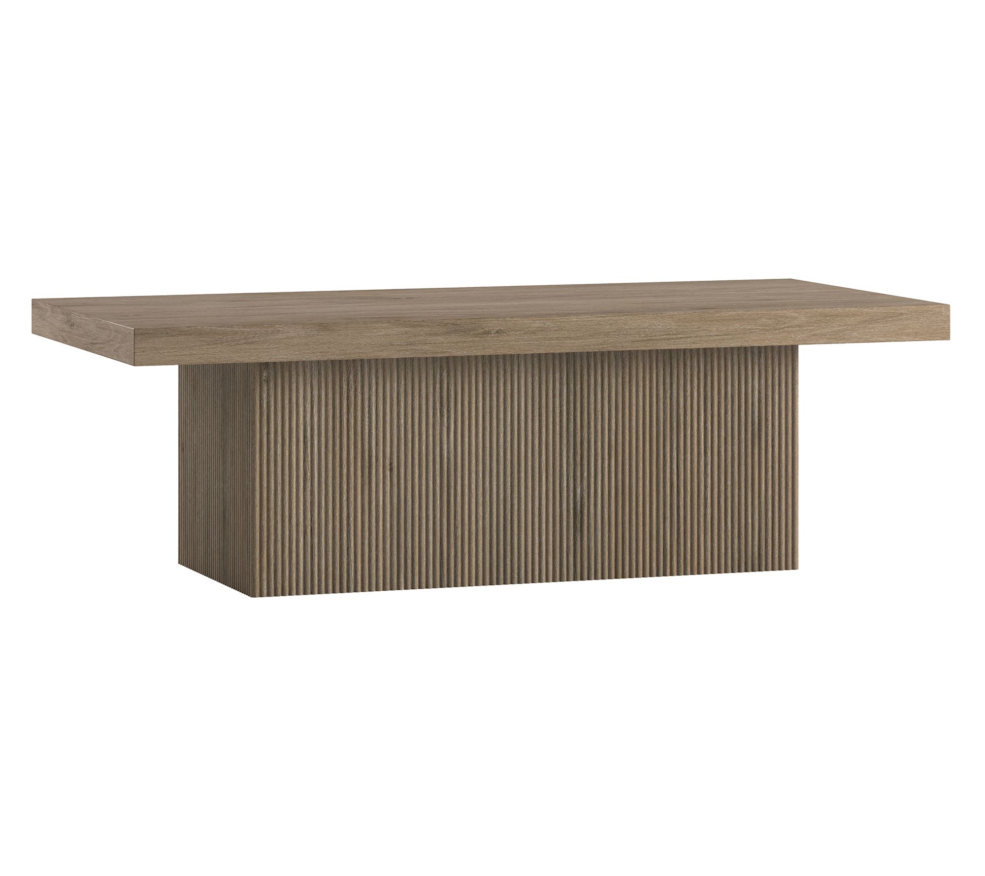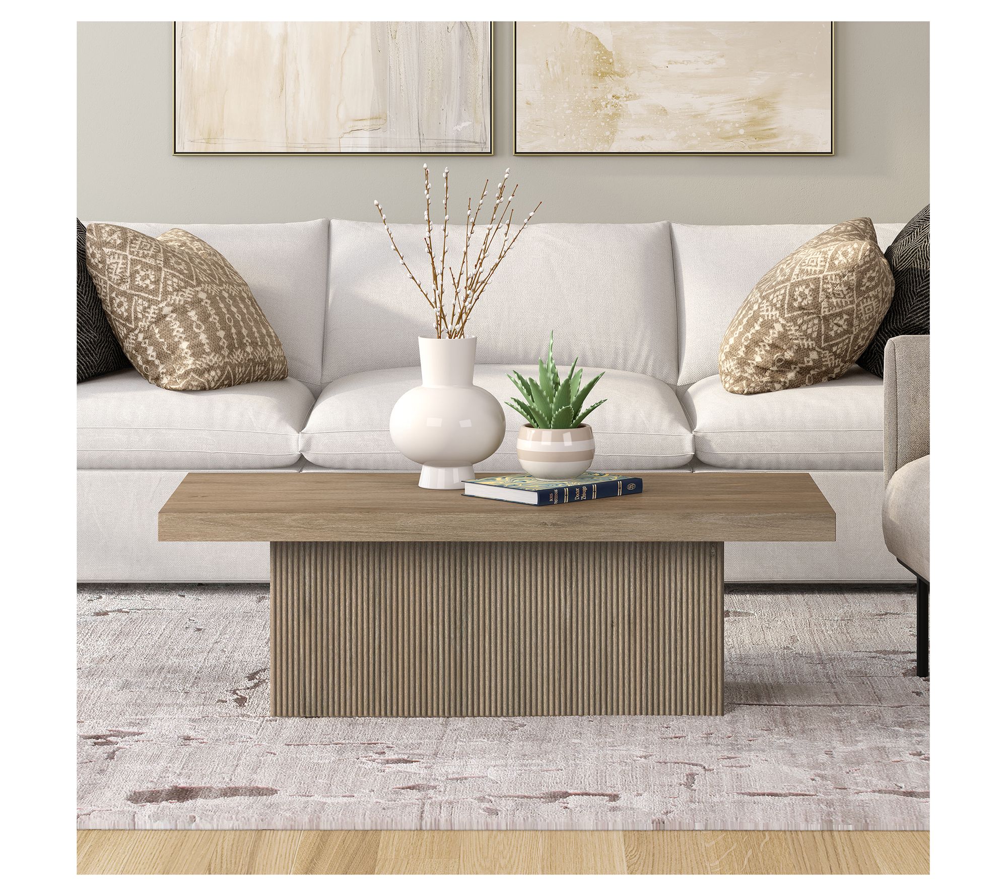 A sleek centerpiece for any living space, this coffee table showcases a refined silhouette with fluted base detailing and a natural wood-look finish that instantly adds interest and warmth. The generous surface is ready for game nights or your favorite decor, while its sturdy build stands up to everyday use. From Hudson&Canal.