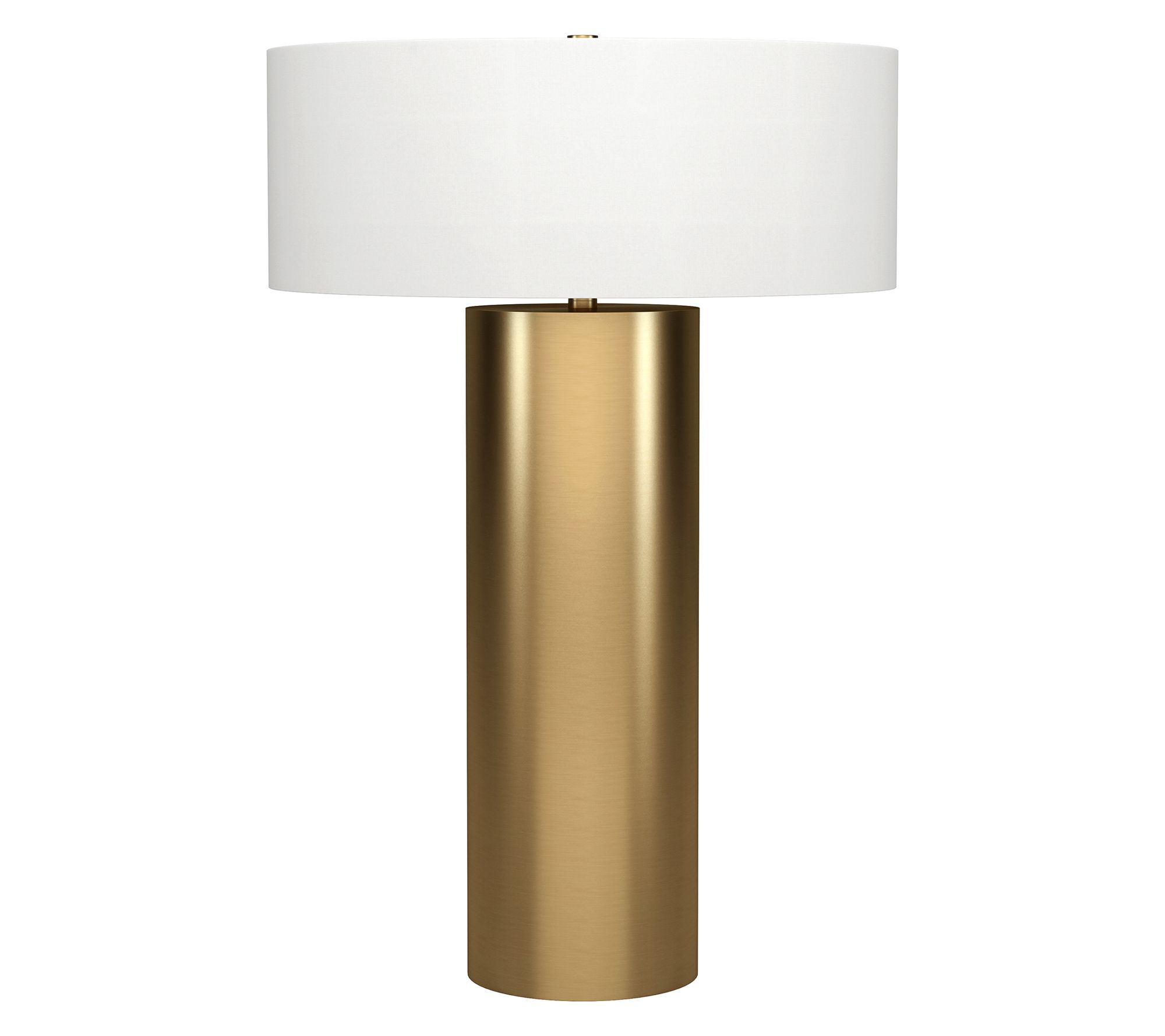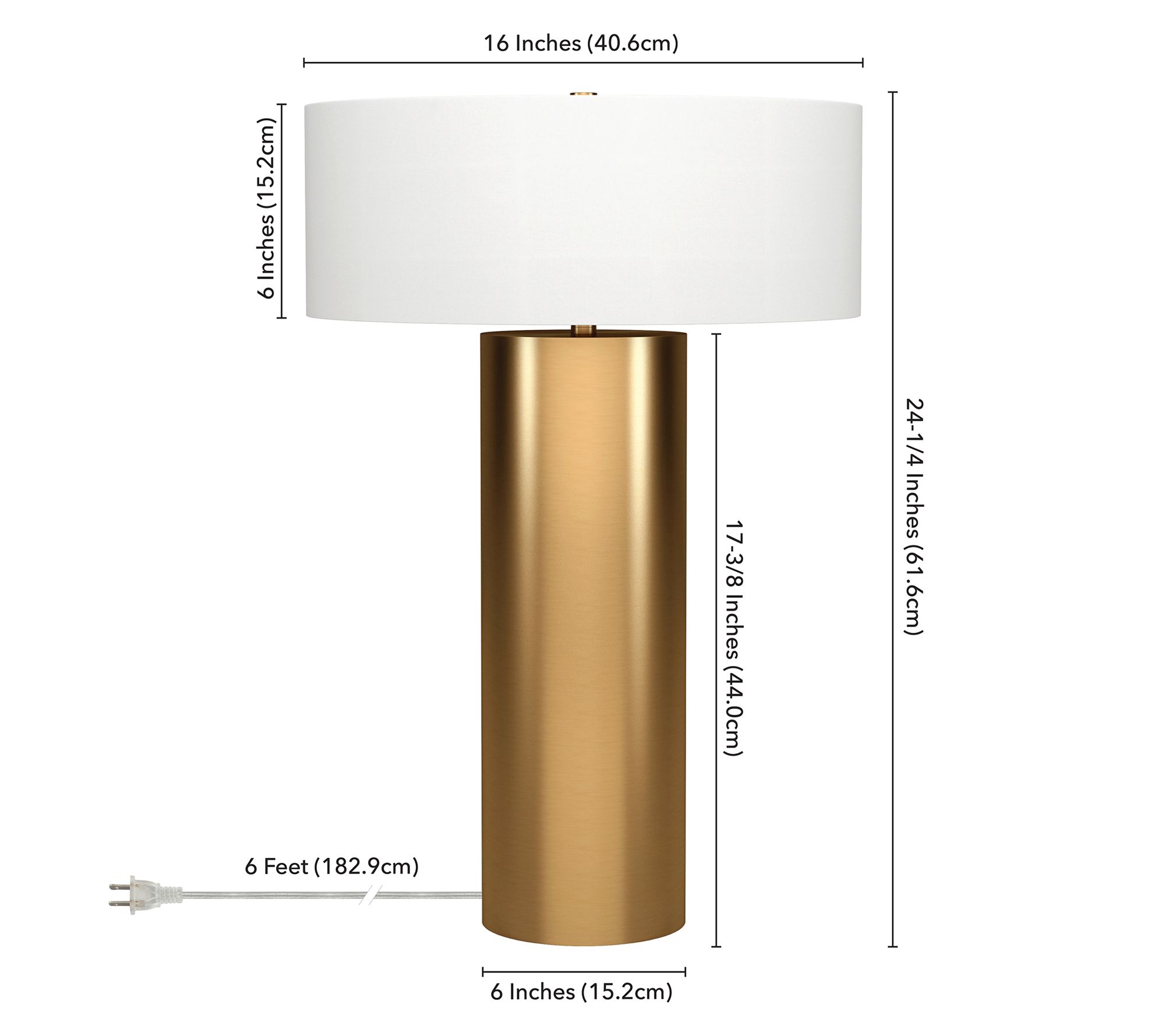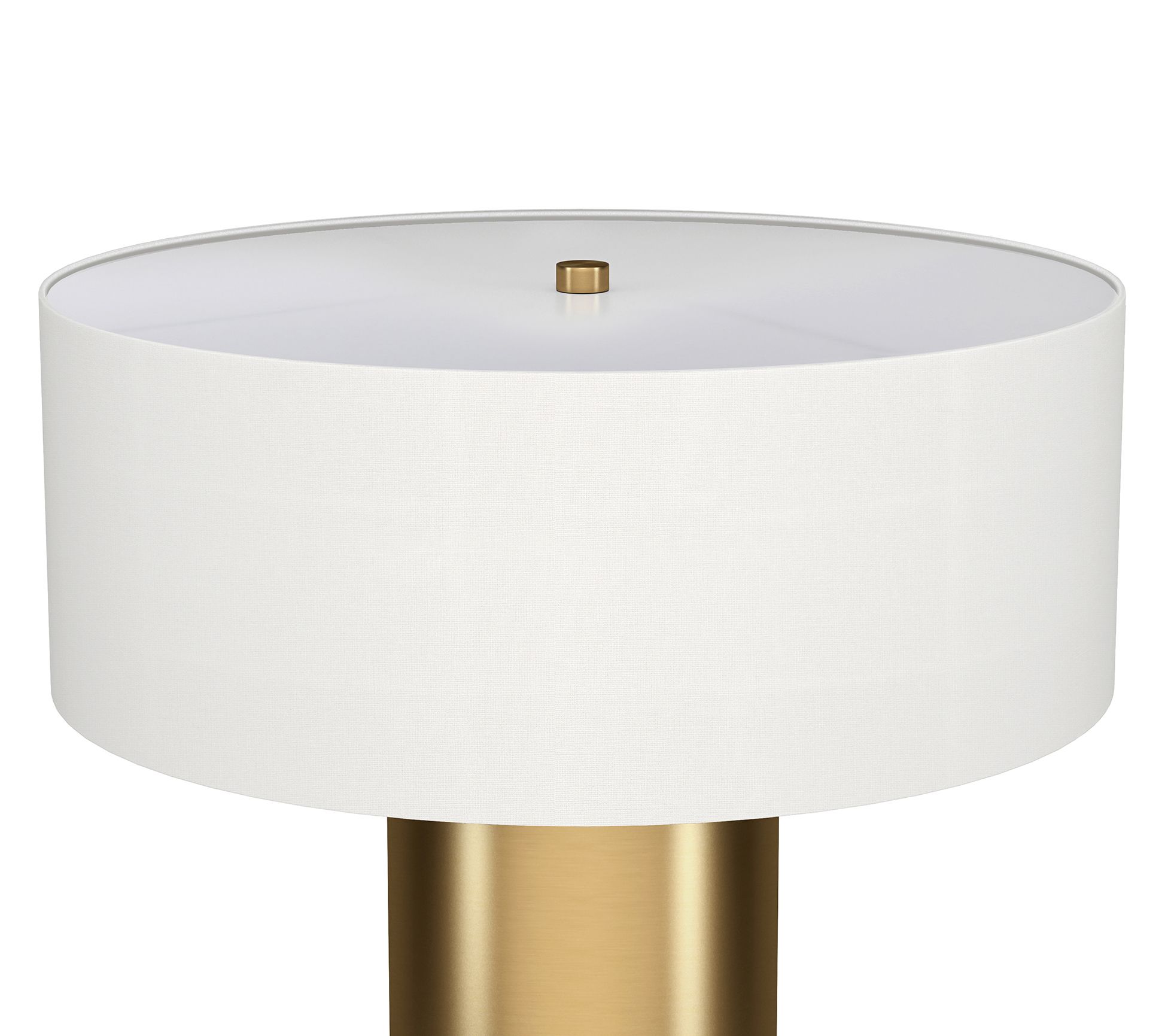 Sleek lines and shimmering metal details give this mid-century inspired table lamp a fresh, modern feel. A crisp fabric drum shade with a diffuser softly illuminates your favorite reading spot or bedside, while the streamlined column base brings a hint of retro style to your decor. From Hudson & Canal.