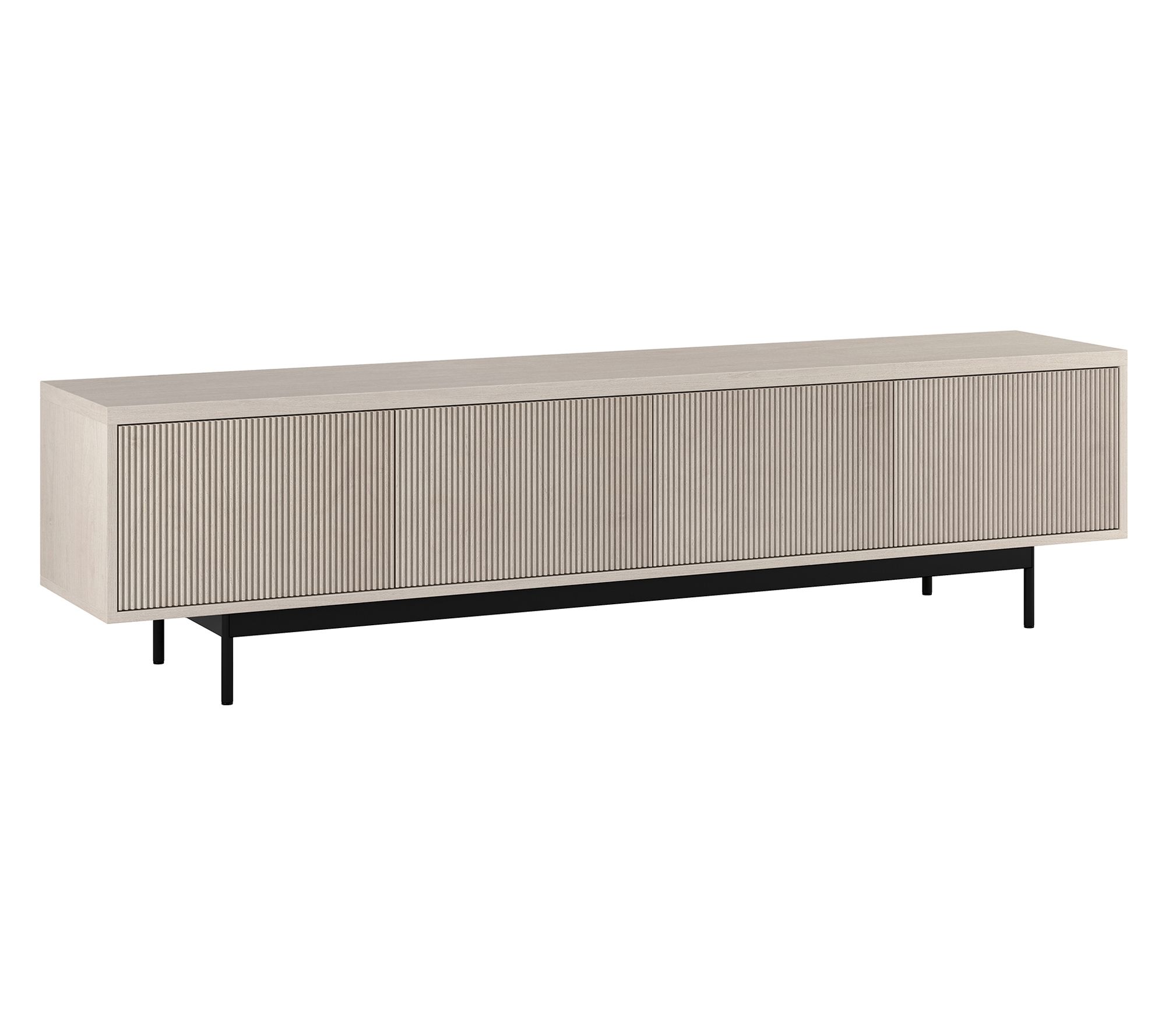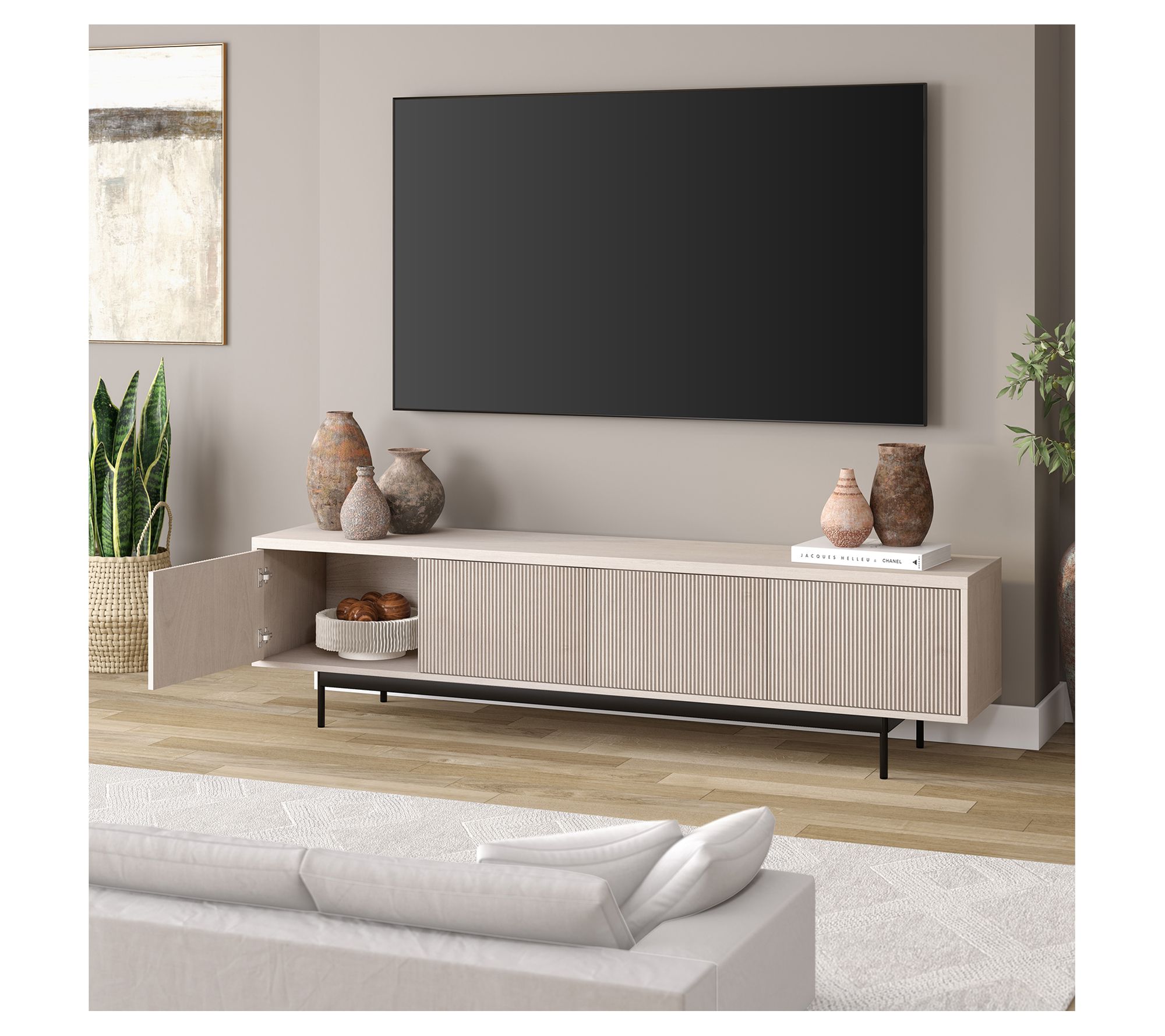 Whether you're gathering for movie night or catching the latest game, this rectangular TV stand brings stylish organization to your space with its modern wood grain finish, textured doors, and four fully enclosed storage areas for everything from consoles to books. Cable-management cutouts keep wires tidy while the wide surface supports up to an 85" TV. From Hudson&Canal.