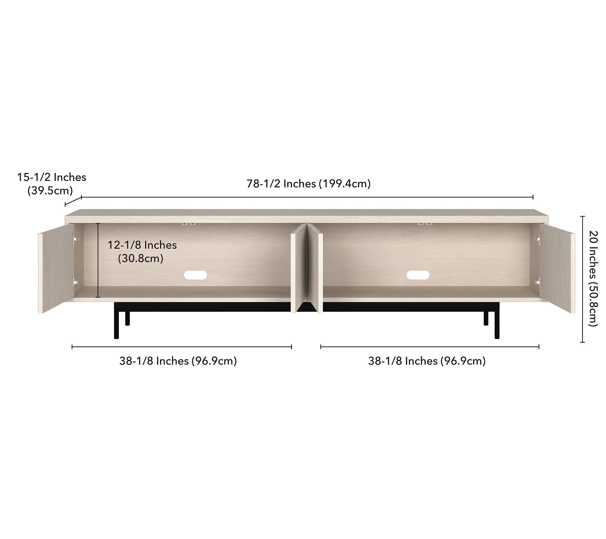 • Measures 78.5"W x 15.5"D x 20"H; top supports up to 75 lbs; inside storage area supports up to 45 lbs per section