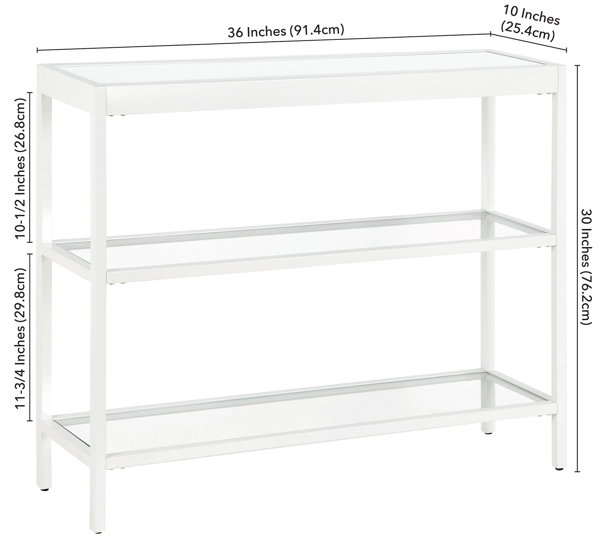 • Measures approximately 36"W x 10"D x 30"H, supports up to 50 lbs