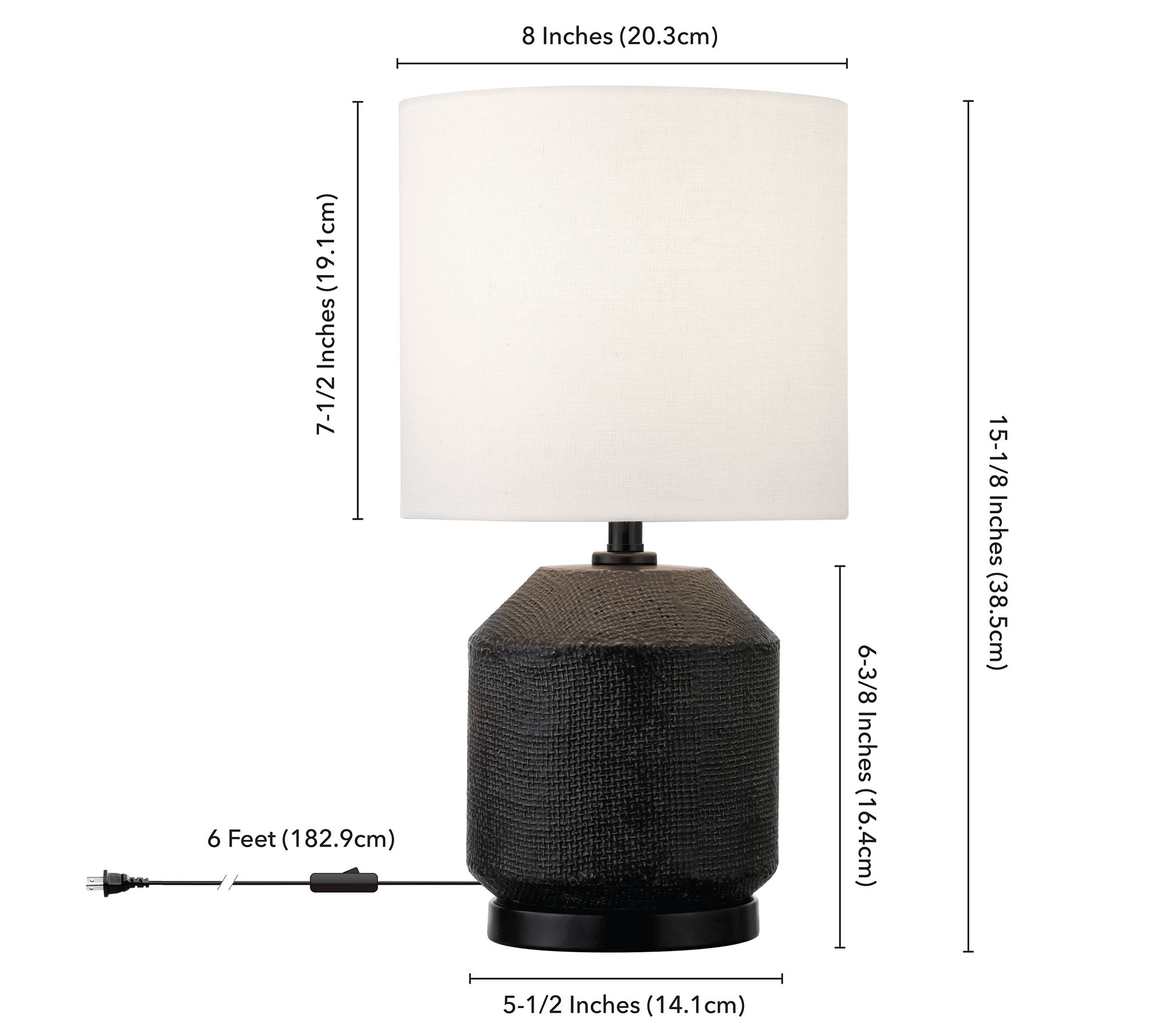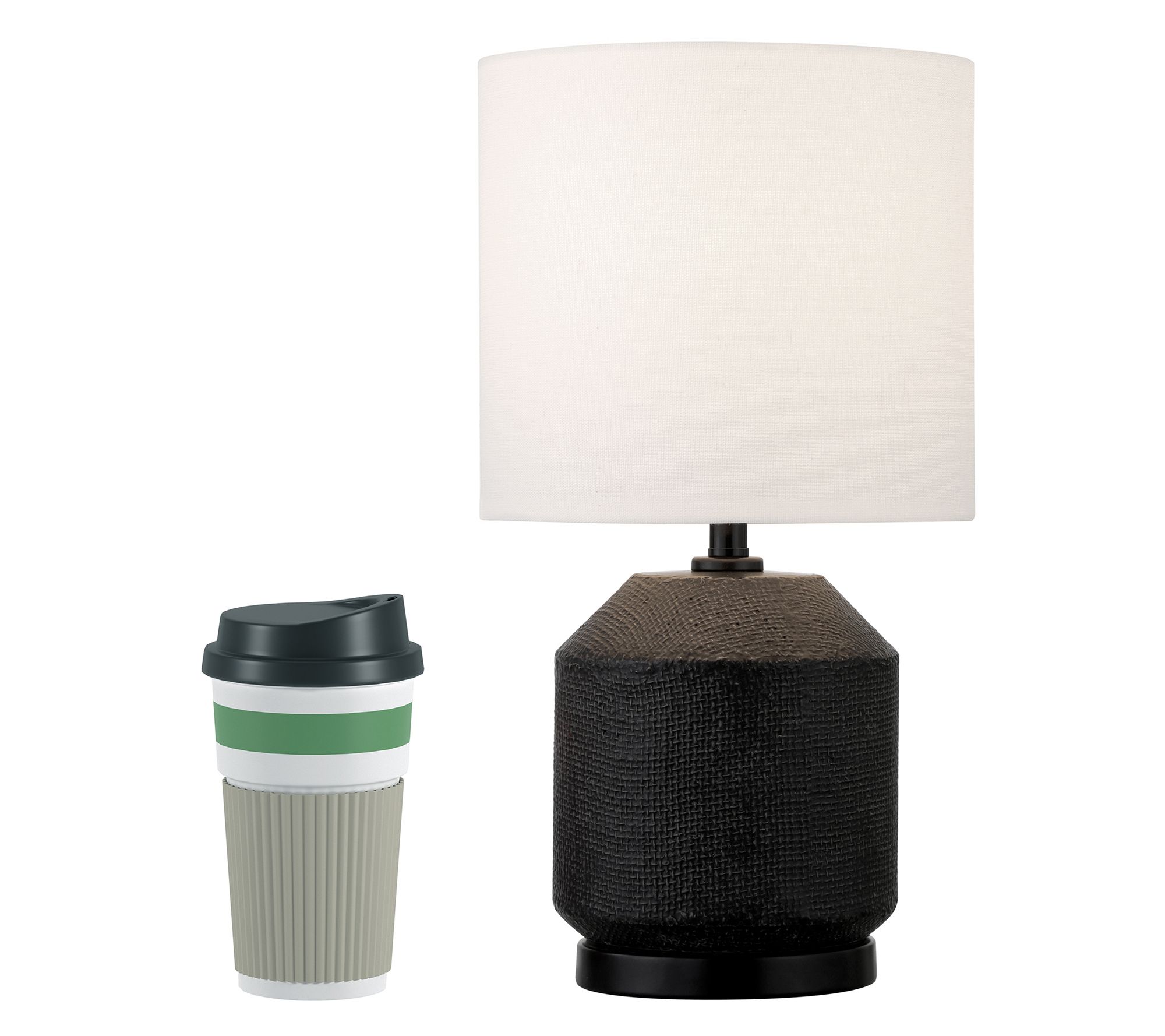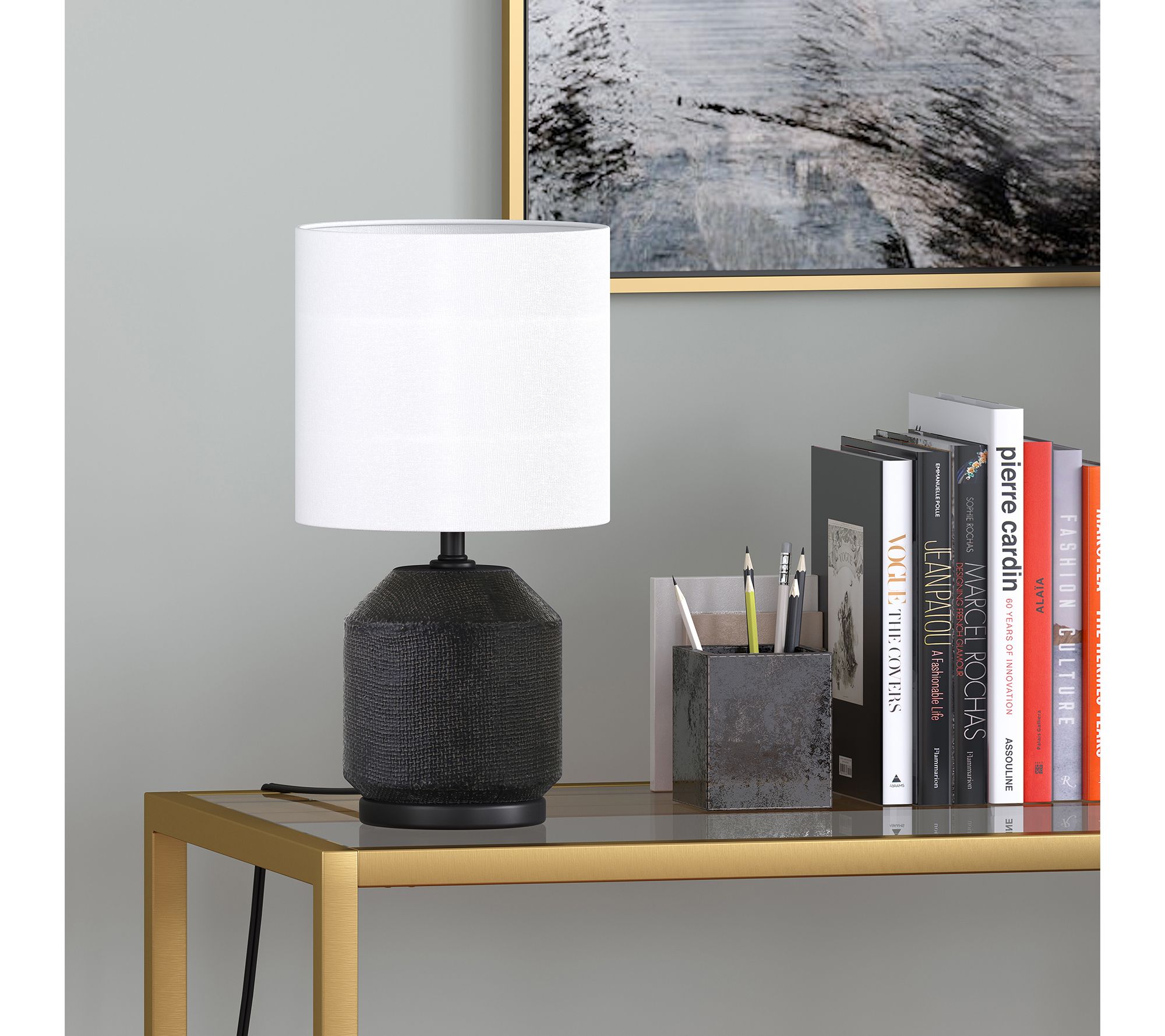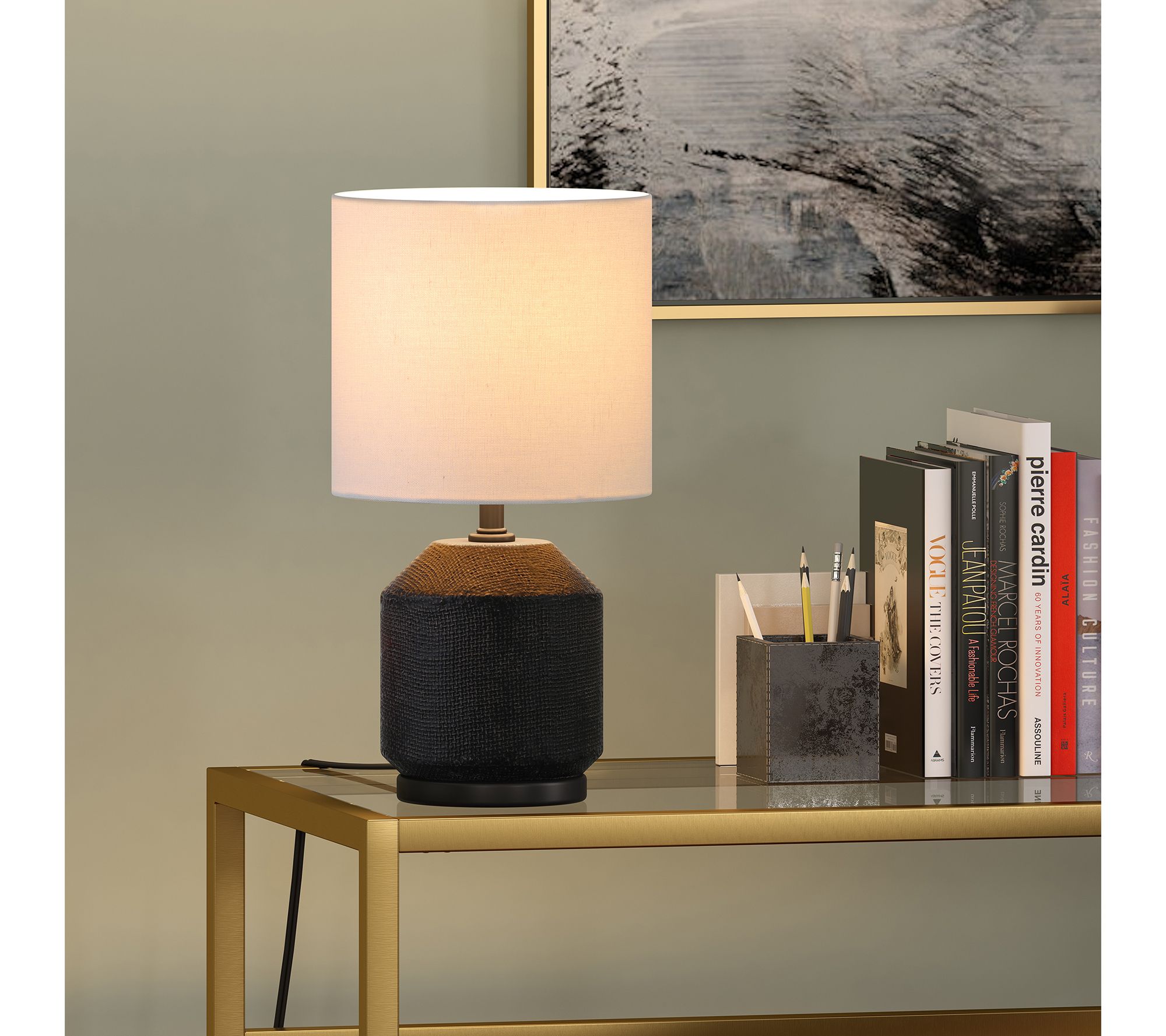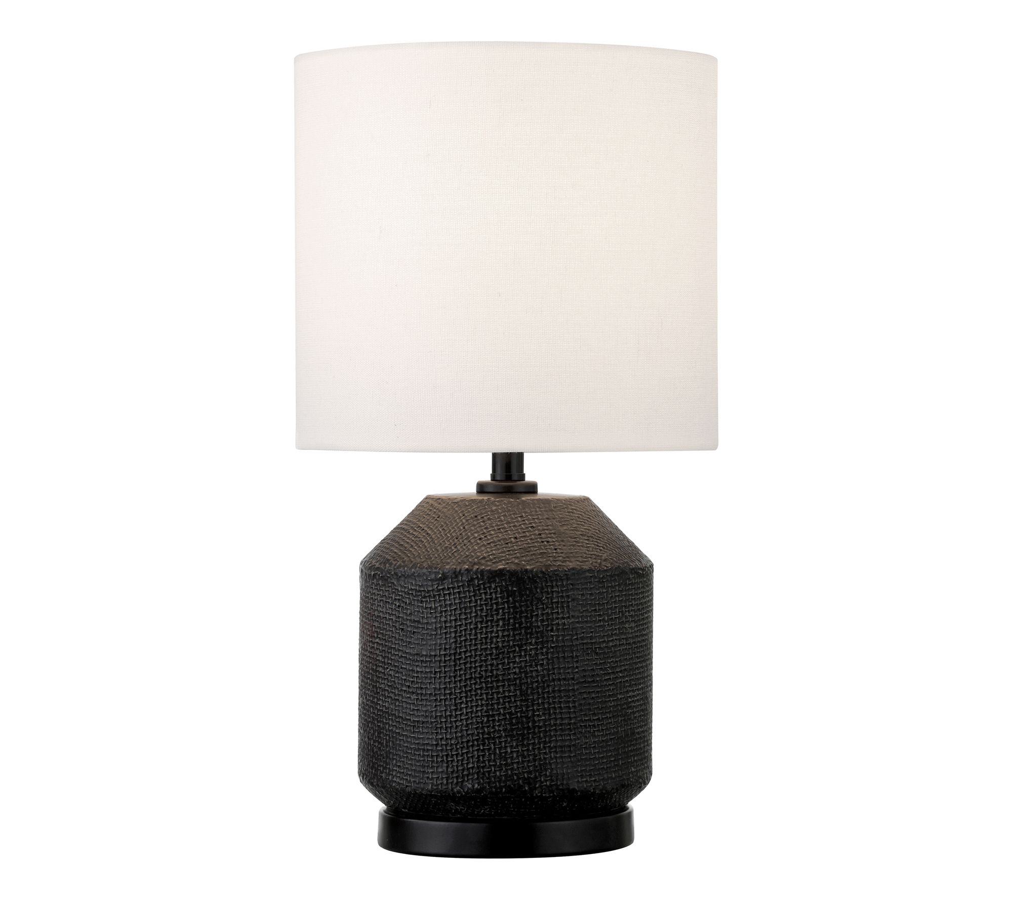 Add a touch of updated retro styling to your bedside, mantle, or hall table with the Hudson & Canal Esther mini lamp. Its jar-shaped ceramic base features a textural crosshatch design, complemented by a metal standing ring and a crisp fabric shade, making it perfect for shedding a little extra light. From Hudson & Canal.