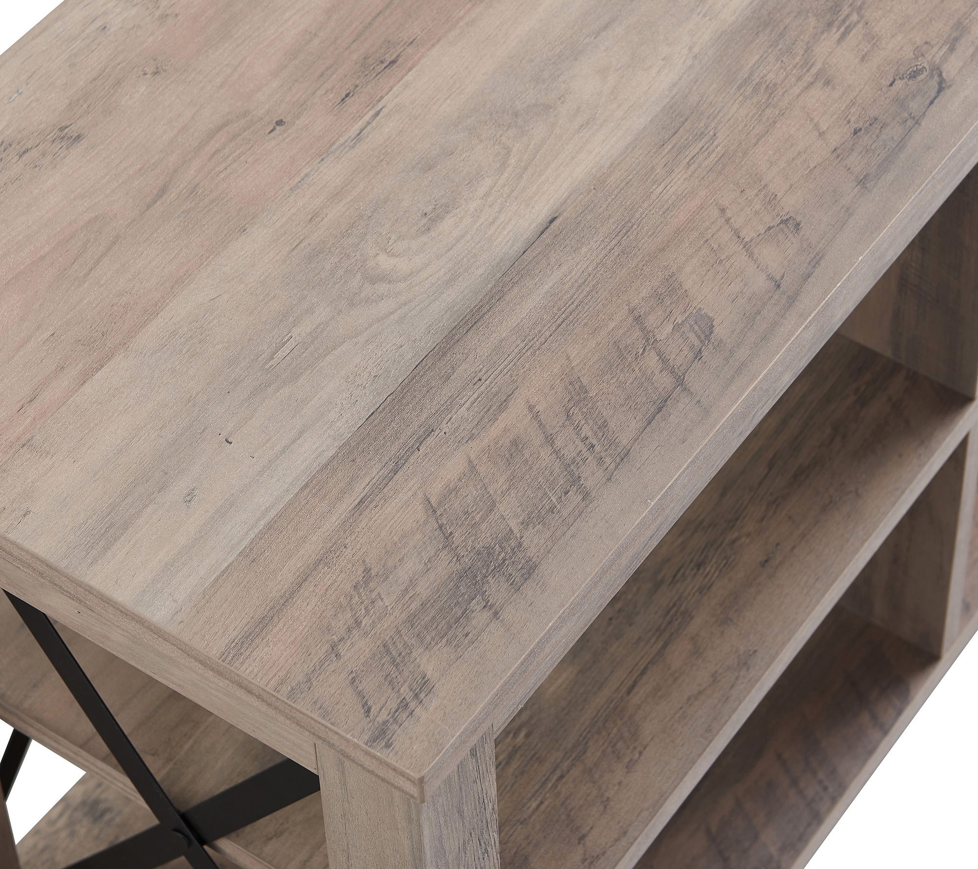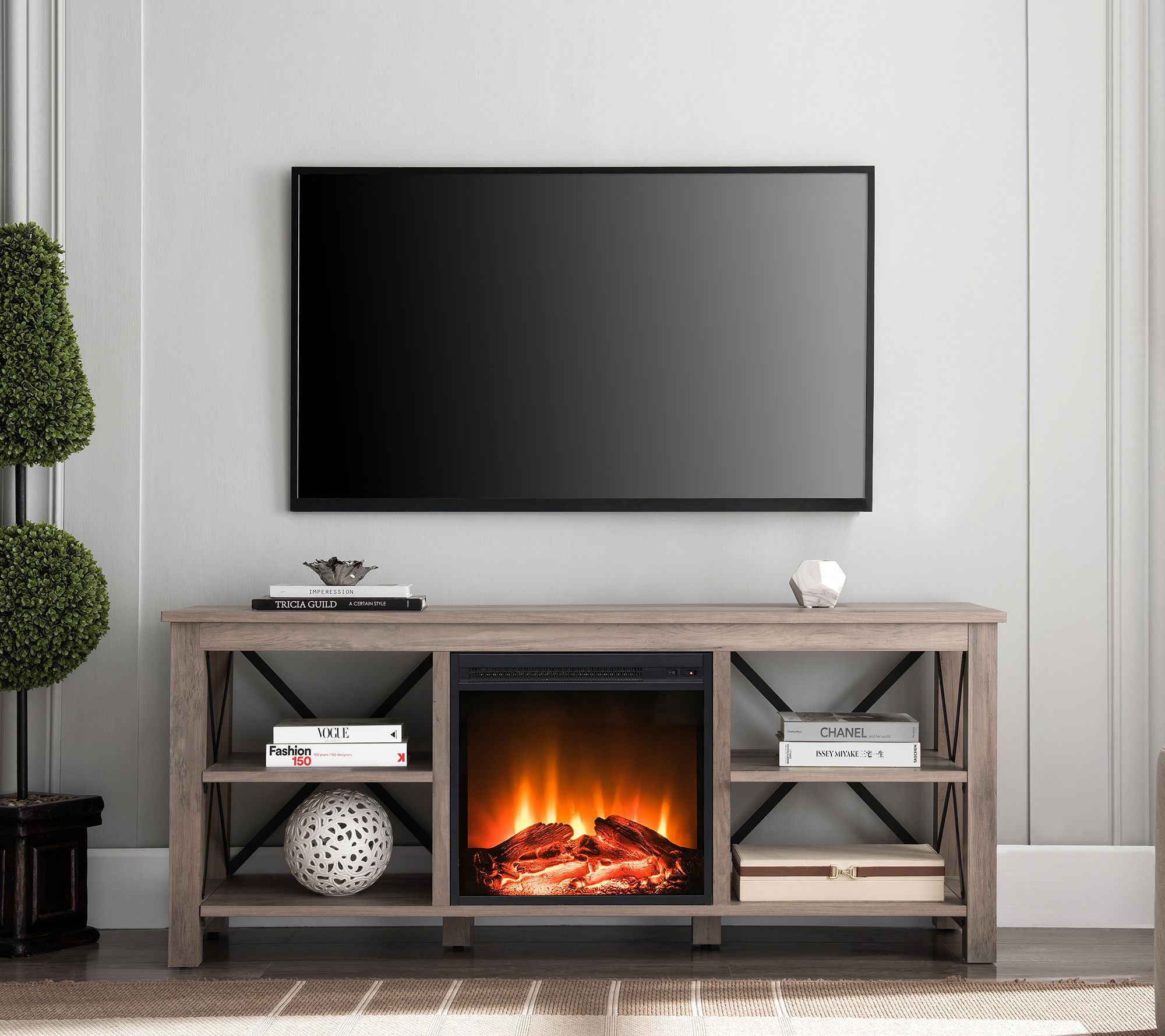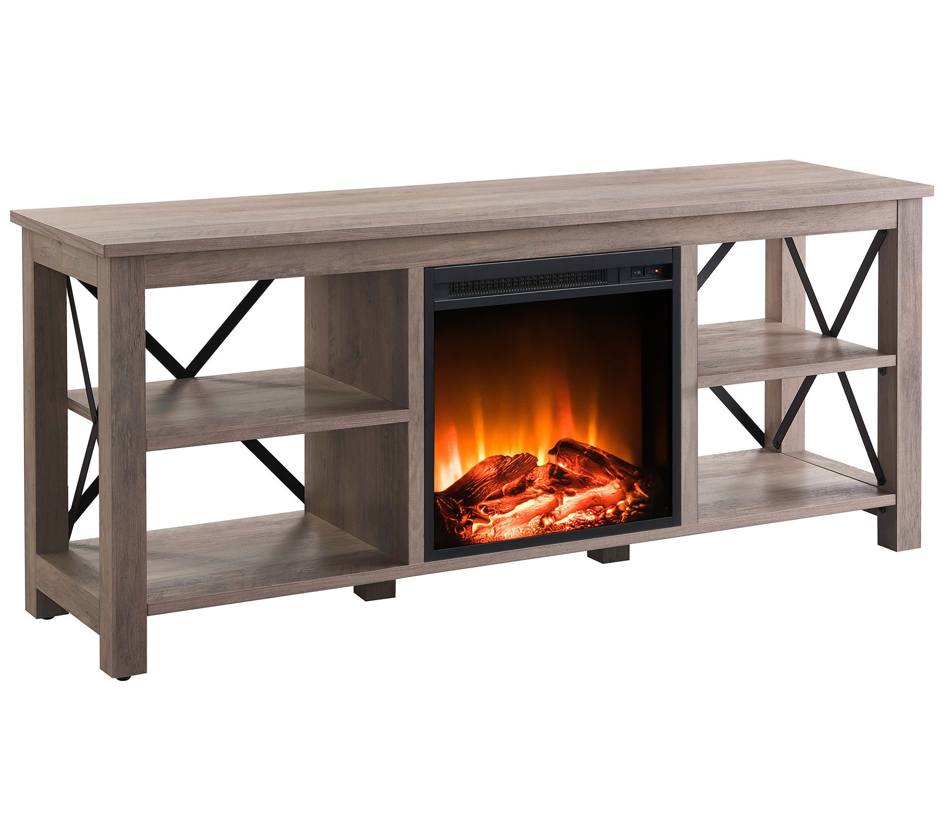 With its X-shaped black metal accents and rich wood tones, the Sawyer TV stand with log fireplace is the ultimate fusion of style and coziness for your game days, movie nights, and binge-watching extravaganzas. From Hudson and Canal.