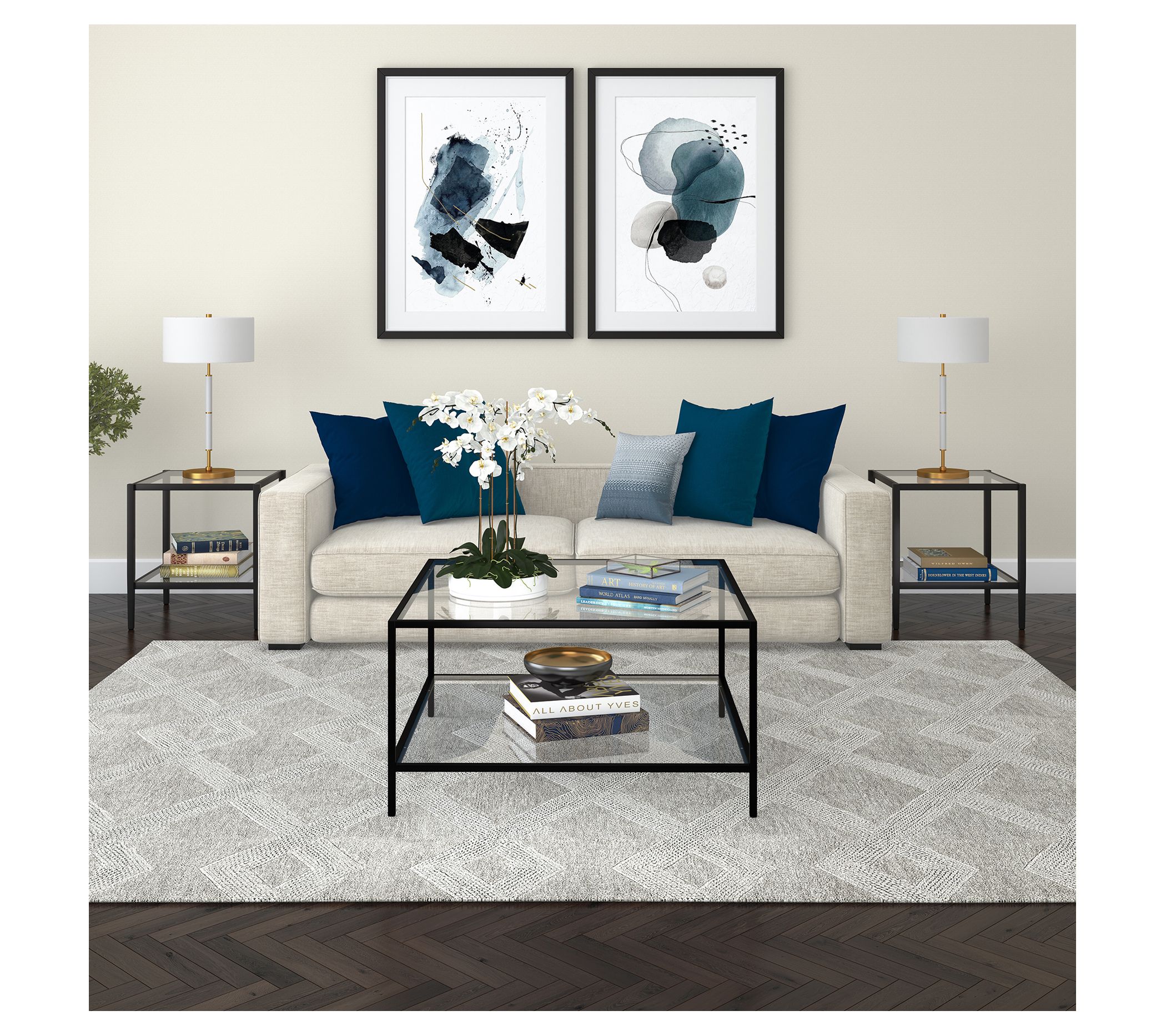 Tempered glass outlined by sleek steel frames gives you a beautifully refined coffee table that blends effortlessly with any motifs or color schemes you've chosen for your space. From Hudson & Canal.