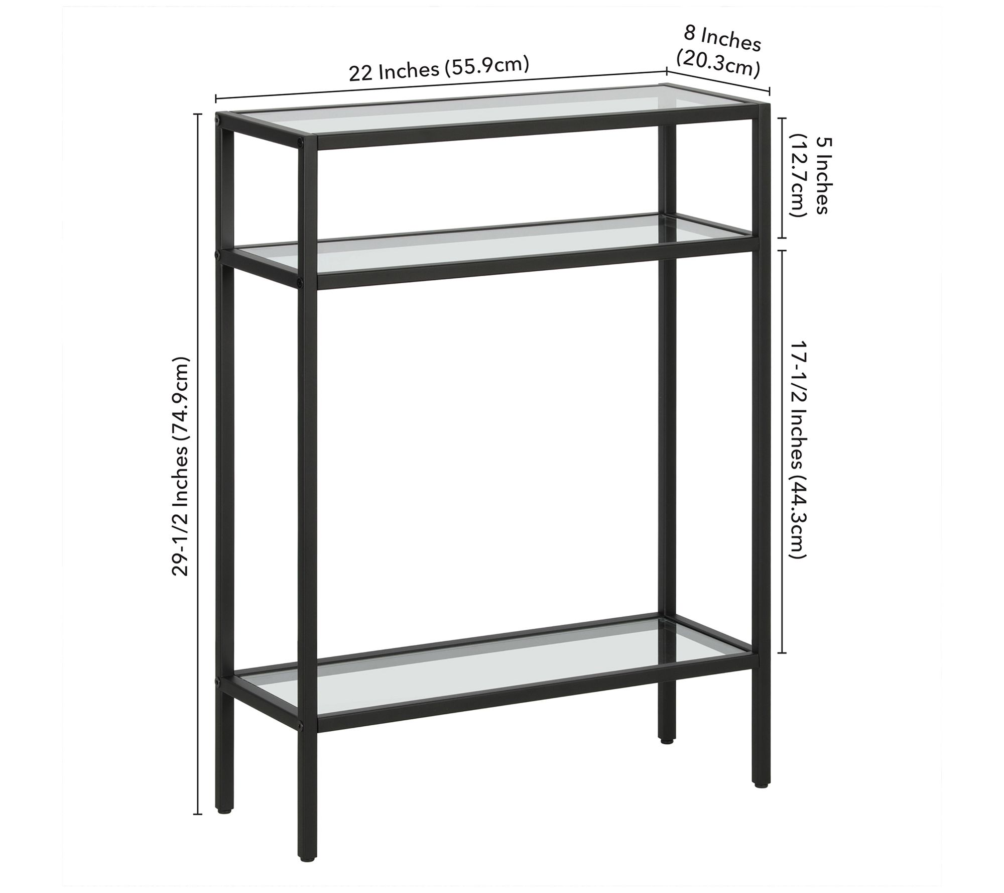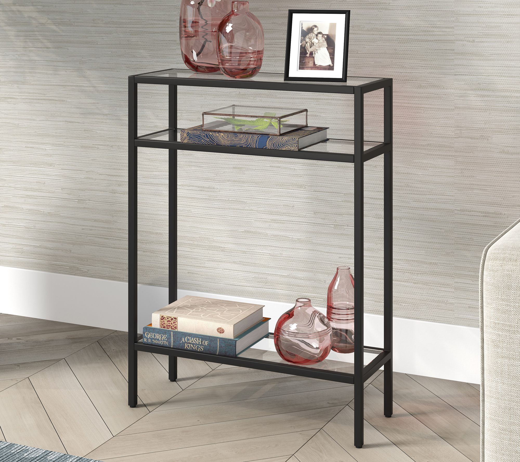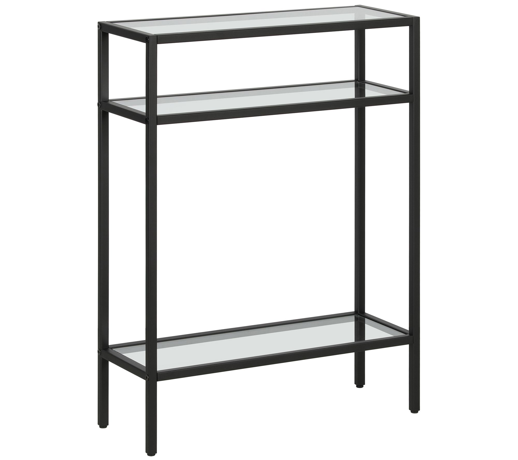 Deftly declutter your living space with the modern design of this console table that displays your treasures on a sleek glass tabletop and shelves. From Hudson & Canal.