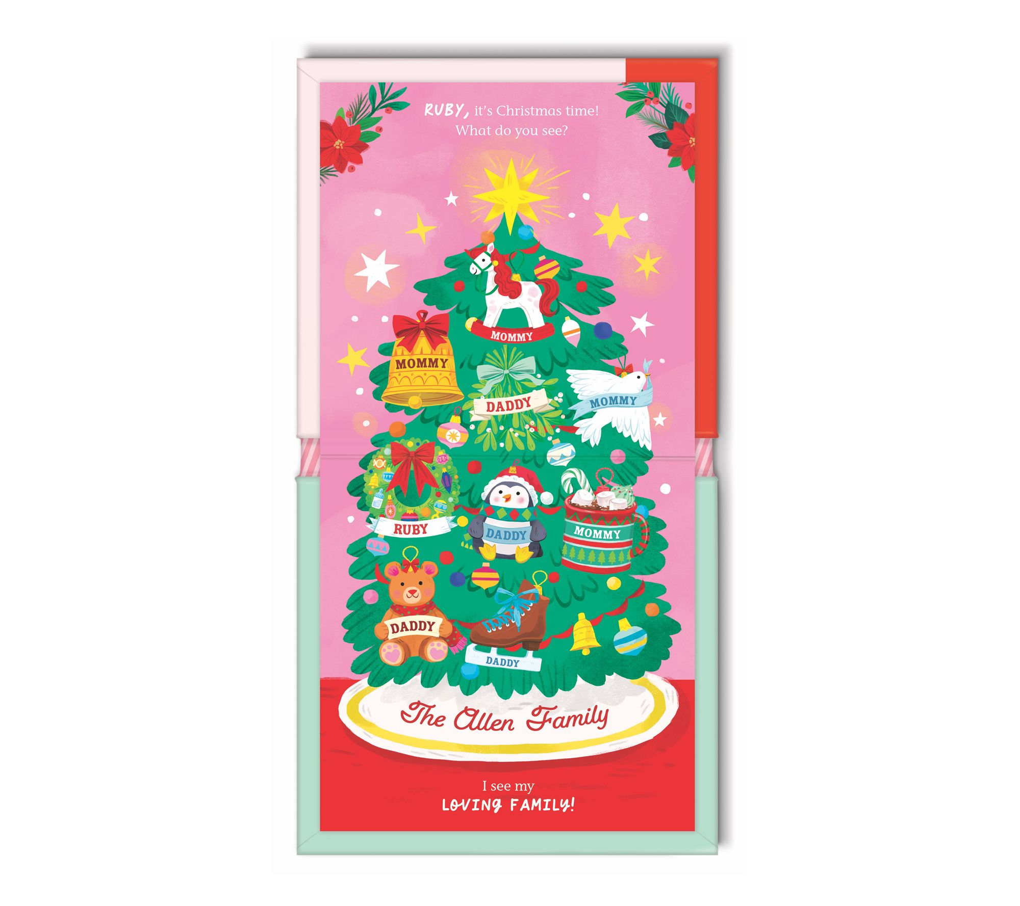 Create a cherished holiday tradition with this personalized board book, where every page captures the warmth of family Christmas celebrations. Little ones will delight in seeing their own name woven into a festive story, complete with illustrated ornaments highlighting the unique roles of mom and dad.