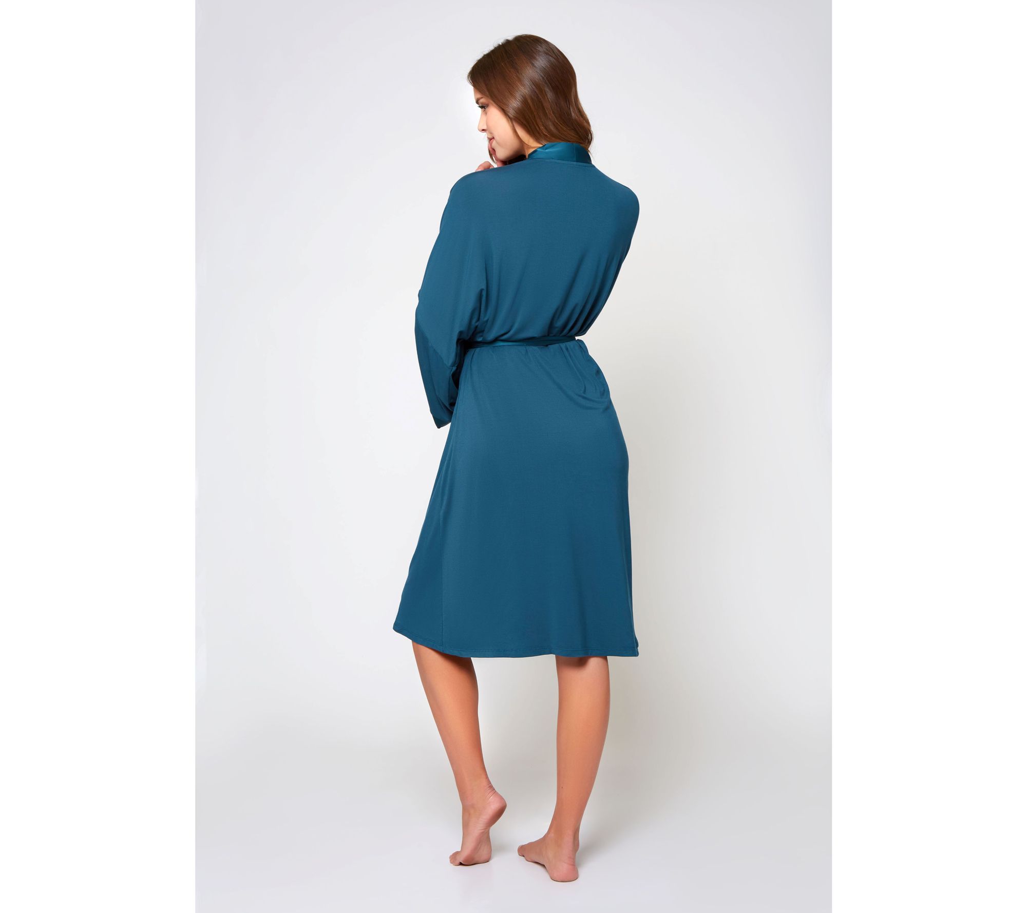 • Features: 3/4-length kimono sleeves with stretch satin detail, V-neckline, self-tie belt with loops and inner ties, drop-shoulder bell sleeves, solid pattern