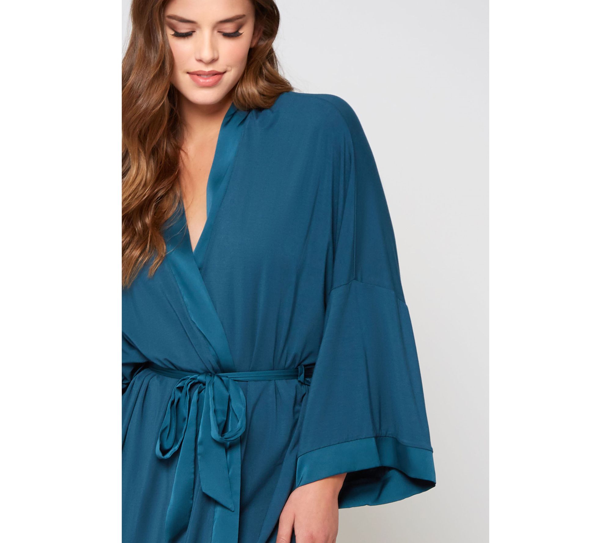 Evenings at home feel extra special in this knee-length robe, crafted from silky-soft knit and designed with 3/4-length kimono sleeves and a relaxed fit for effortless lounging. Luxe stretch satin details at the sleeves and placket offer a subtle contrast, while the self-tie sash with inner ties keeps things secure. From iCollection.