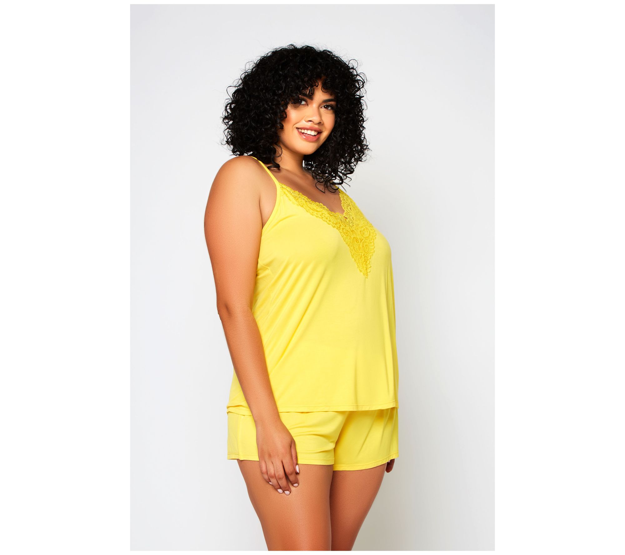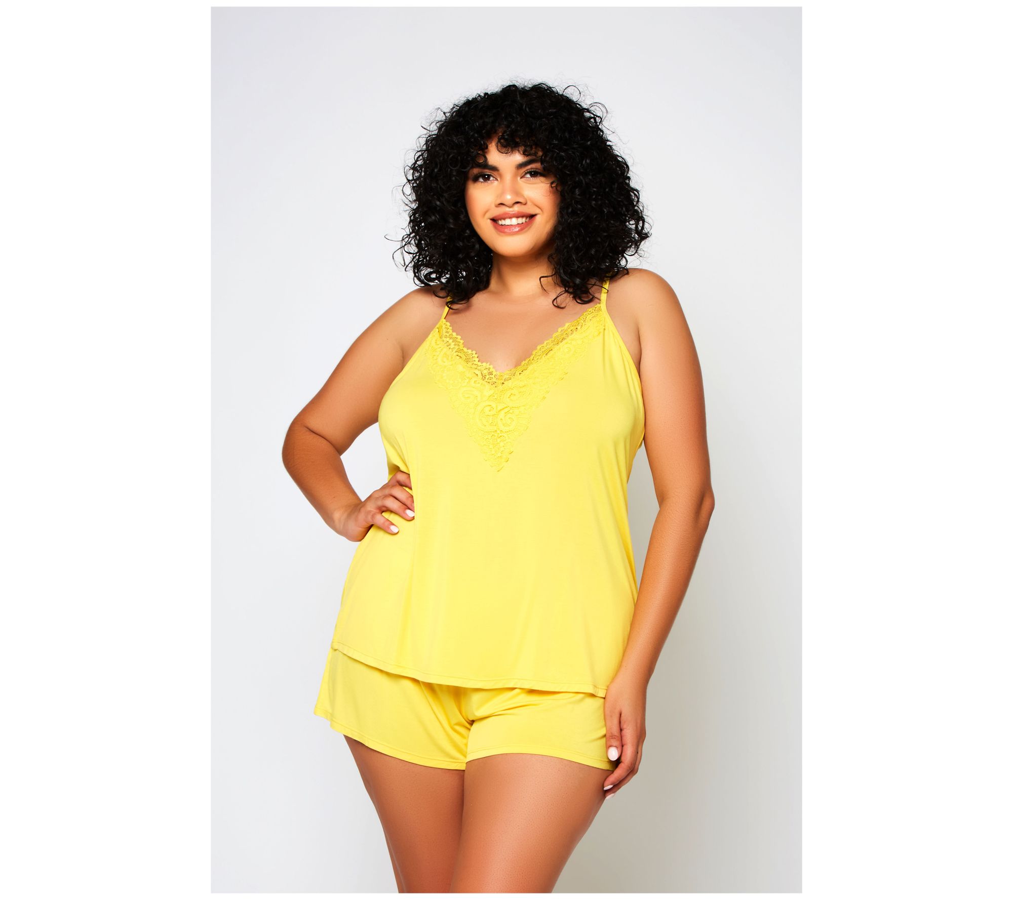 • Features: V-neck cami with lace overlay, pull-over style with adjustable straps, elastic waistband on shorts with lace accents