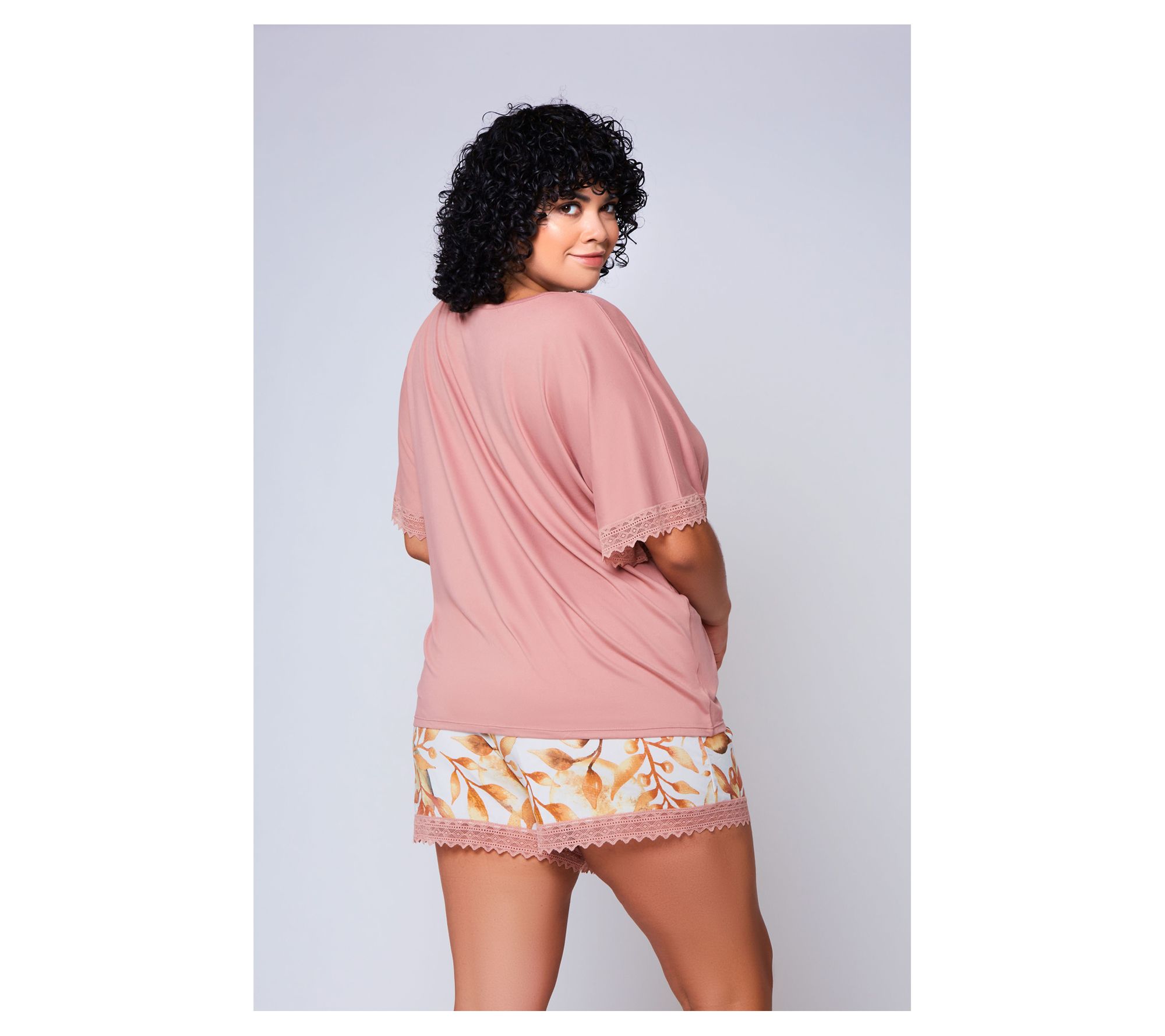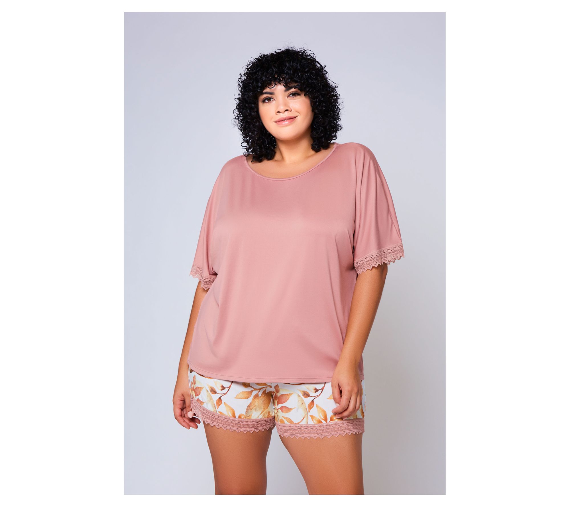 Slip into this lounge set for a blend of comfort and elegance that transitions seamlessly from a cozy night in to a casual day out. This set combines the softness of a laced-trimmed knit tee with the charm of lace-trimmed, leaf print woven shorts, making it a versatile addition to your wardrobe. From iCollection.