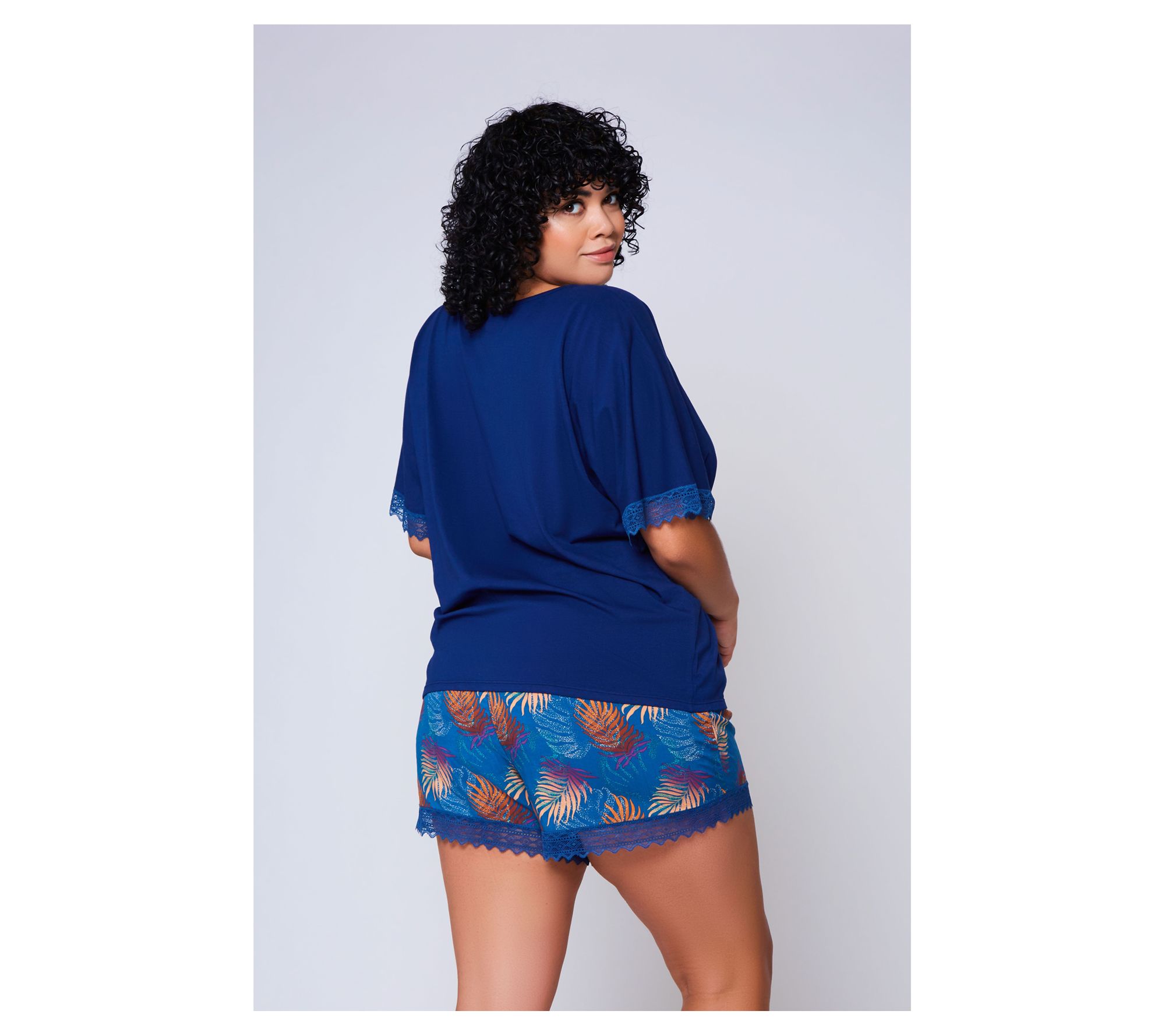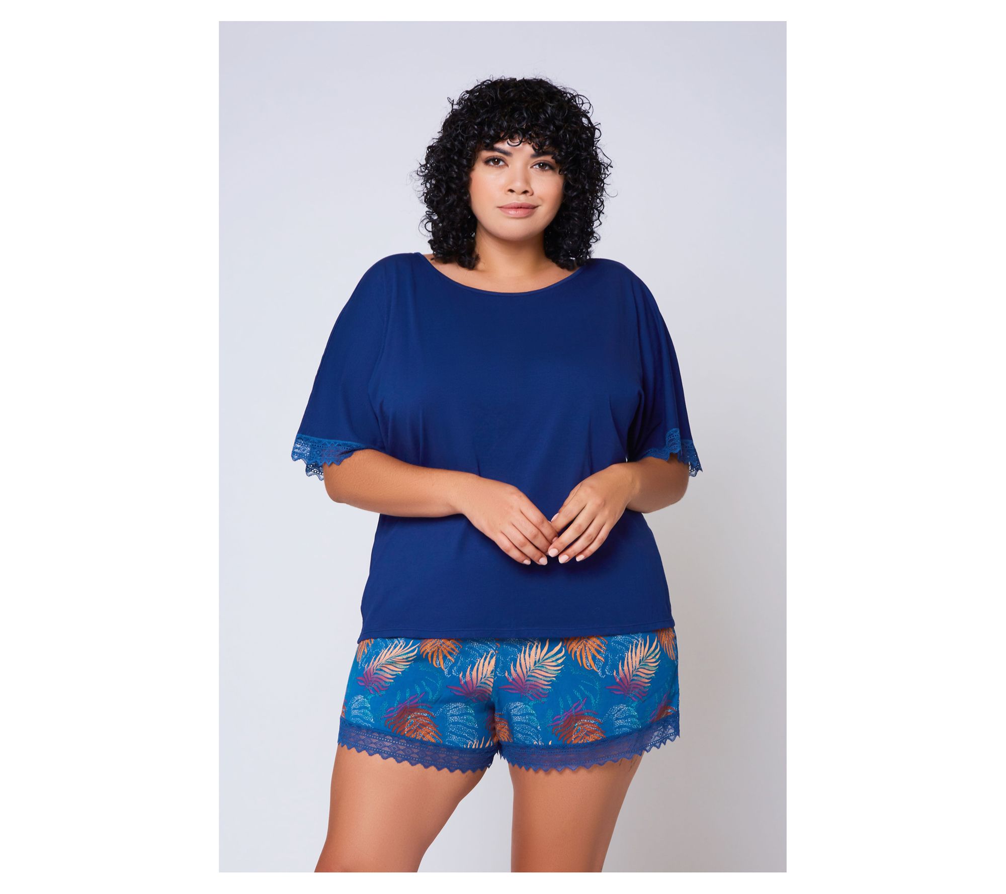 Slip into this lounge set for a blend of comfort and elegance that transitions seamlessly from a cozy night in to a casual day out. This set combines the softness of a laced-trimmed knit tee with the charm of lace-trimmed, leaf print woven shorts, making it a versatile addition to your wardrobe. From iCollection.