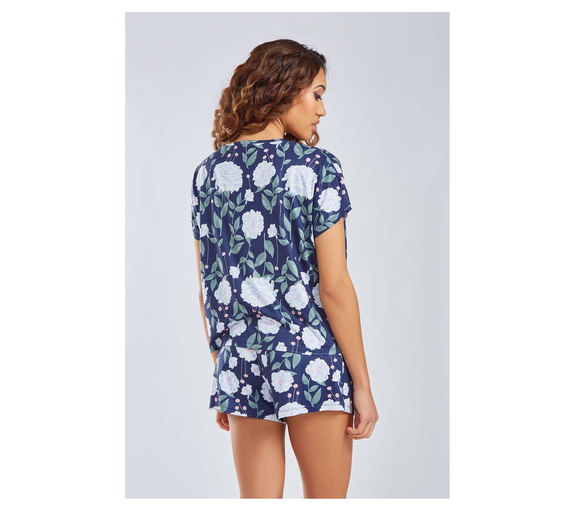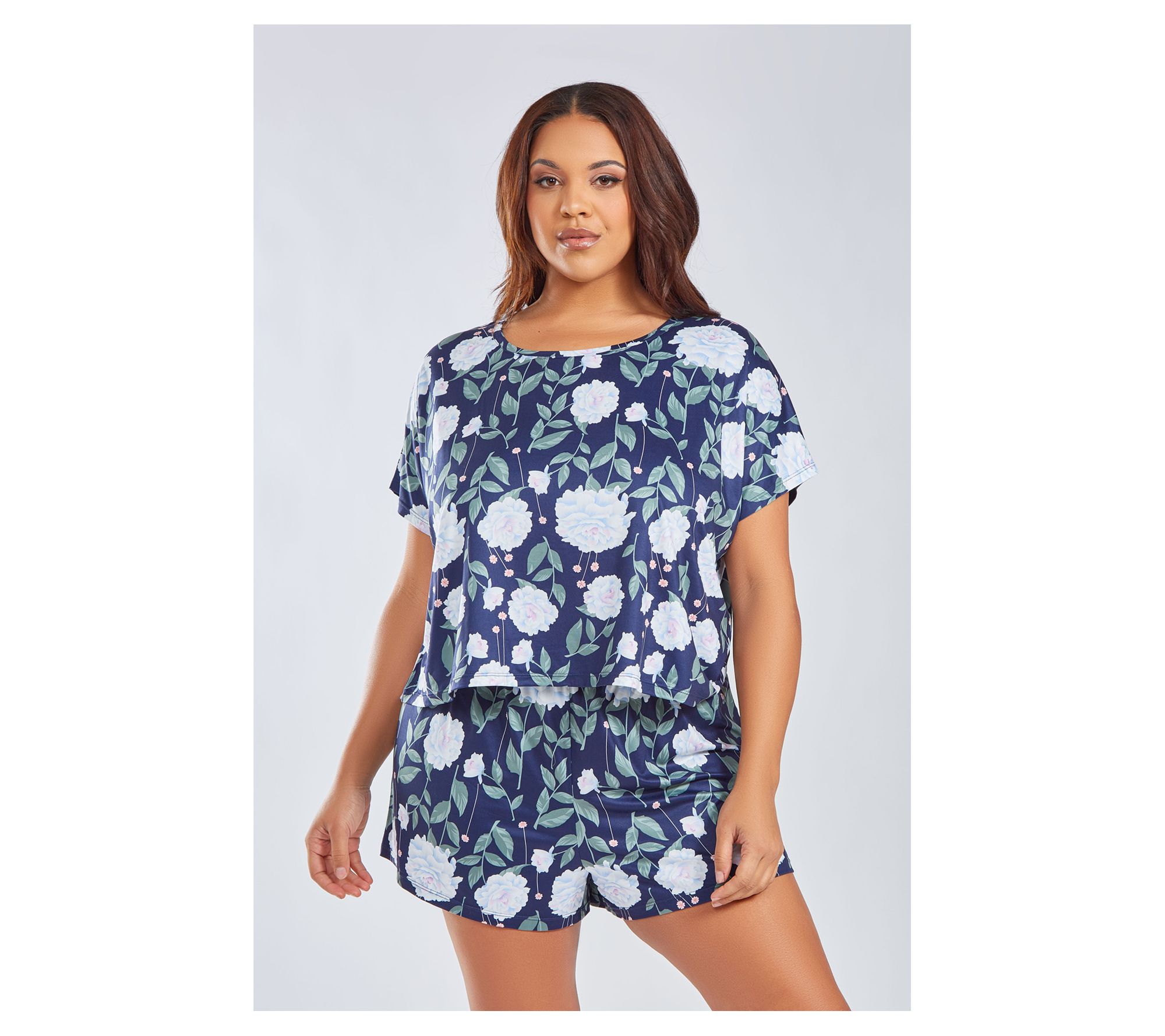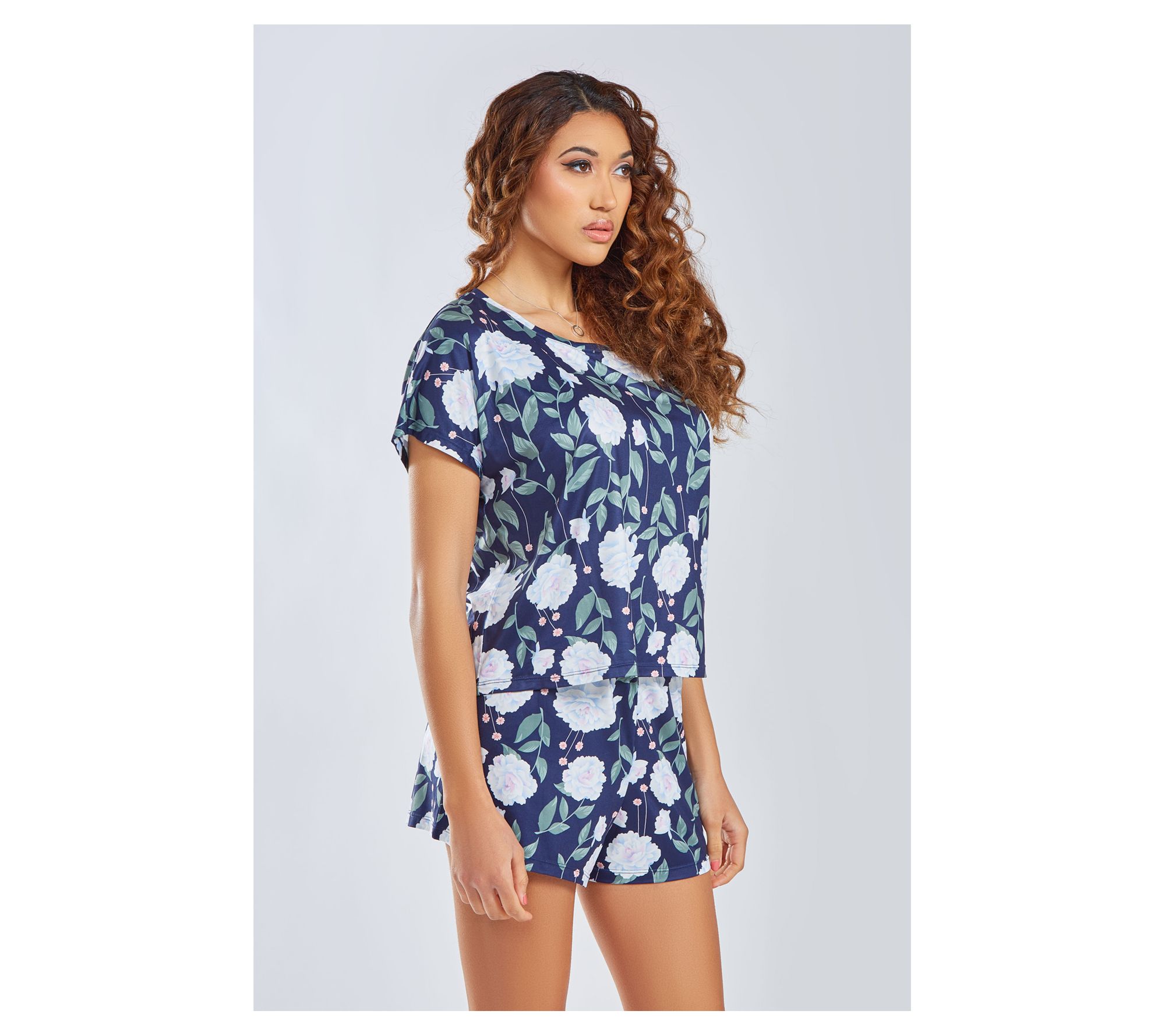 Snuggle-worthy pajamas that are polished enough to wear out of the house, this top and shorts lounge set features a floral print on a beautiful blue background. From iCollection.