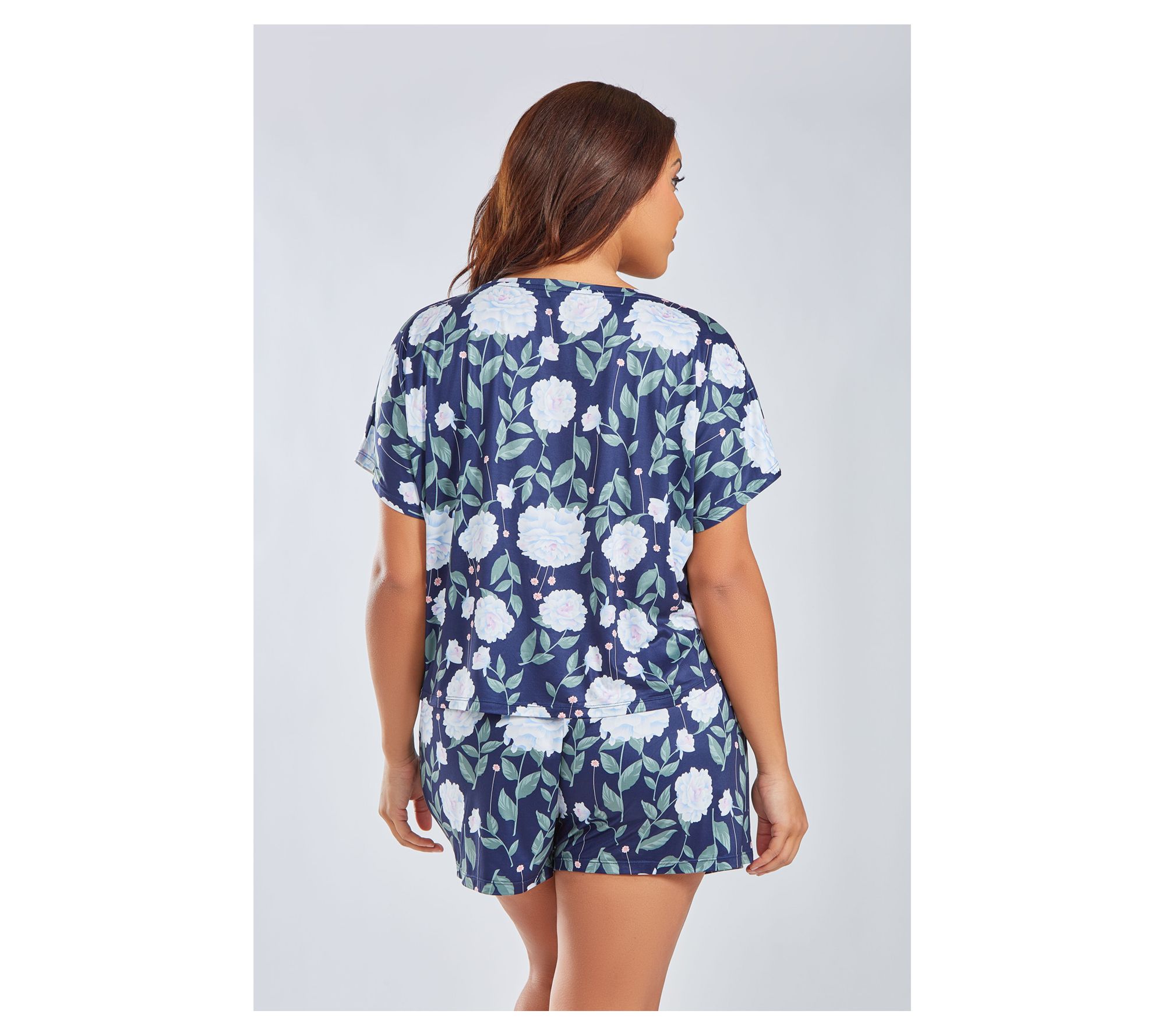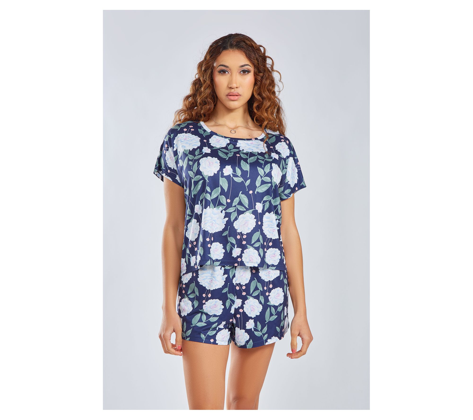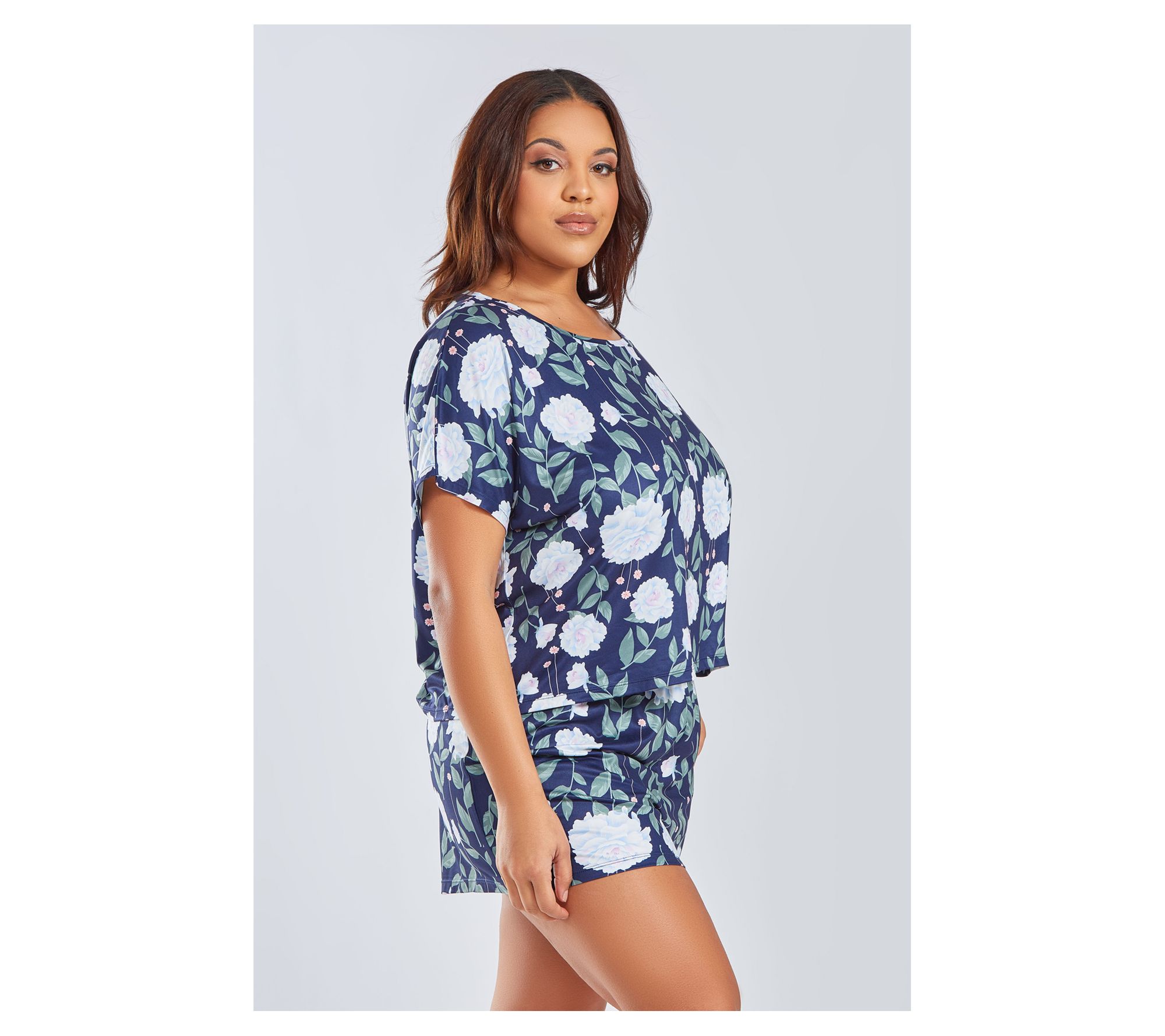 Snuggle-worthy pajamas that are polished enough to wear out of the house, this top and shorts lounge set features a floral print on a beautiful blue background. From iCollection.