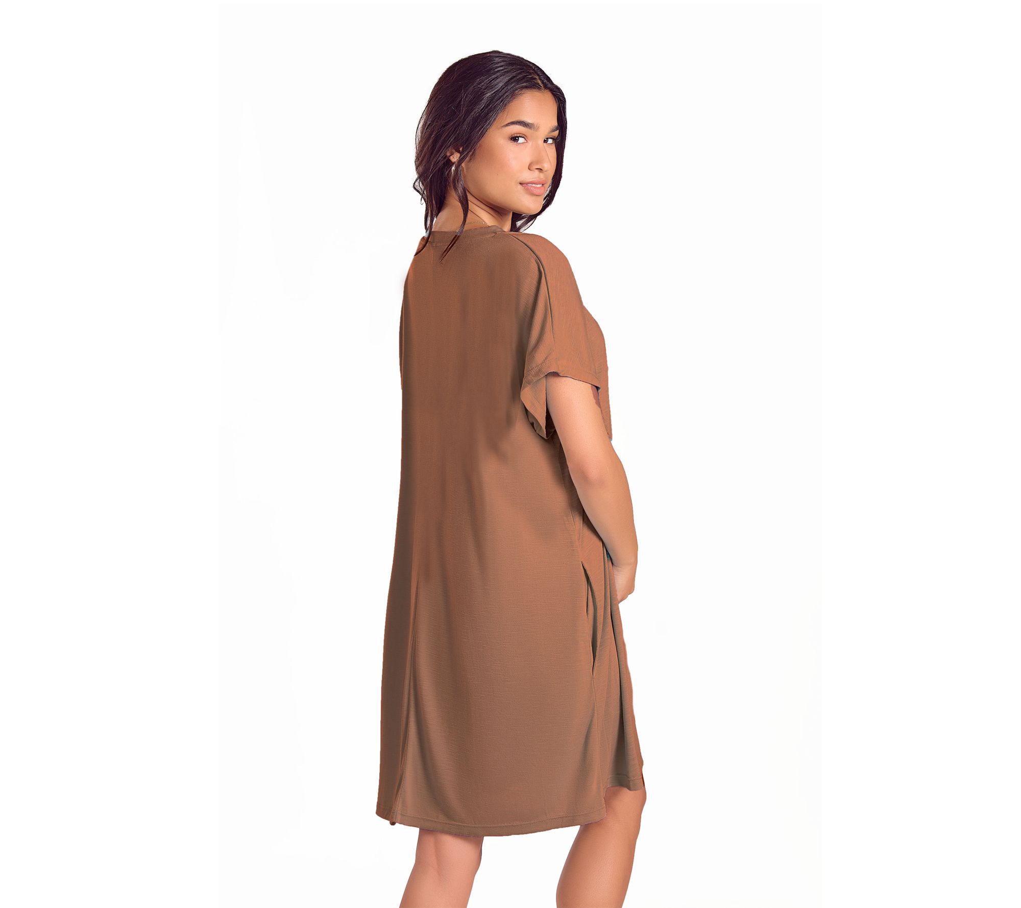 Ease into comfort after a long day with this soft knit sleep dress, crafted for relaxation whether you're winding down at home or lounging beachside. Breathable stretch-knit fabric helps keep you cool through the night, while a drapey silhouette and deep pockets add both style and practicality for carrying your phone or favorite book. From iCollection.