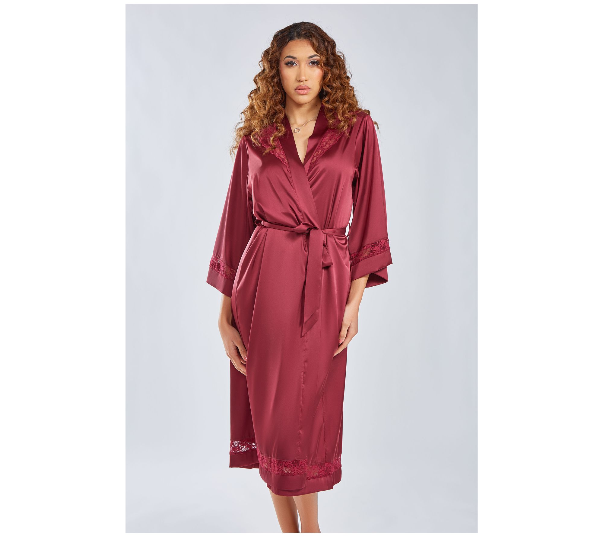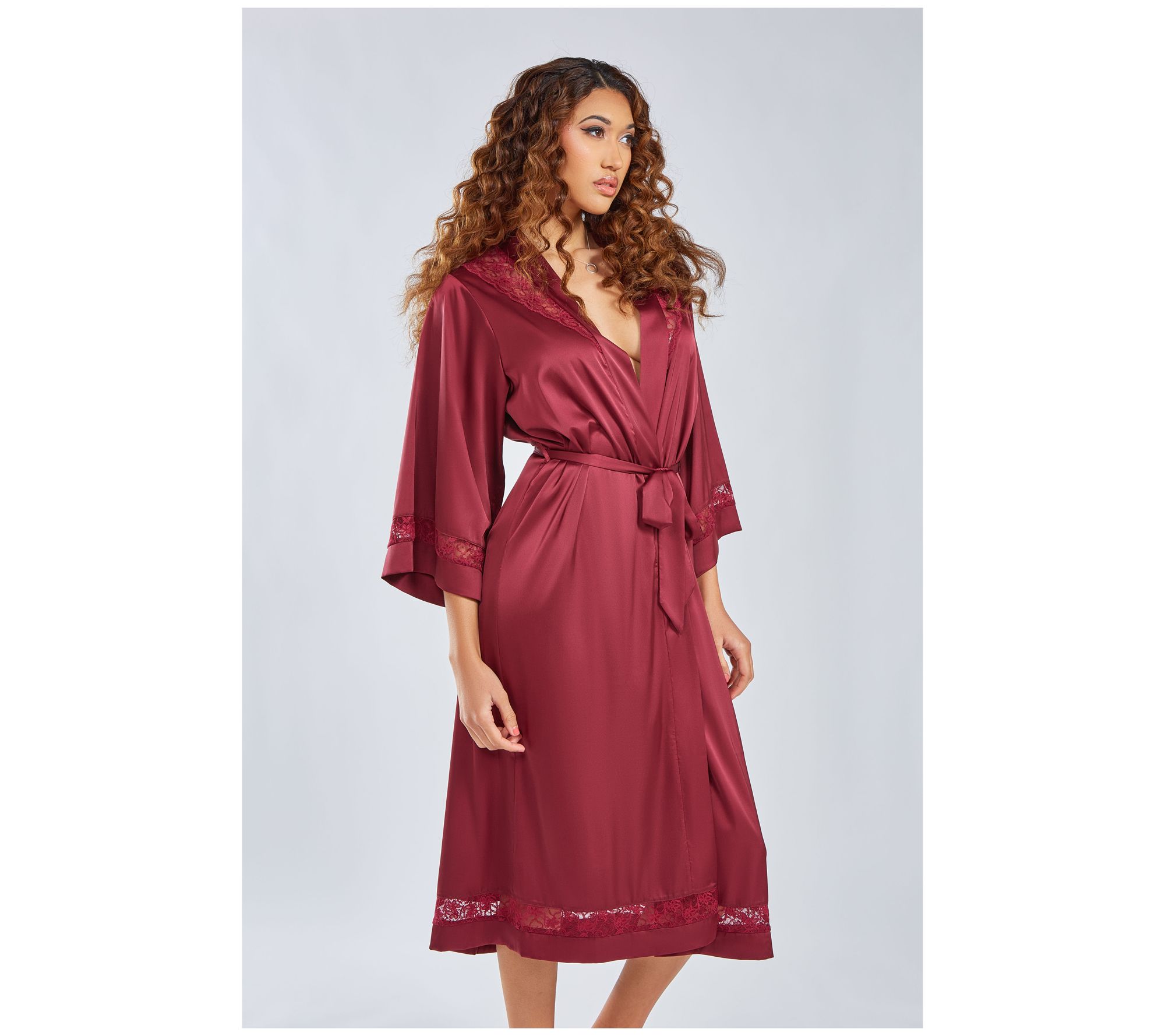 • Features: crossover placket, cutout lace accents, looped self-tie sash, inner ties, lace trim, 3/4-length kimono sleeves