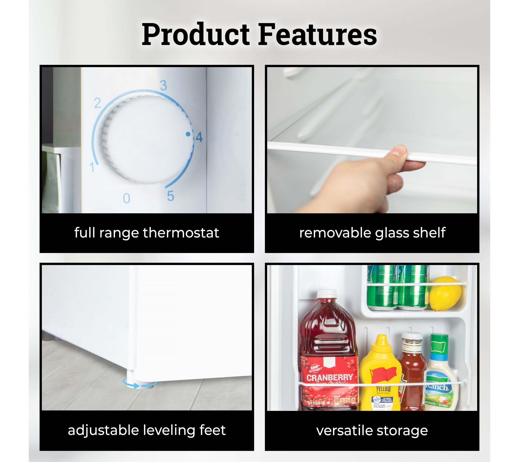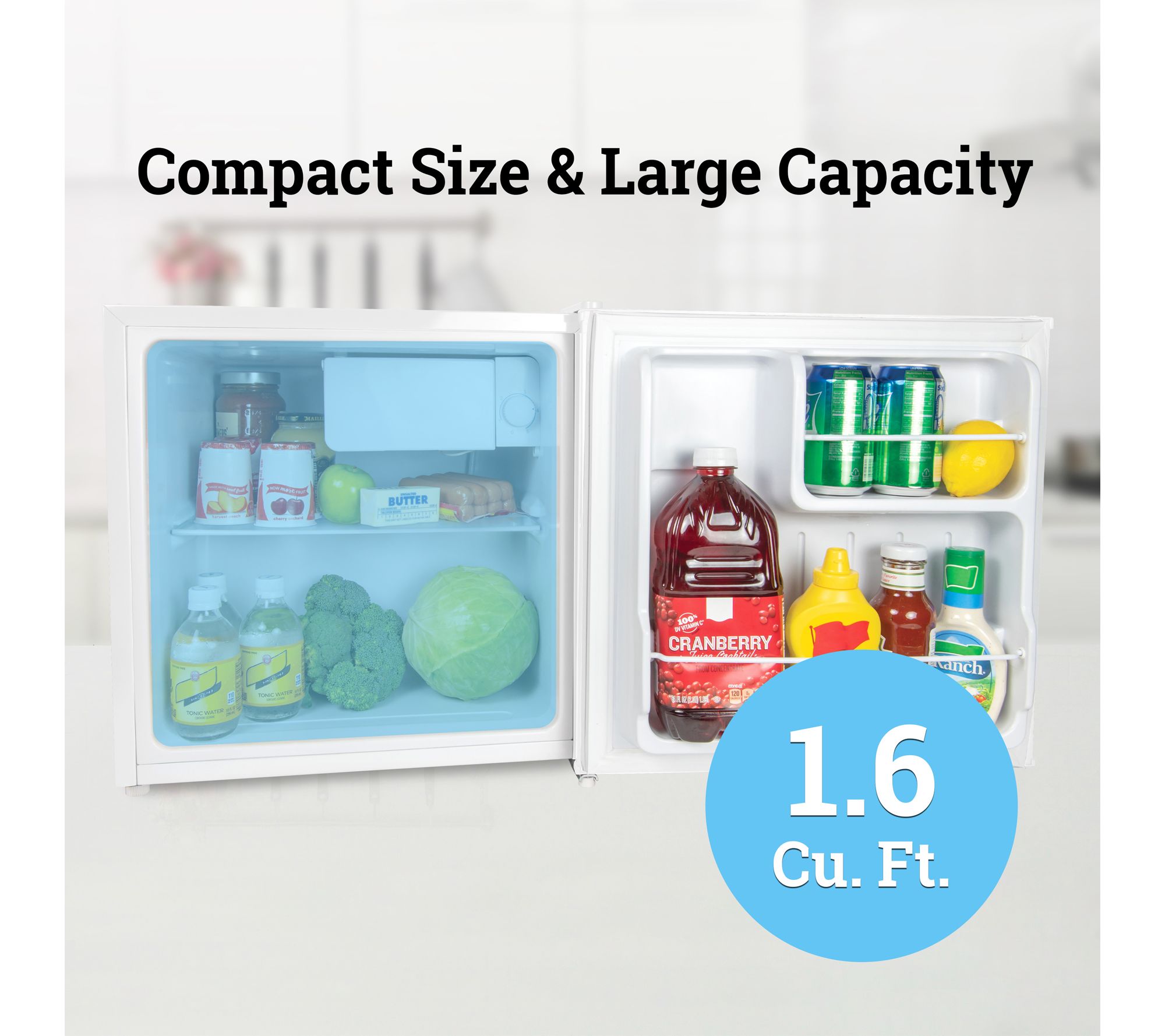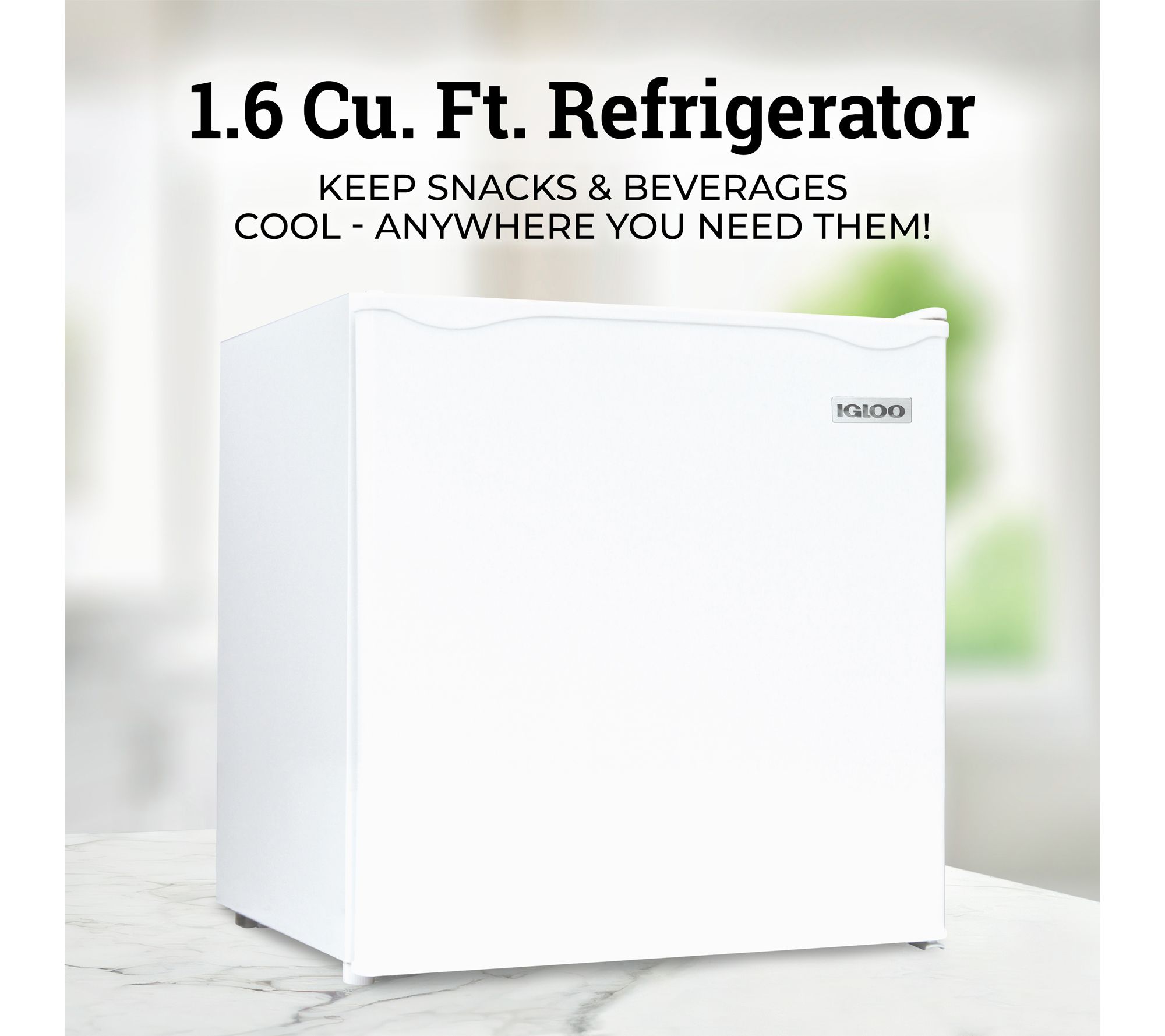 • 1.6 cu. ft. capacity stores snacks, beverages, and frozen foods