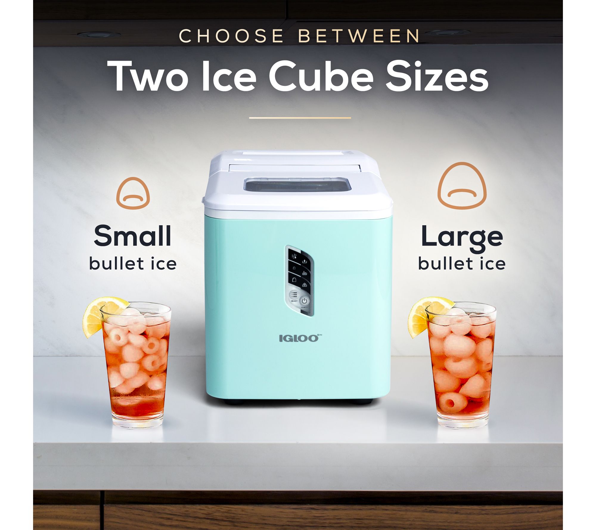 • Makes 9 small or large ice cubes in as little as 7 minutes; produces up to 26 lbs of ice in 24 hours; 1.5-quart water tank; 1.5 lb ice basket capacity; easy-to-use LED control panel with ice size selection and water/ice alerts; automatic self-cleaning cycle; transparent lid for easy viewing