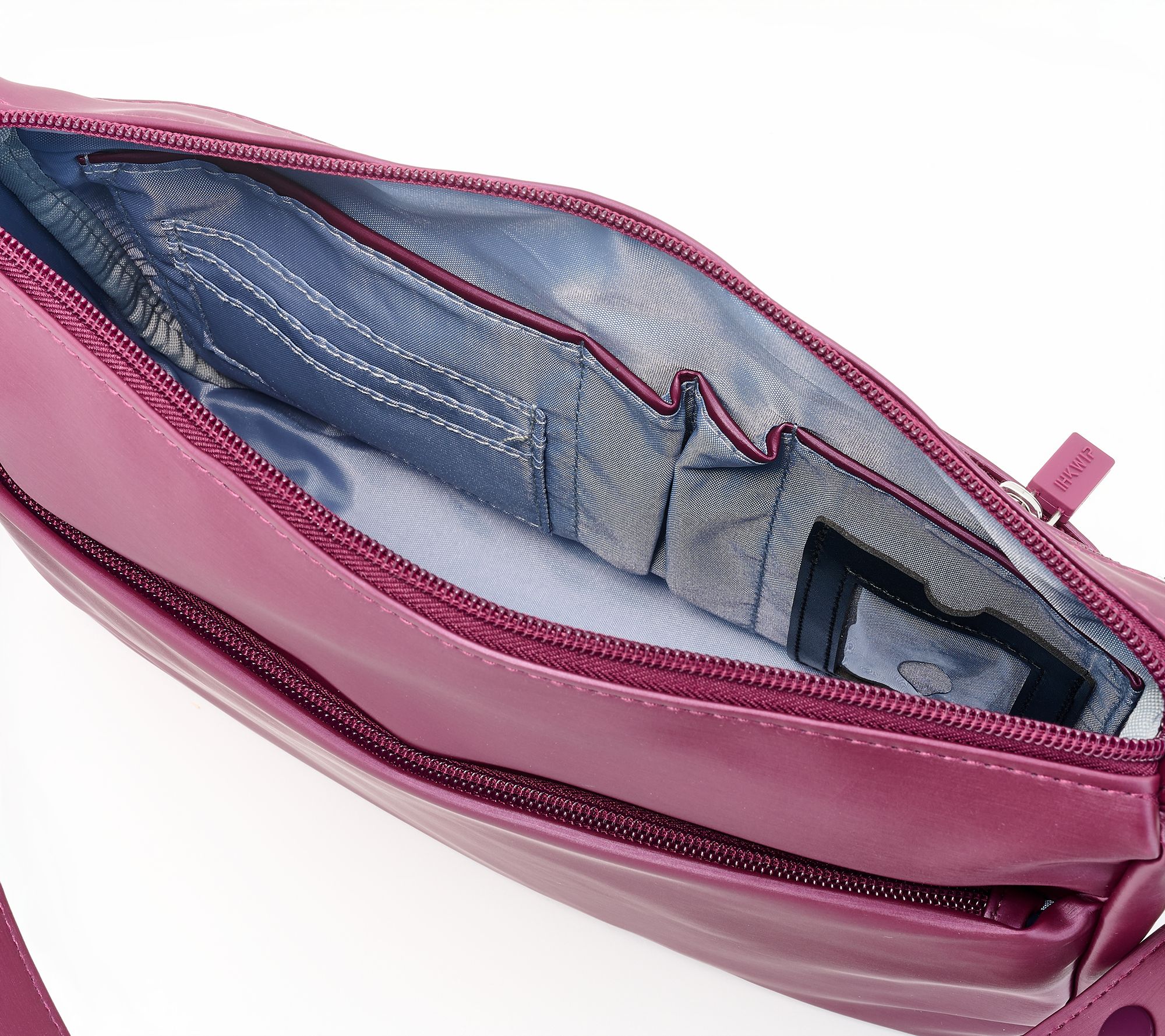 Water-repellent exterior, removable/adjustable crossbody strap, shoulder strap, main zip top closure, front zip pocket with key clip leash, rear zip pocket, bottom feet