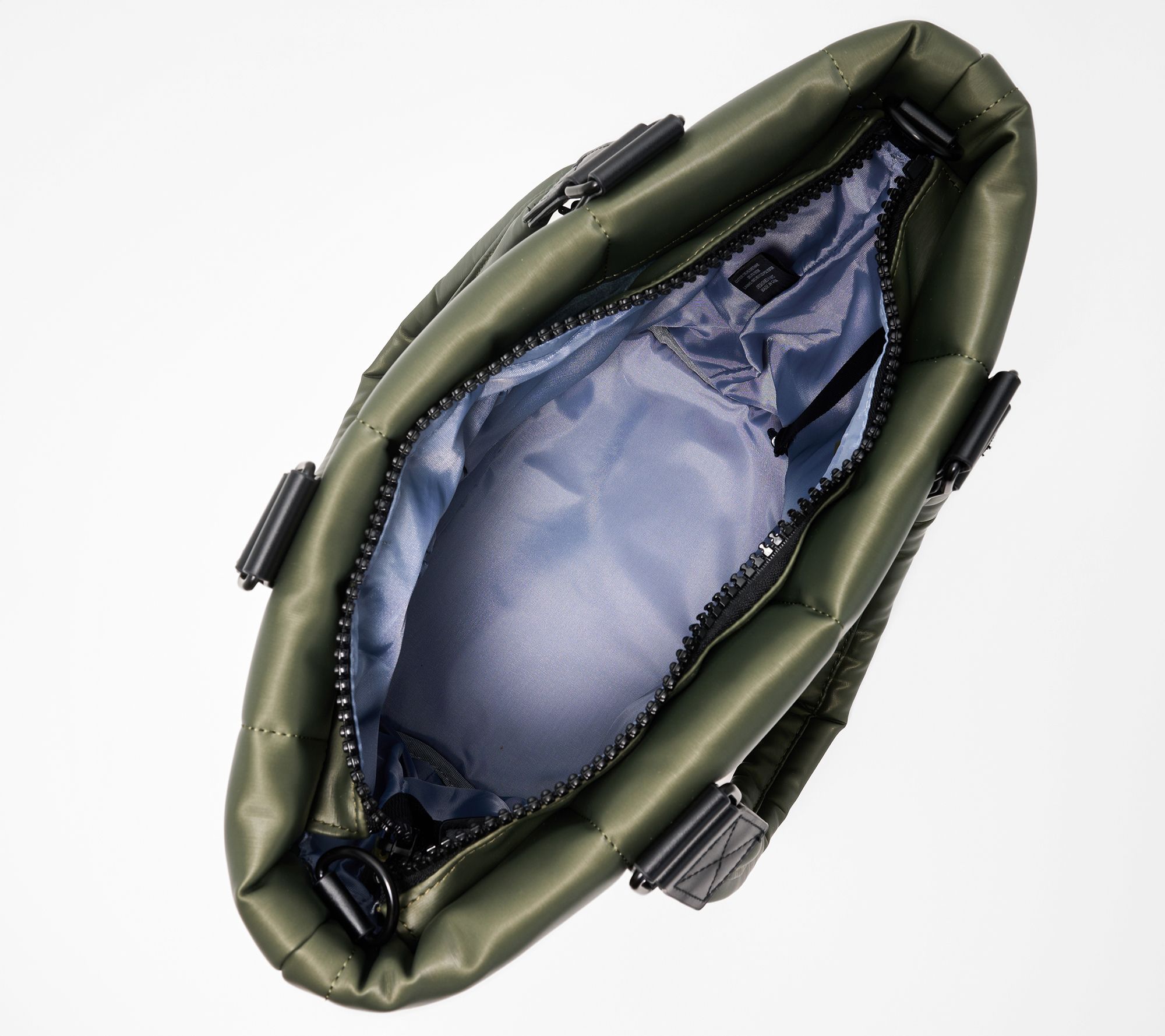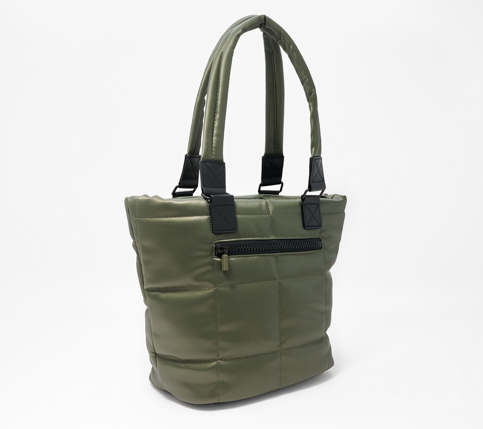 Water-repellent exterior, puffy quilted design, dual top handles, zip-top closure, rear zip pocket, purse feet, black hardware