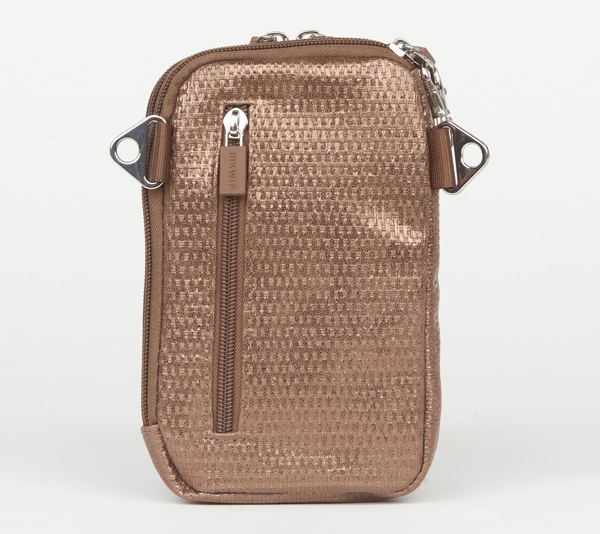 Removable and adjustable crossbody strap, front soft-touch lined pocket, exterior rear zipper pocket, anti-theft locking zippers