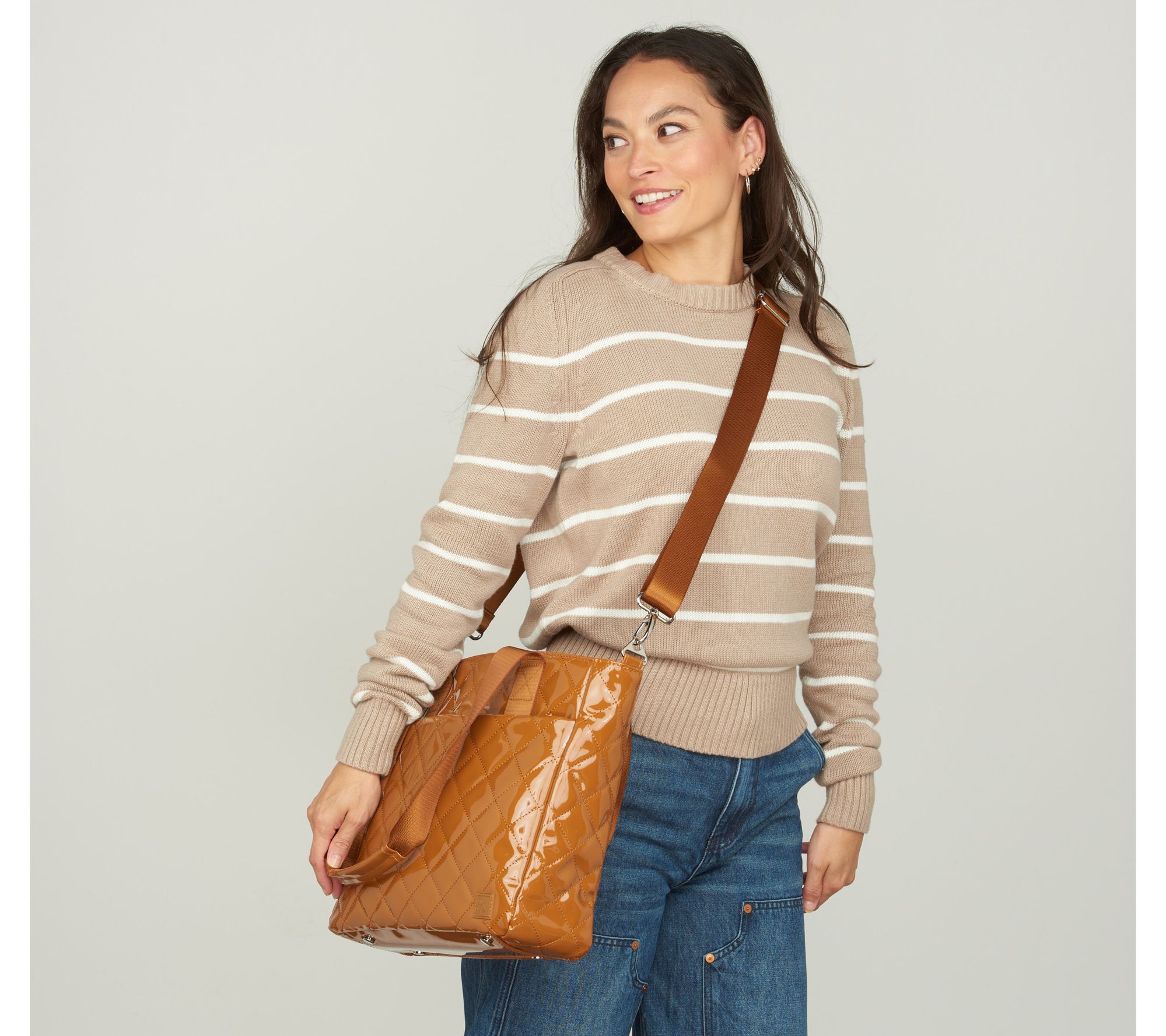 Measures 13"L x 4"W x 12"H with a 28" to 56" crossbody strap; weighs 1 lb, 5 oz