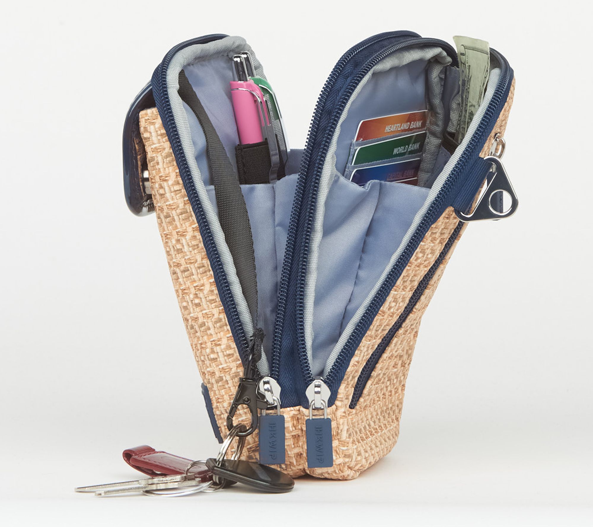 • Accordion design; removable/adjustable crossbody strap; front soft-lined pocket with magnetic snap; dual zip gusseted pocket with key clip leash, two pen loops, and slip pocket; rear gusseted zip pocket; built-in RFID card slots