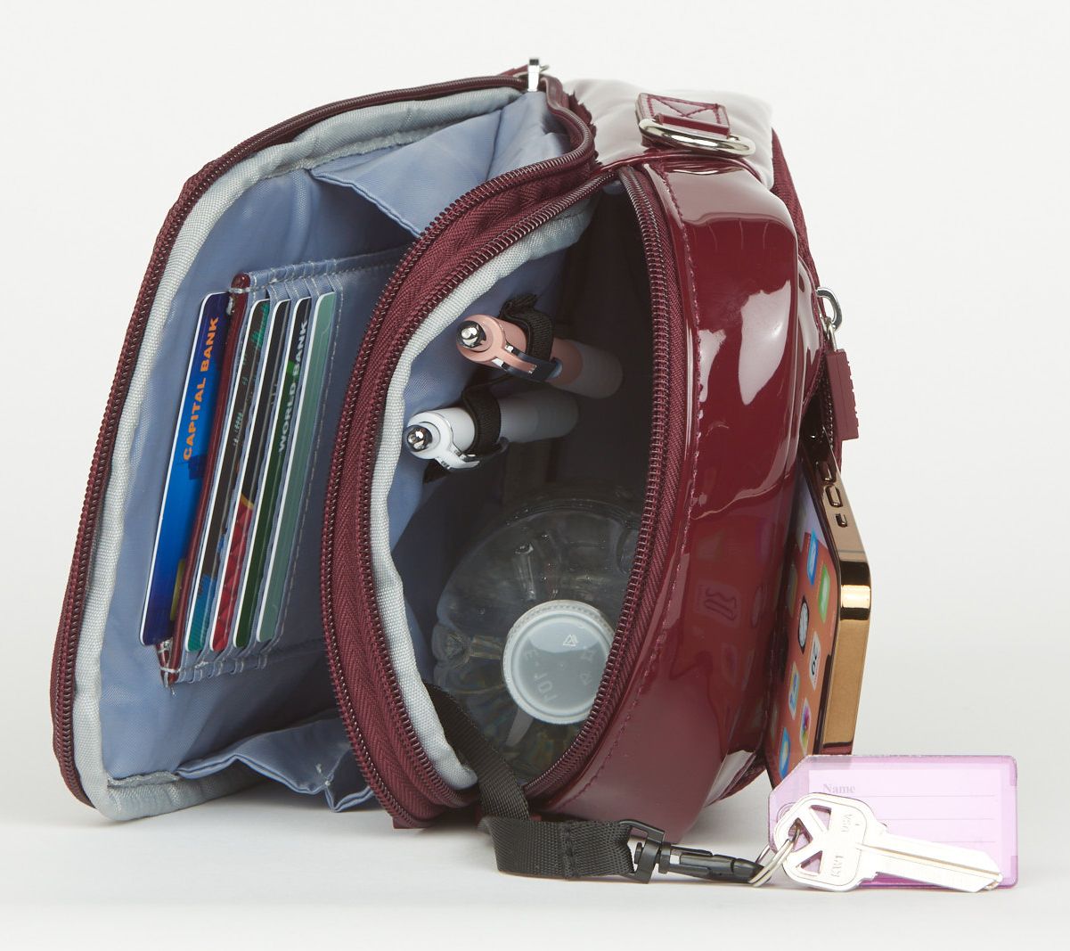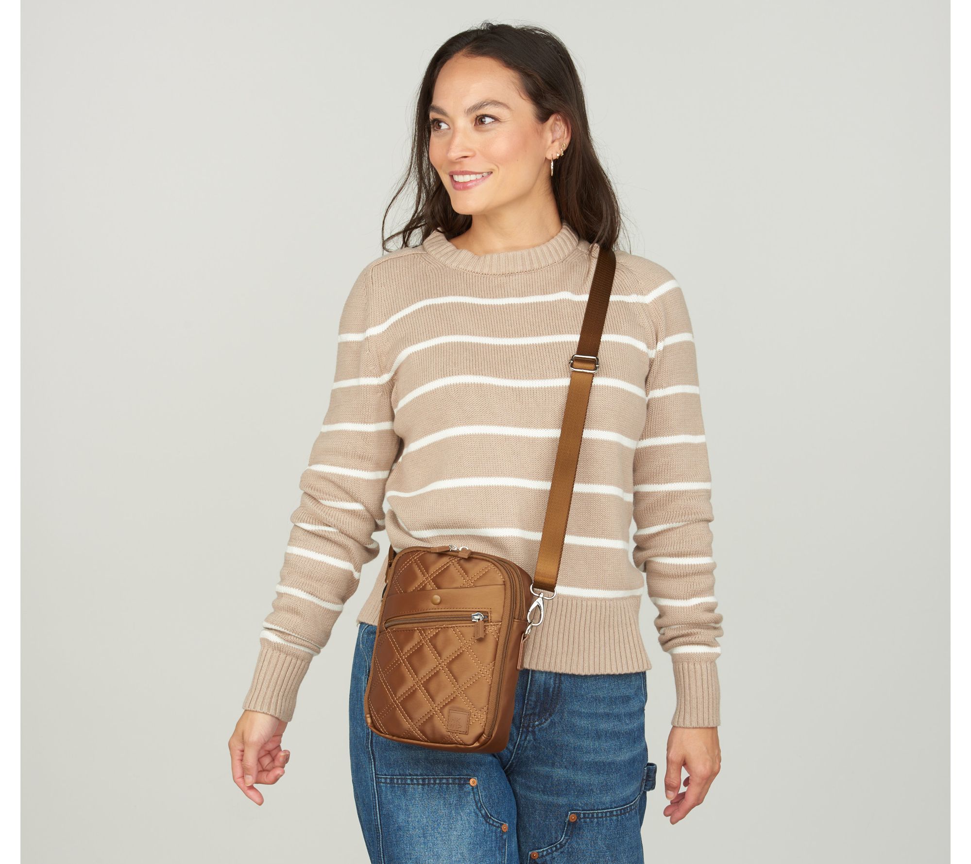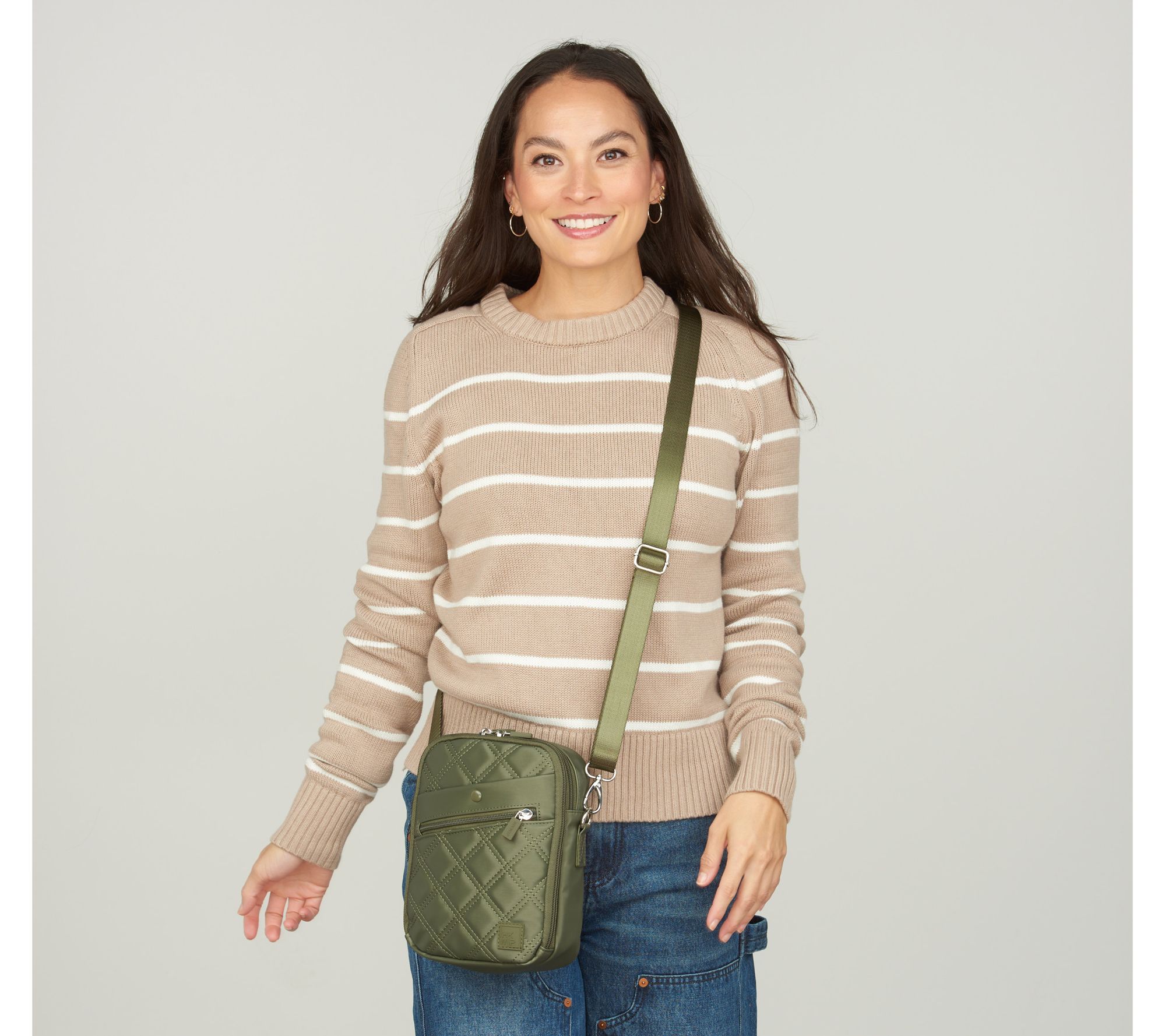 Quilted design, removable/adjustable crossbody strap, dual-zip top closure with gussets, front snap pocket and zip pocket, rear soft-lined cell phone/glasses zip pocket