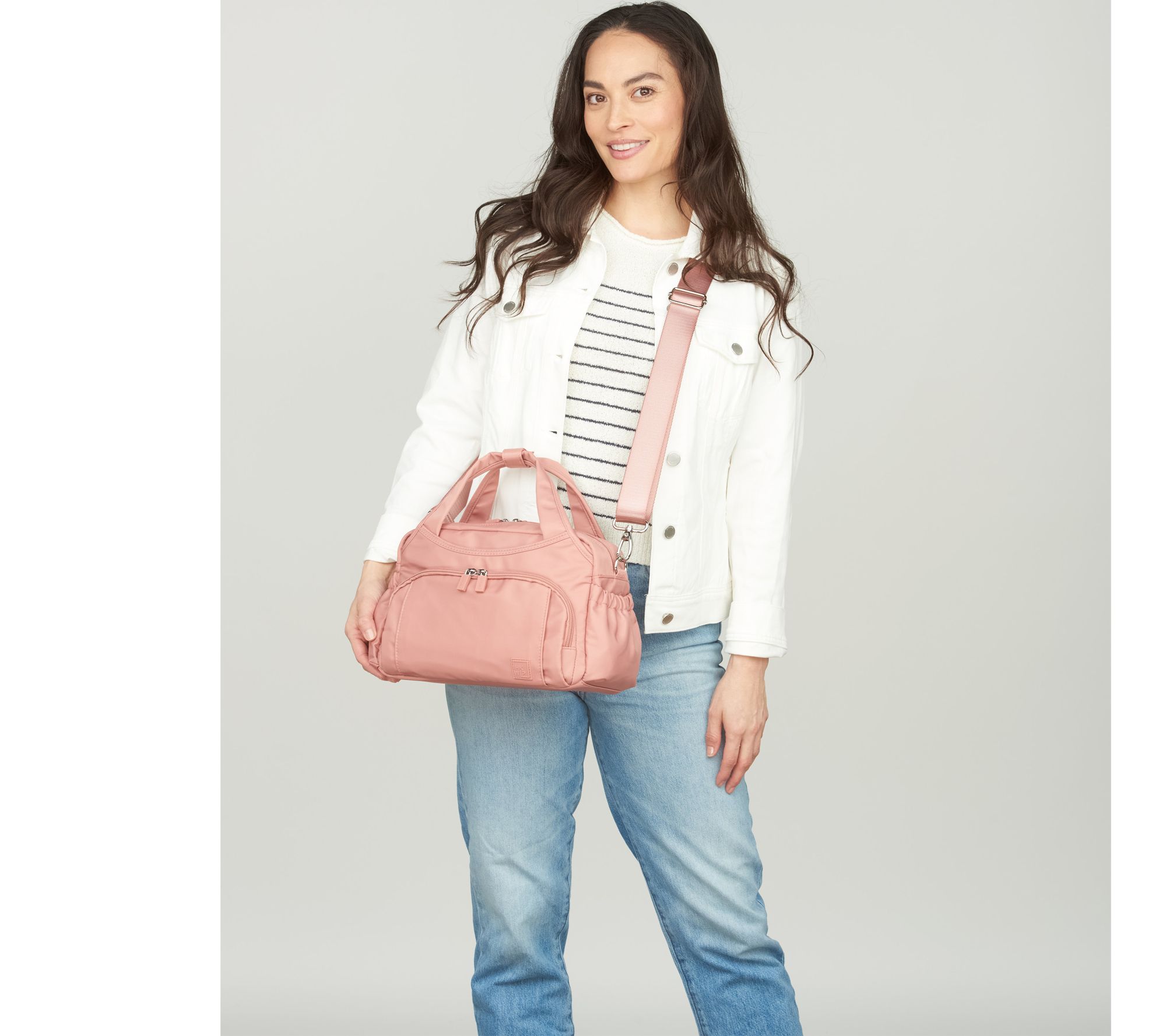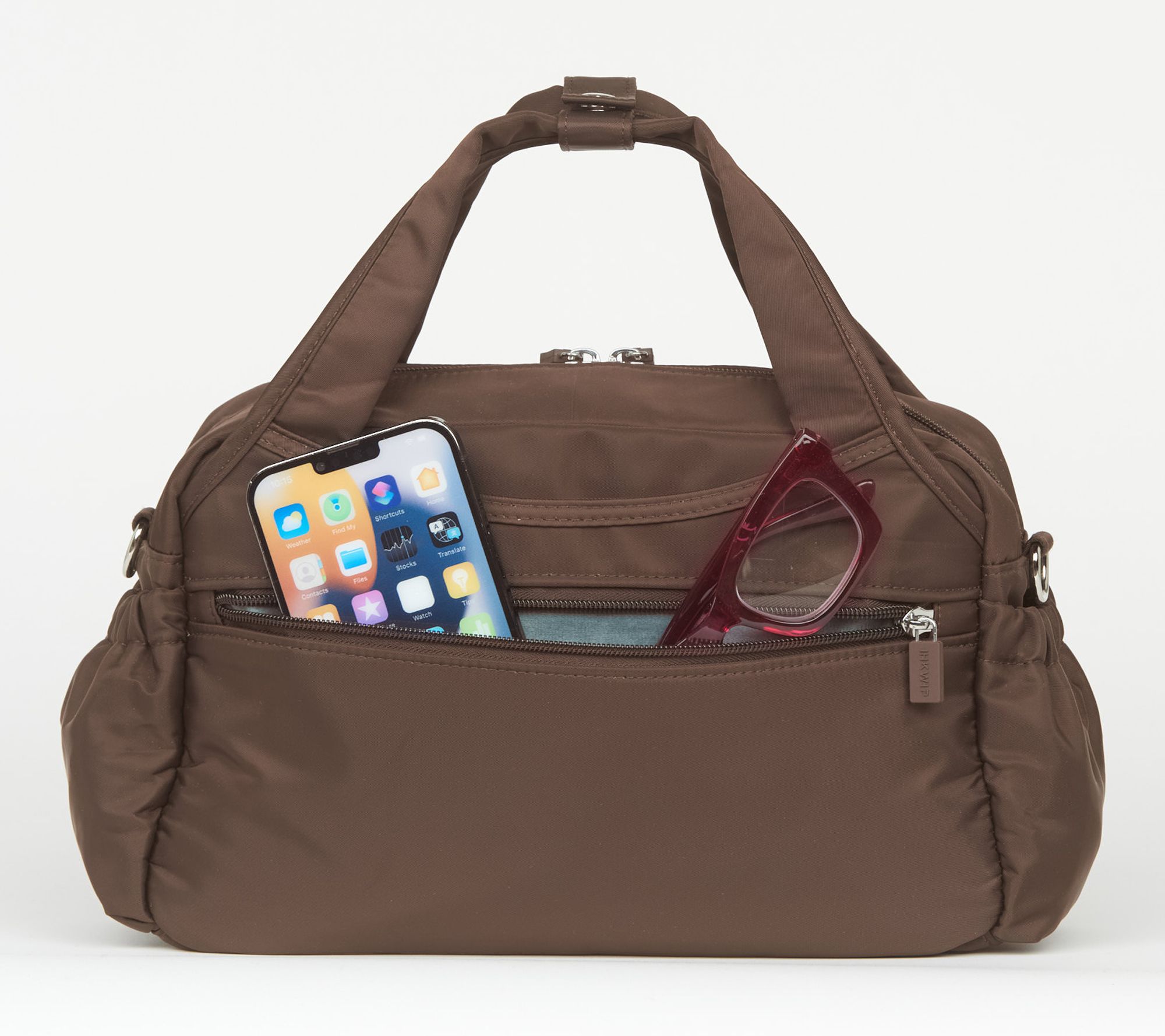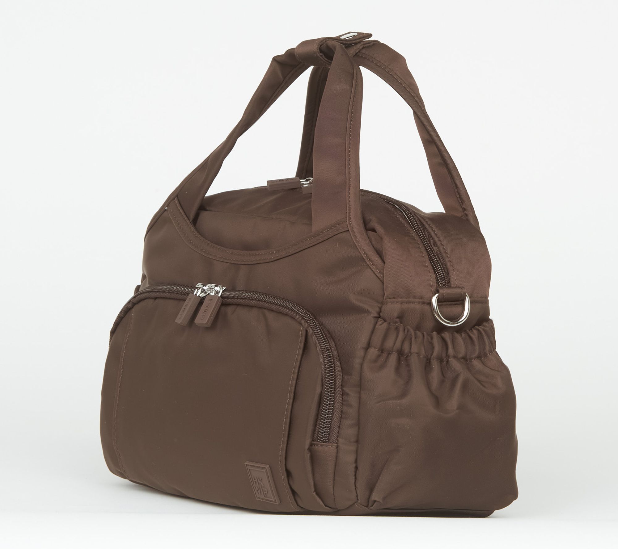 Removable/adjustable crossbody strap, snap closure for handles, two side elastic cargo pockets, dual zip gusseted front pocket, rear soft-lined zip pocket