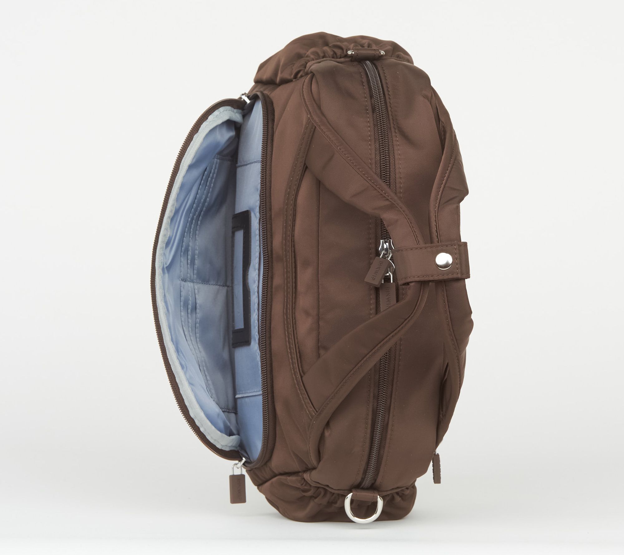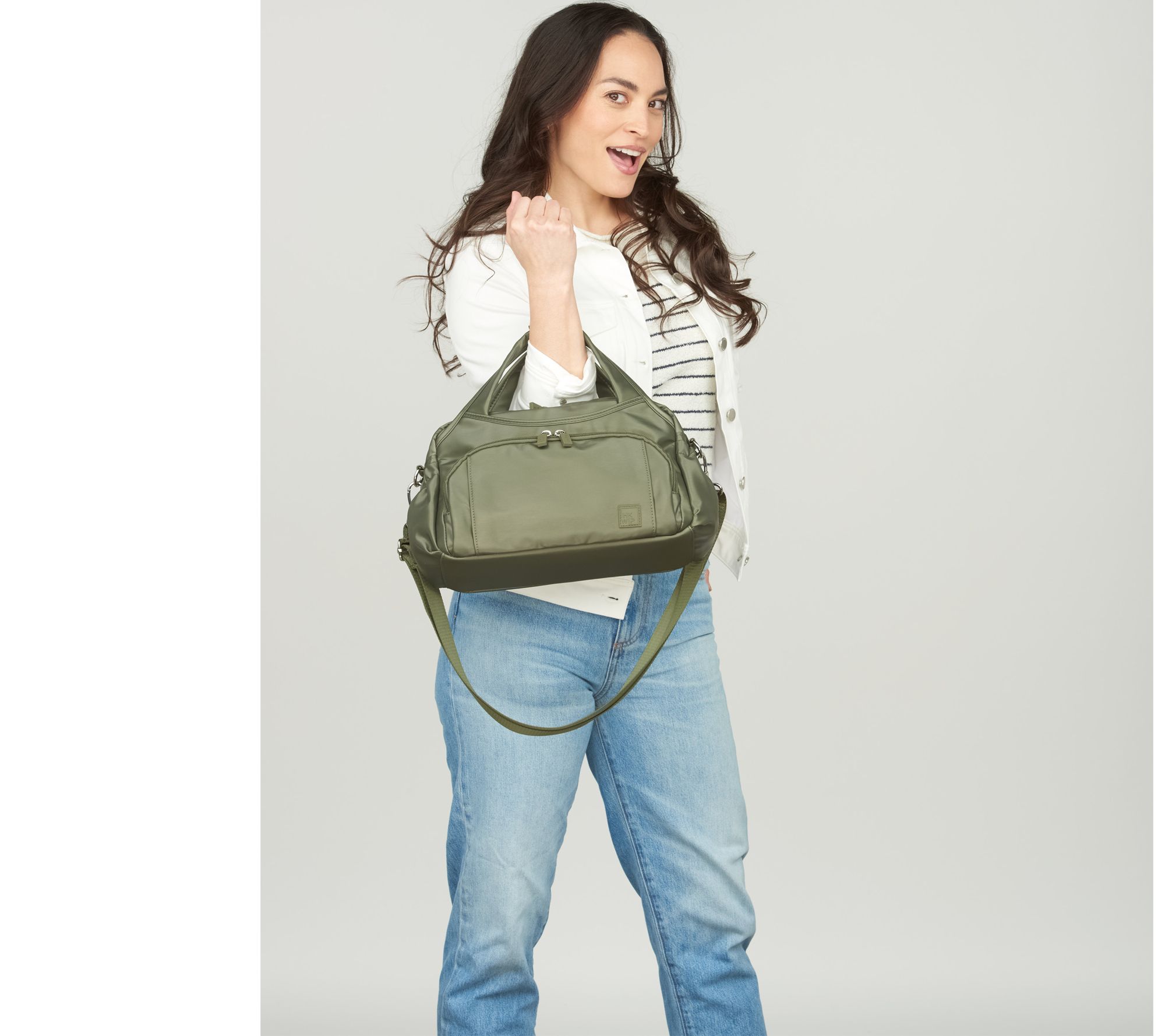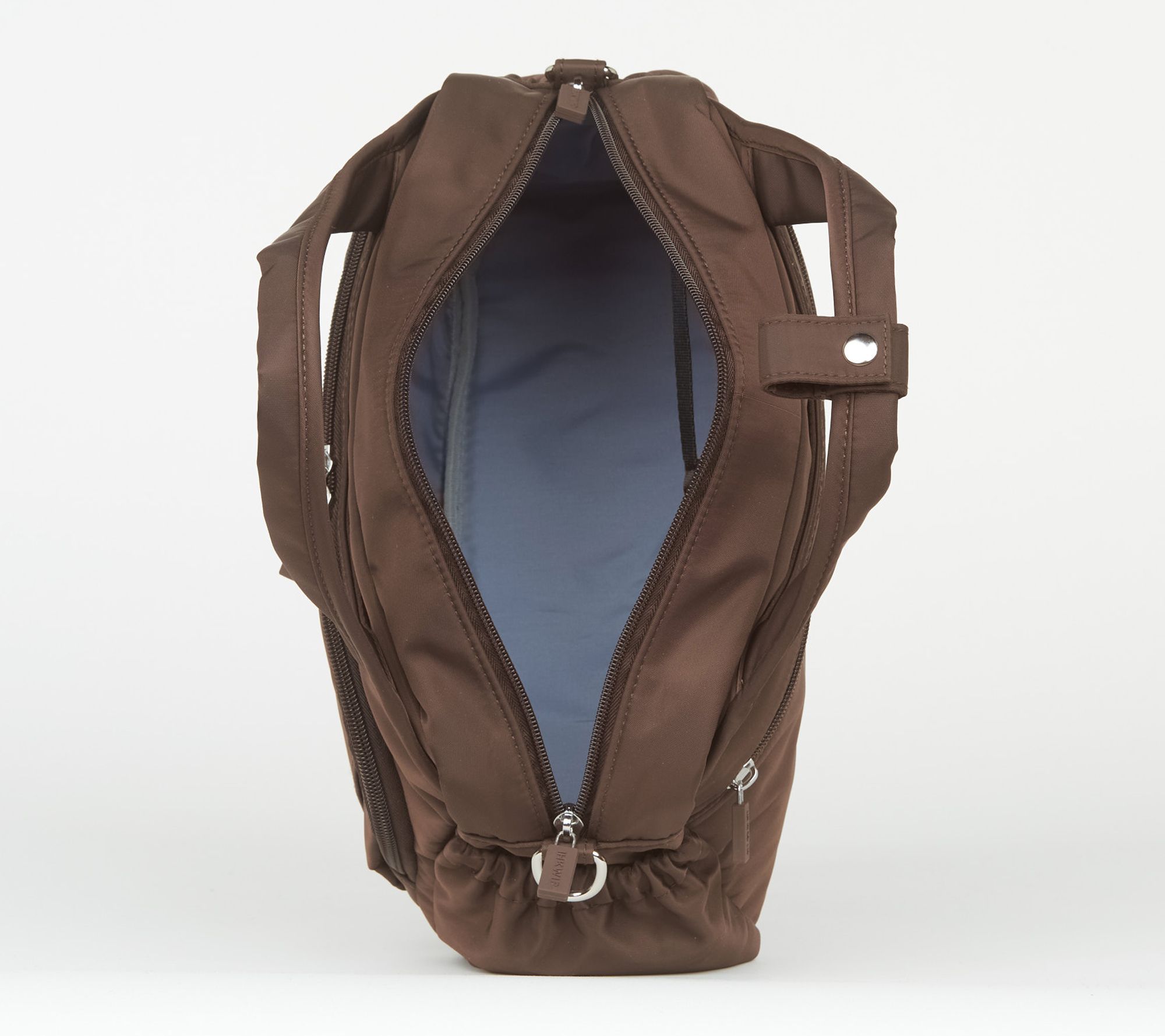 Removable/adjustable crossbody strap, snap closure for handles, two side elastic cargo pockets, dual zip gusseted front pocket, rear soft-lined zip pocket
