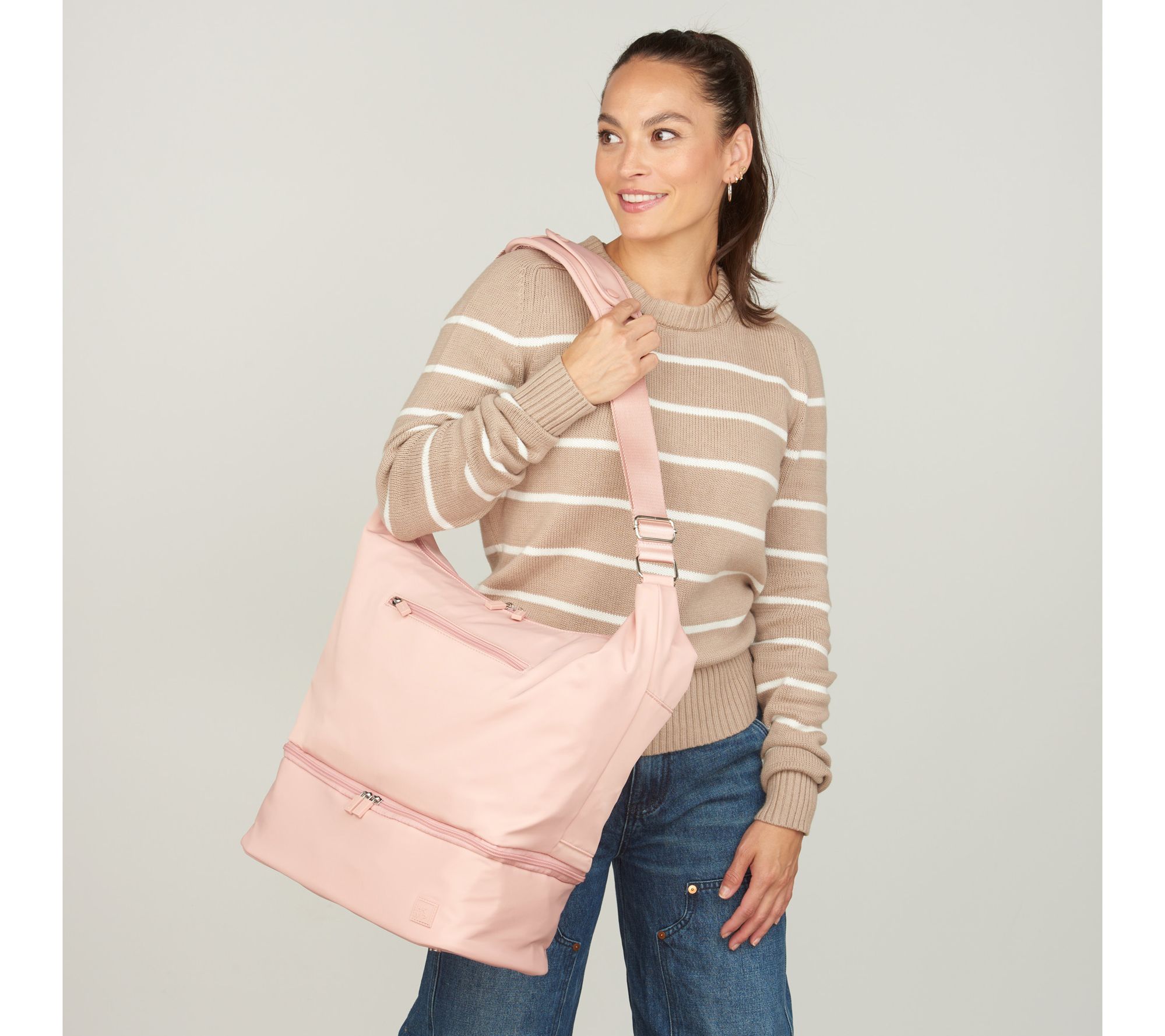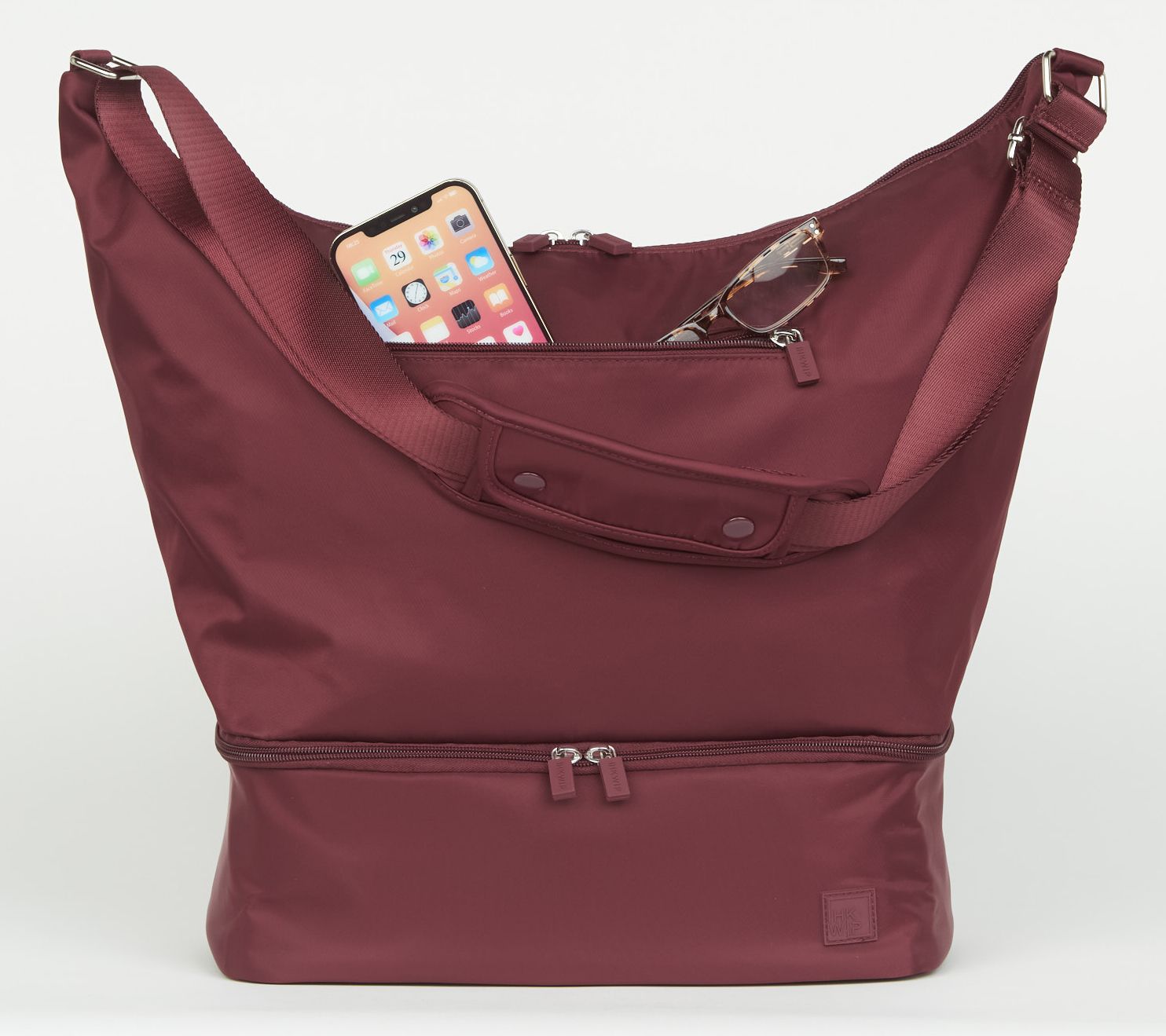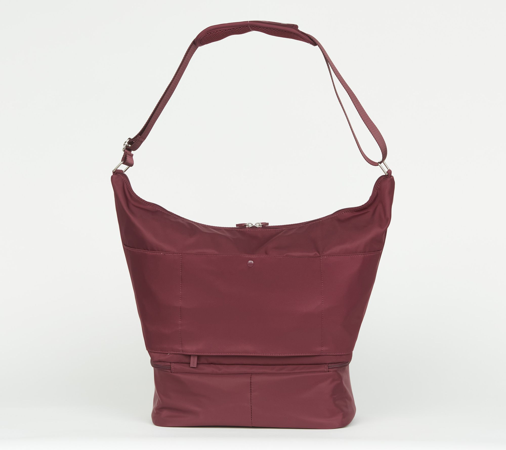 Adjustable crossbody strap with removable padded shoulder attachment, main dual zip-top closure, zip shoe compartment with wipeable lining at the bottom, convertible trolley sleeve rear pocket