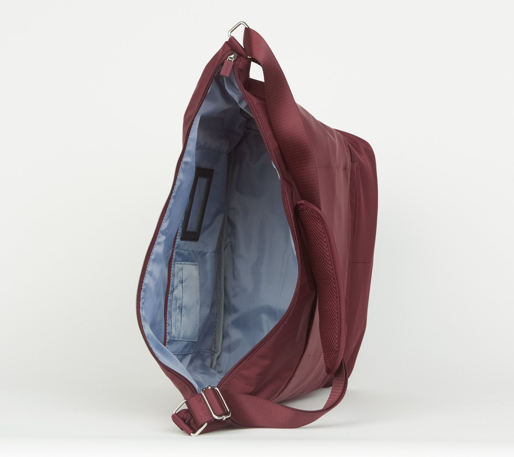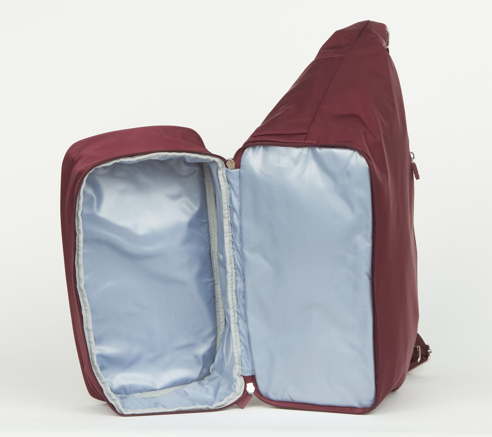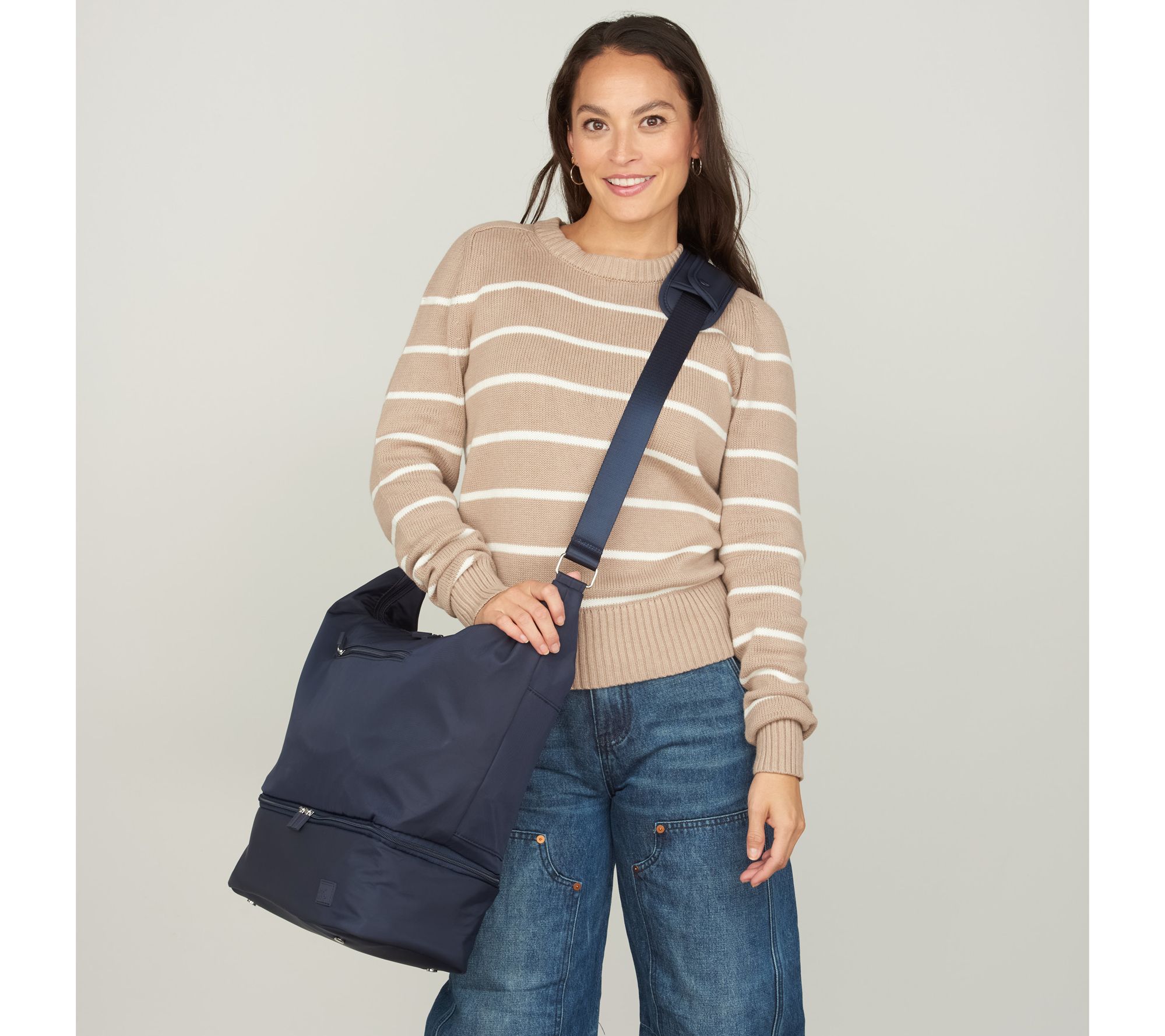 Adjustable crossbody strap with removable padded shoulder attachment, main dual zip-top closure, zip shoe compartment with wipeable lining at the bottom, convertible trolley sleeve rear pocket
