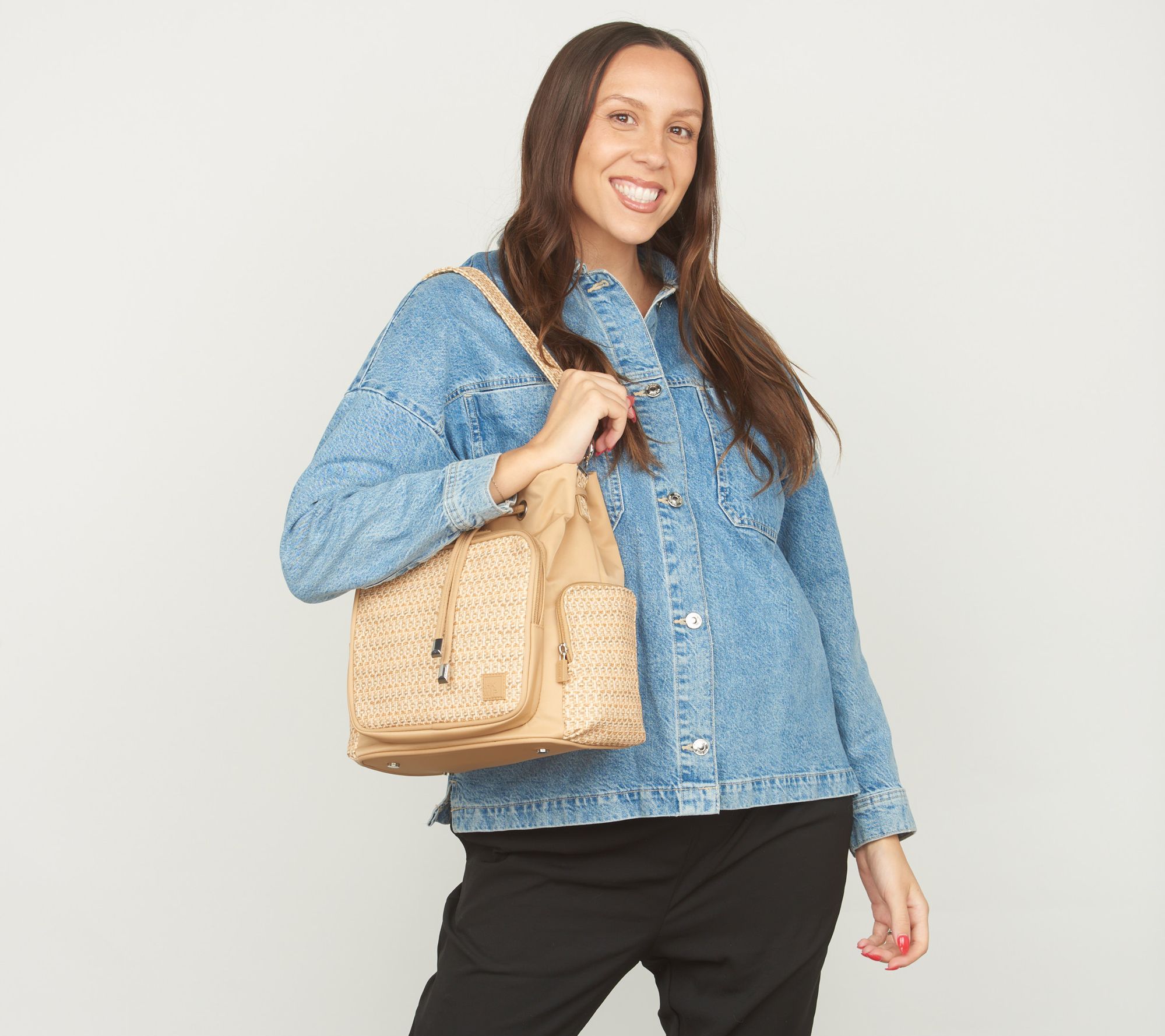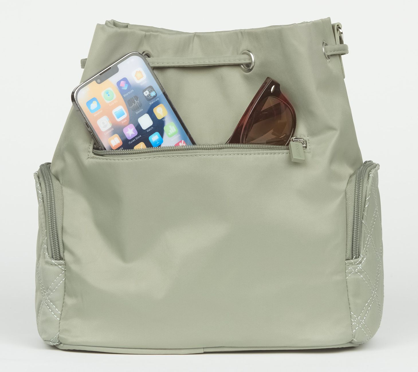 Water-repellent exterior, removable/adjustable crossbody strap, removable shoulder strap, drawstring cinch closure with magnet, two side zip pockets