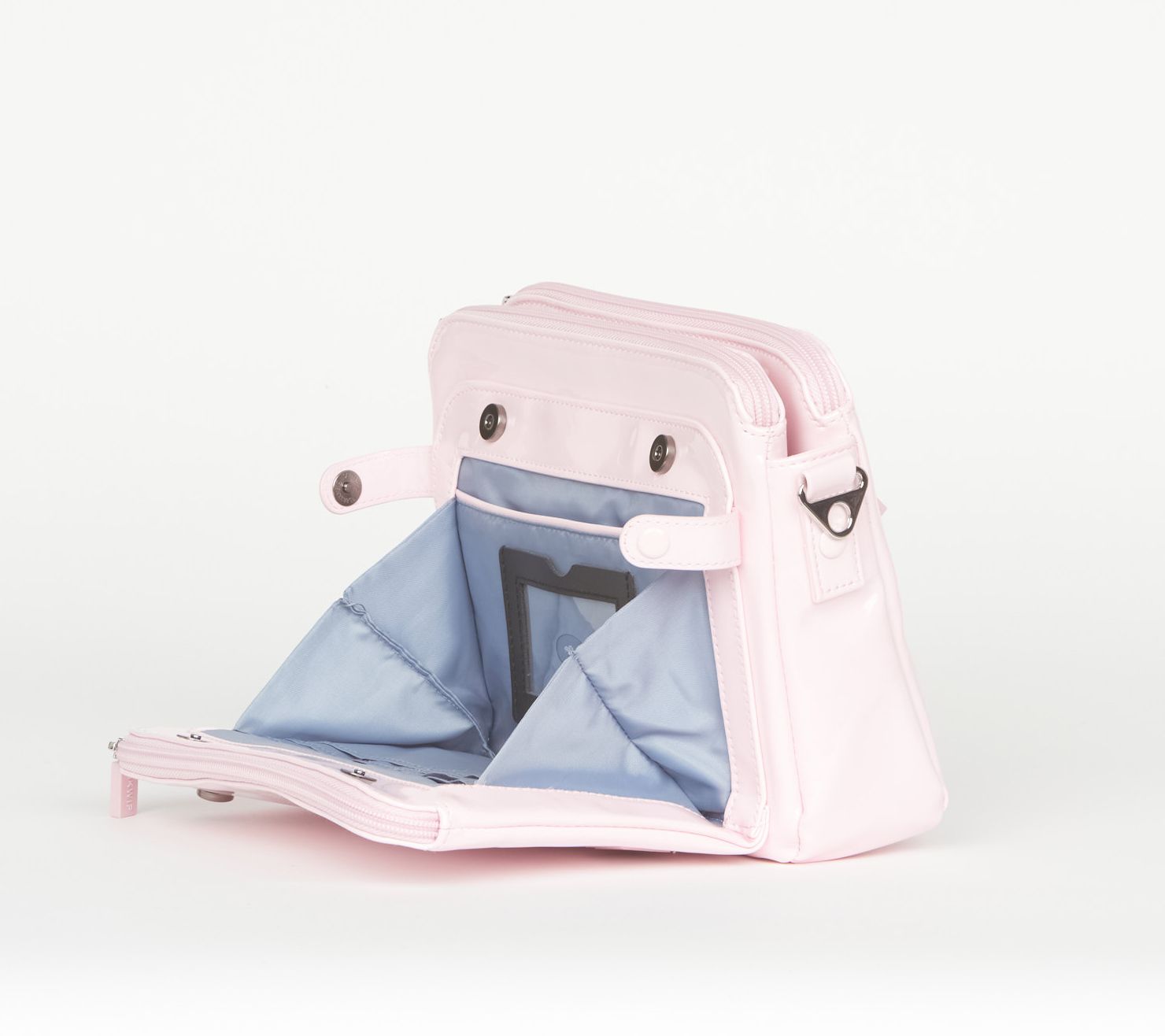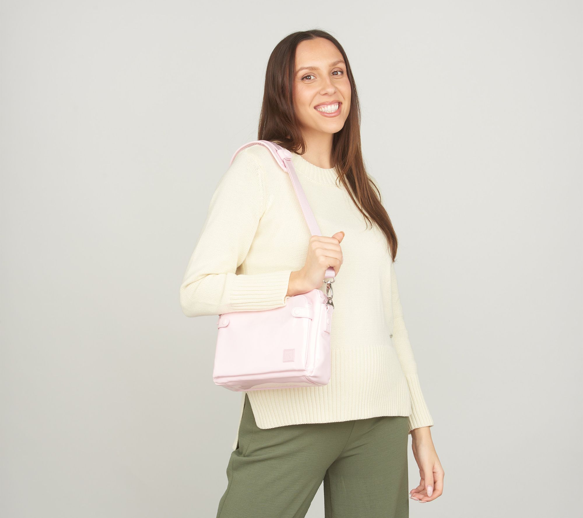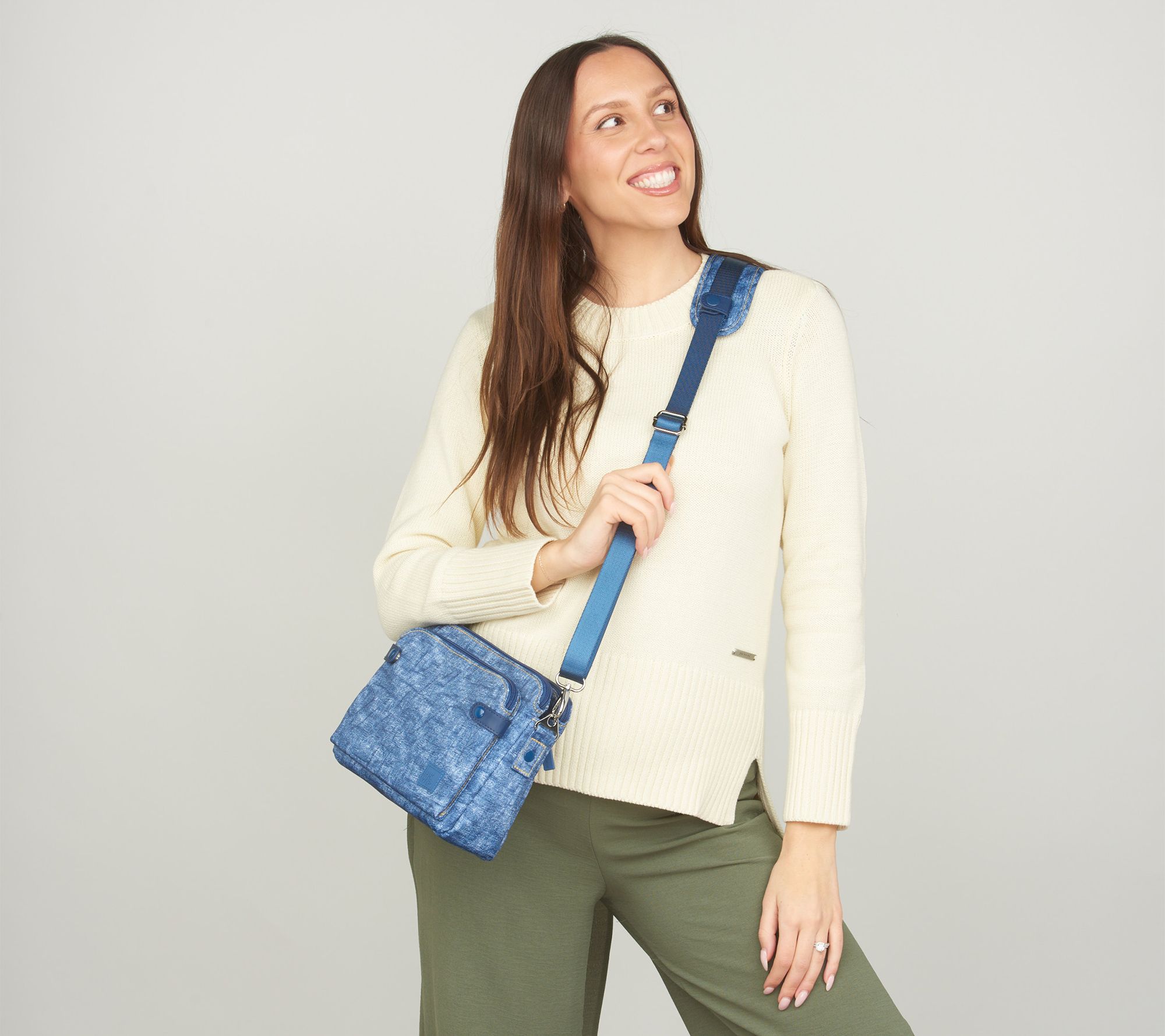 • Water-repellent, removable/adjustable crossbody strap with removable shoulder pad, triple-entry top with two zipper compartments and middle snap pocket, rear zip pocket, soft-lined phone pocket