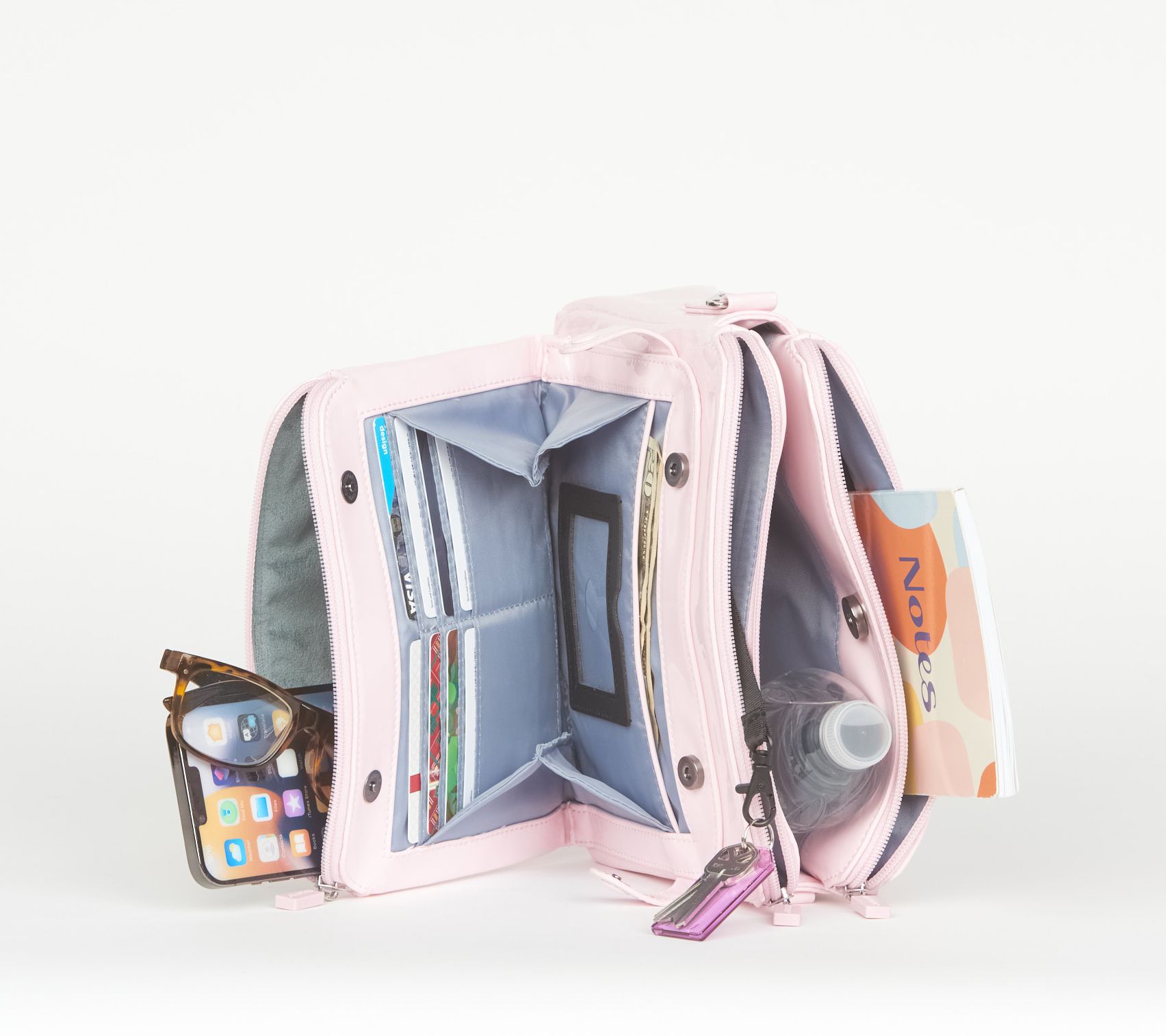 • Lined interior, two slip pockets, key clip, pen holder