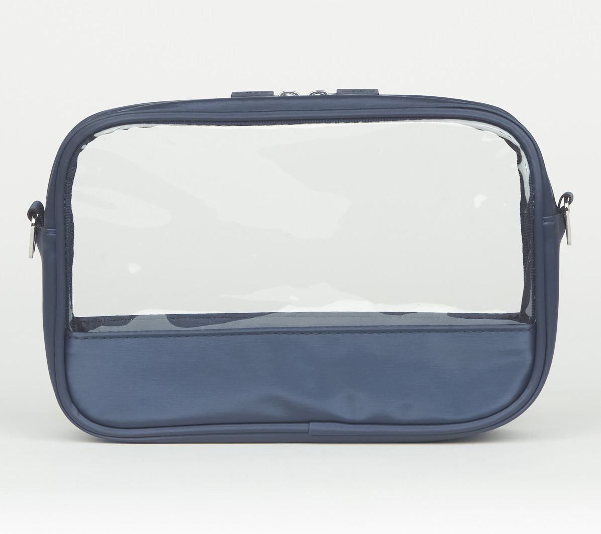 Water-repellent exterior, clear body, removable/adjustable crossbody strap, dual zip main entry, wear crossbody or on shoulder