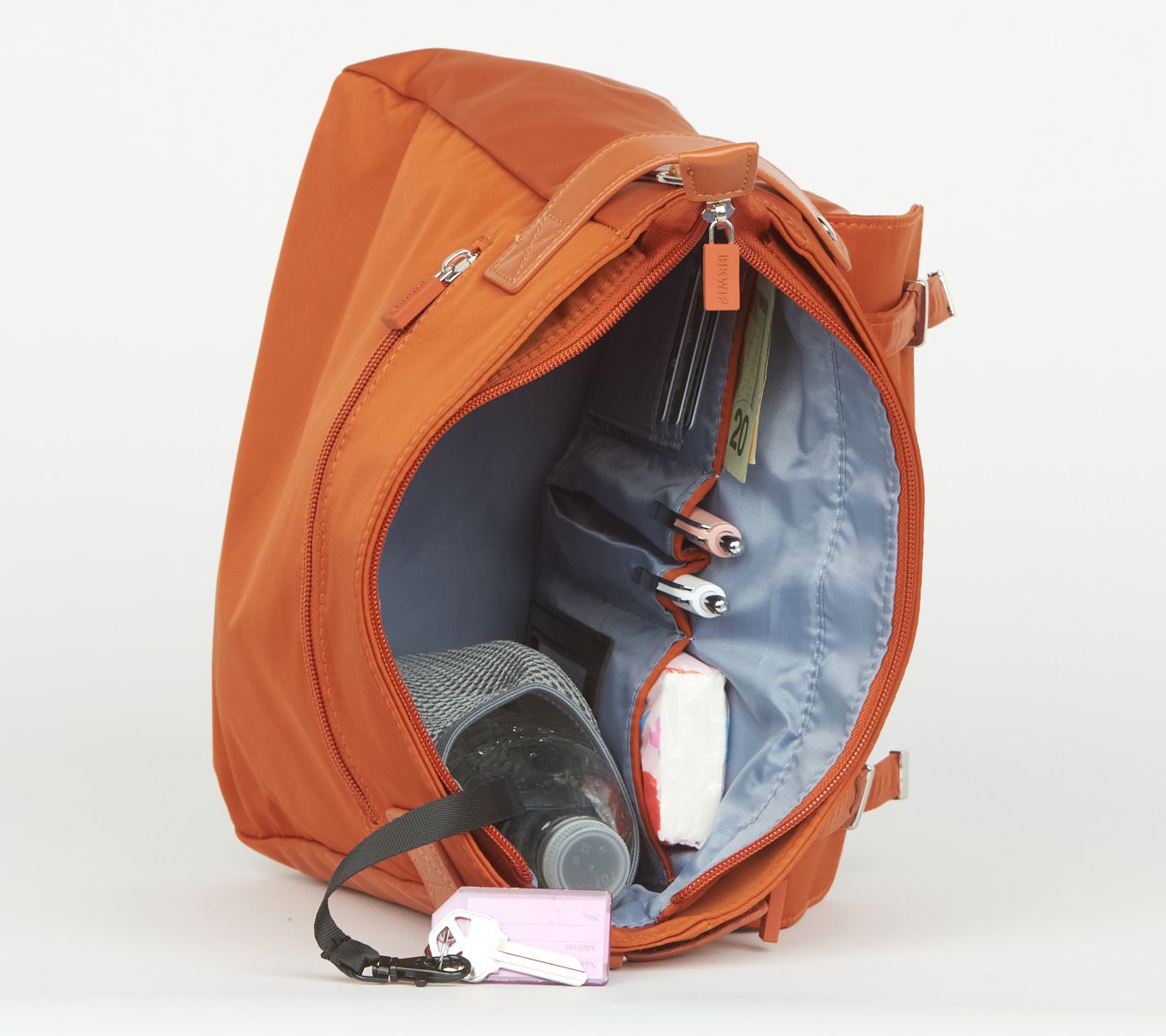 Lined interior, bottle holder, key clip leash, two slip pockets, privacy zip pocket; built-in RFID wallet with card slots and ID window, two pen holders, soft-lined cellphone and glasses zip pocket
