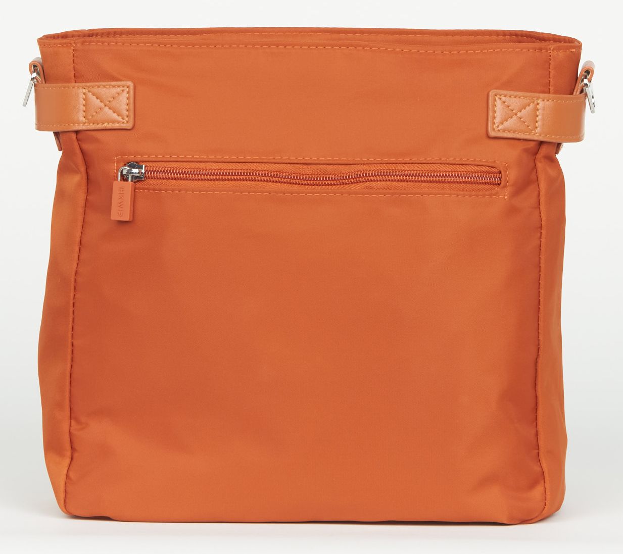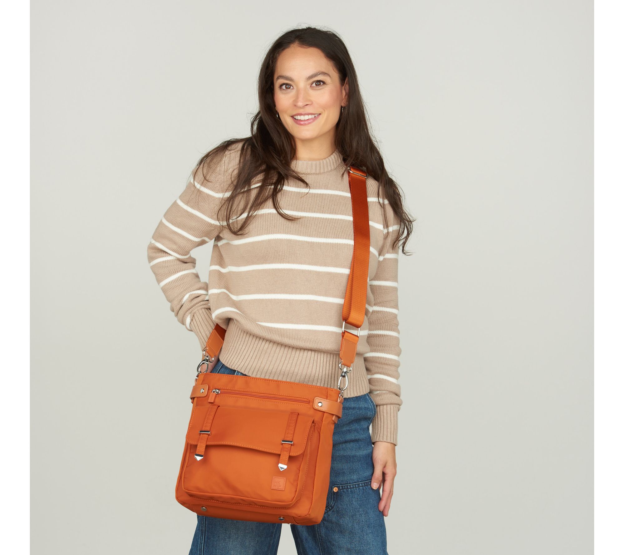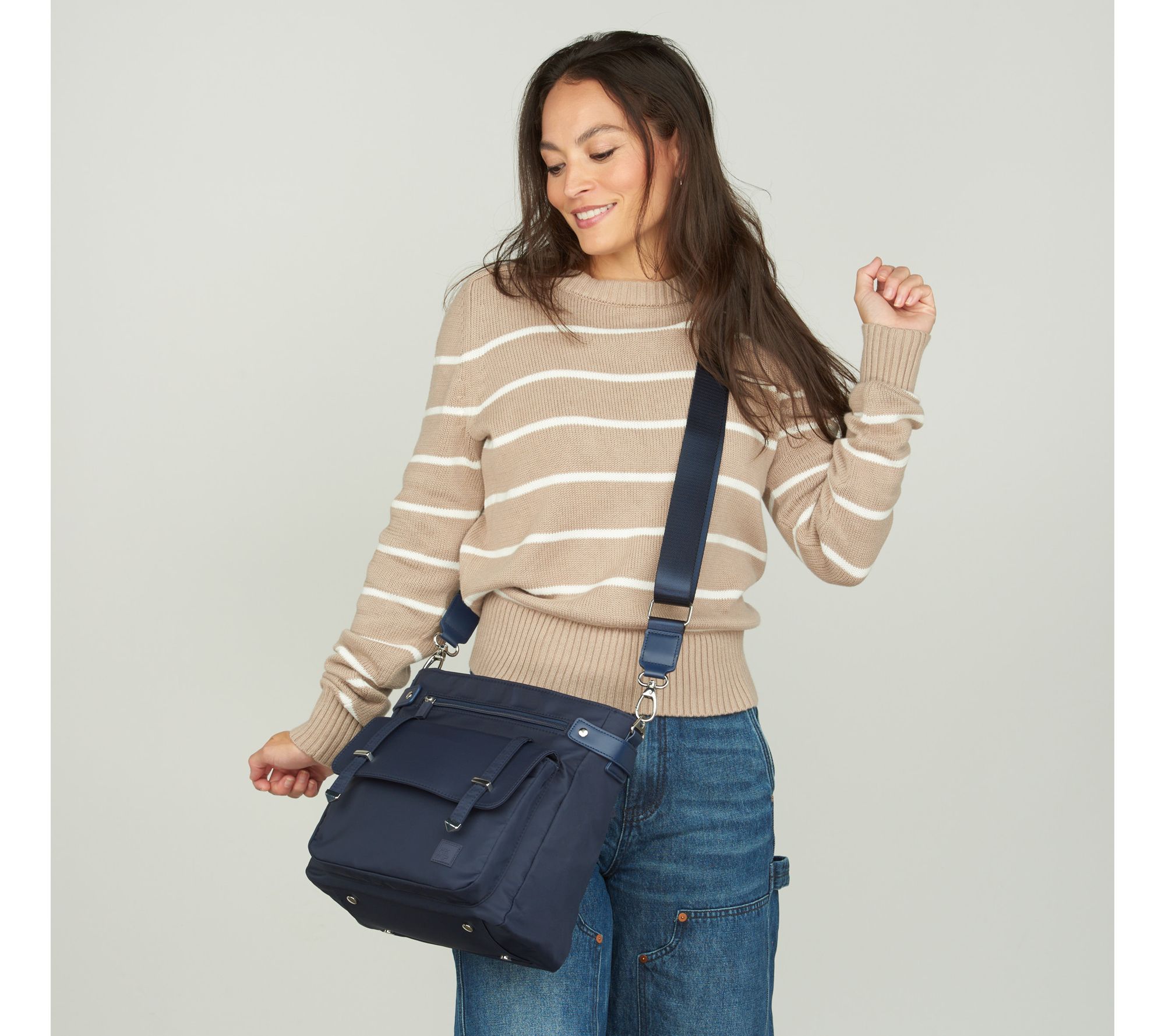 Removable/adjustable crossbody strap, main zip top closure, front flap pocket with hardware detail, rear exterior zip pocket