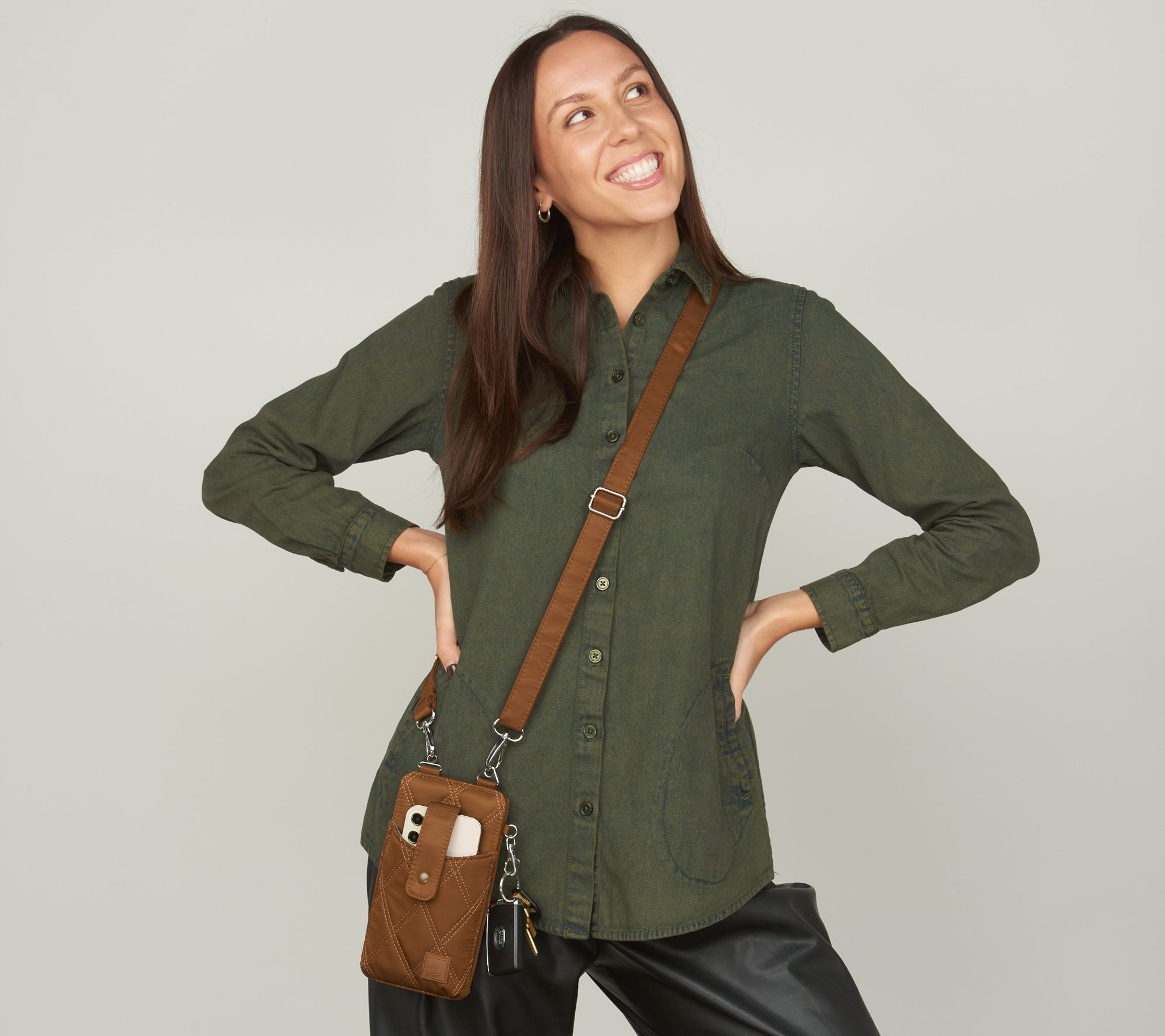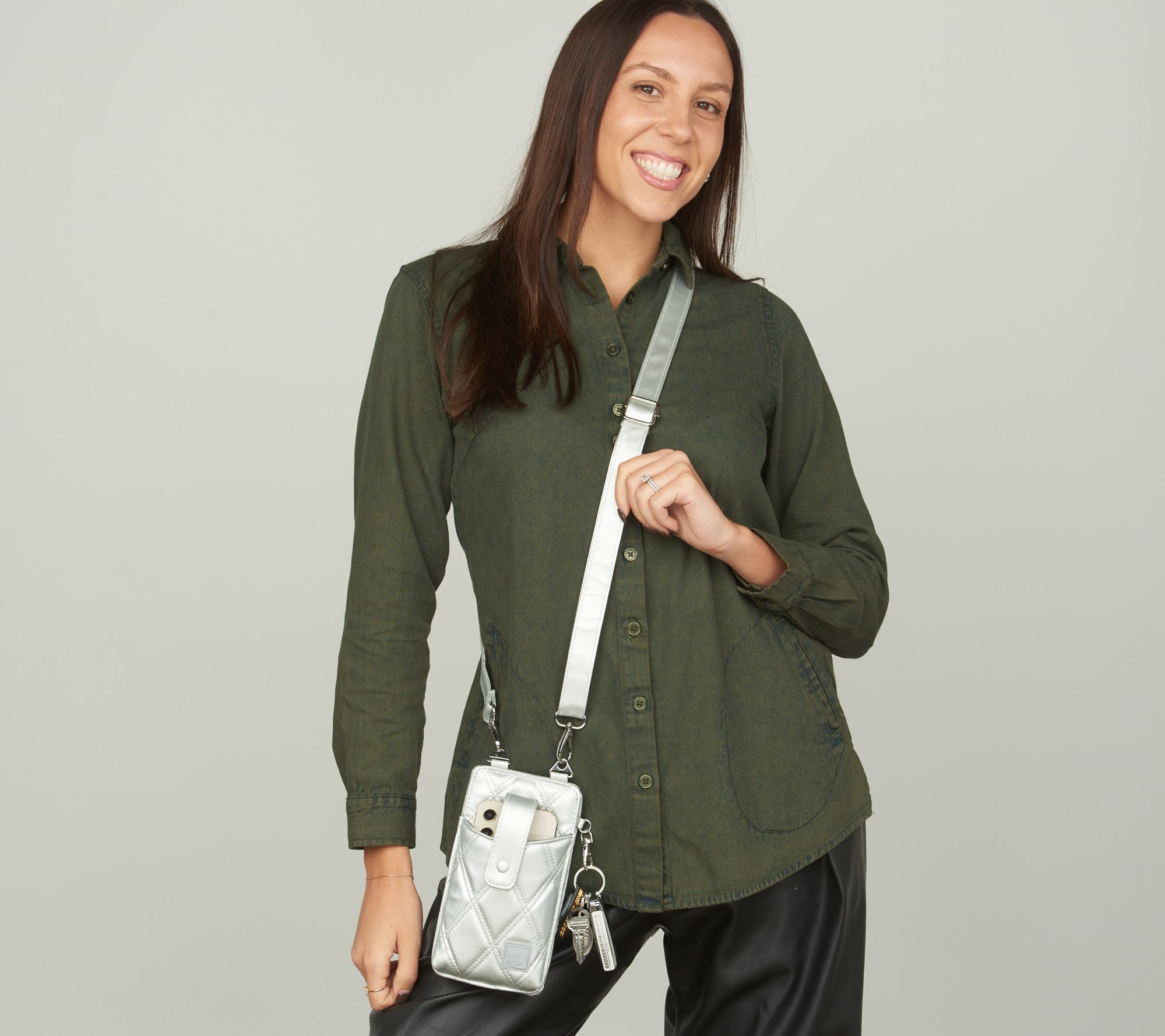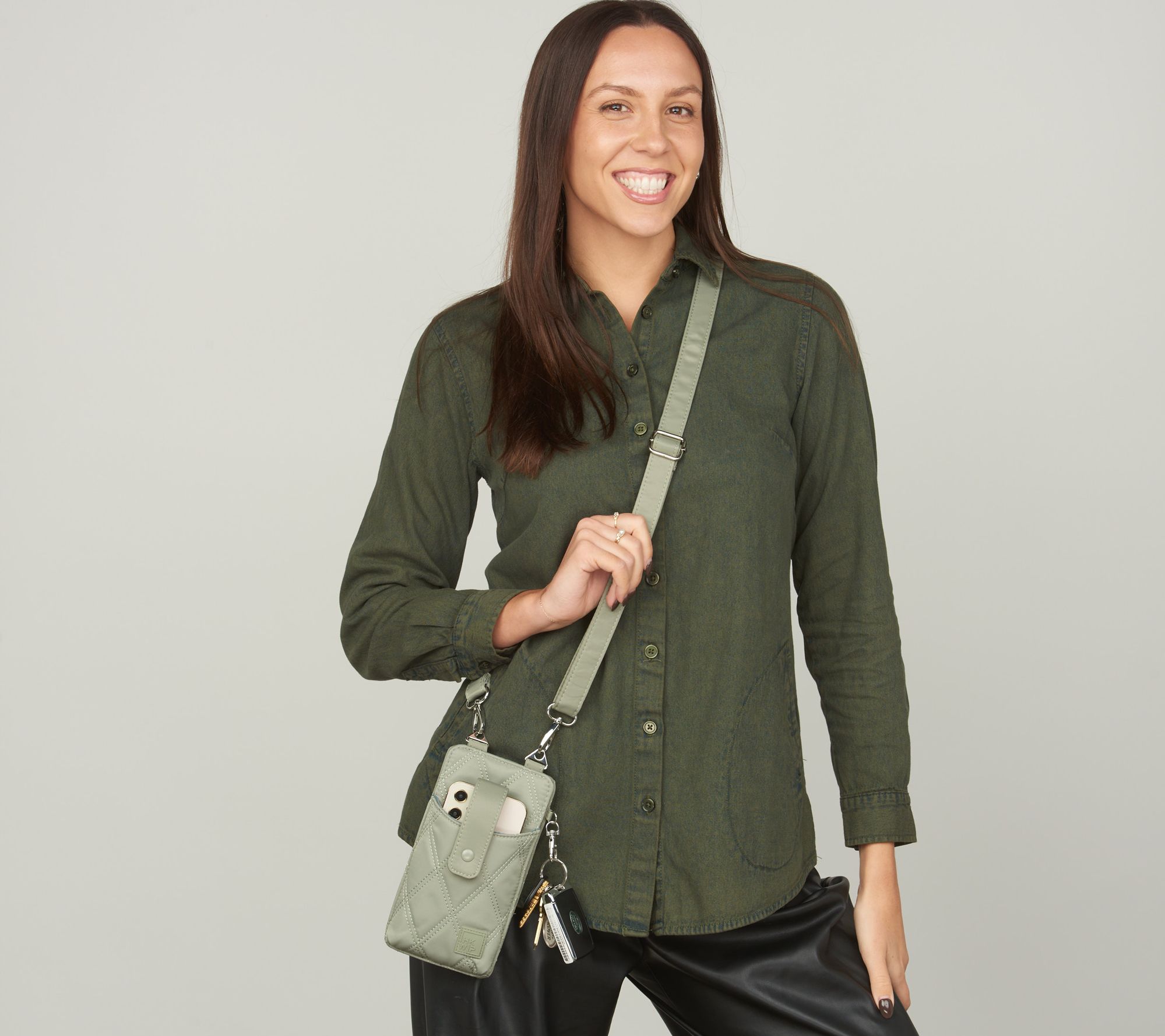 • Water-repellent exterior, soft-lined main cellphone pocket with adjustable elastic snap closure, removable/adjustable crossbody strap, gift tag